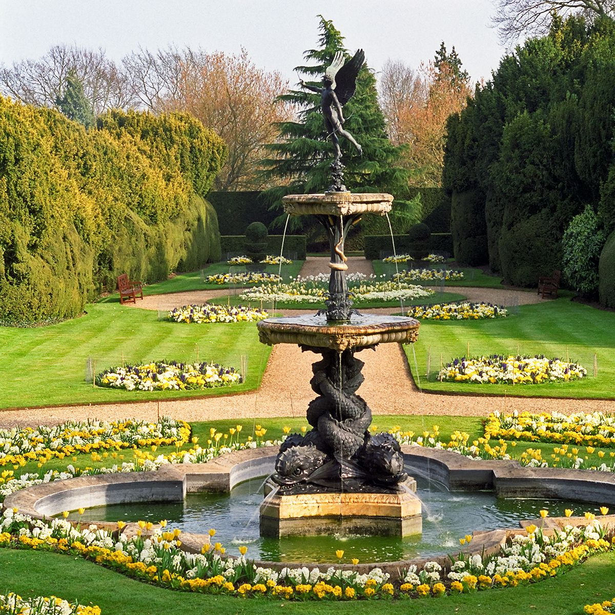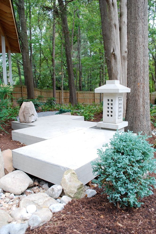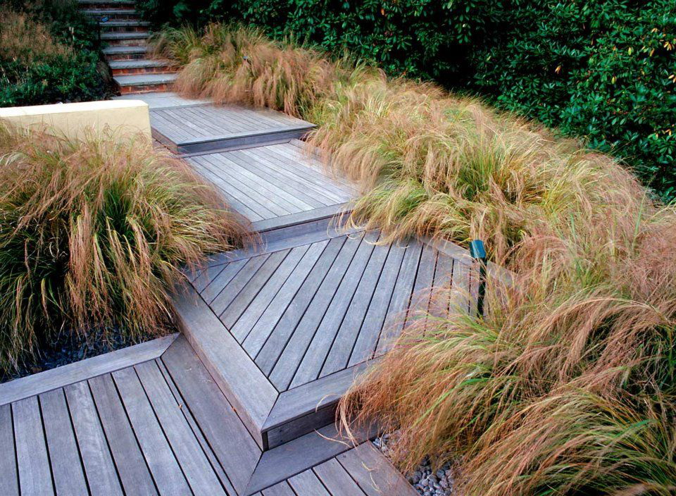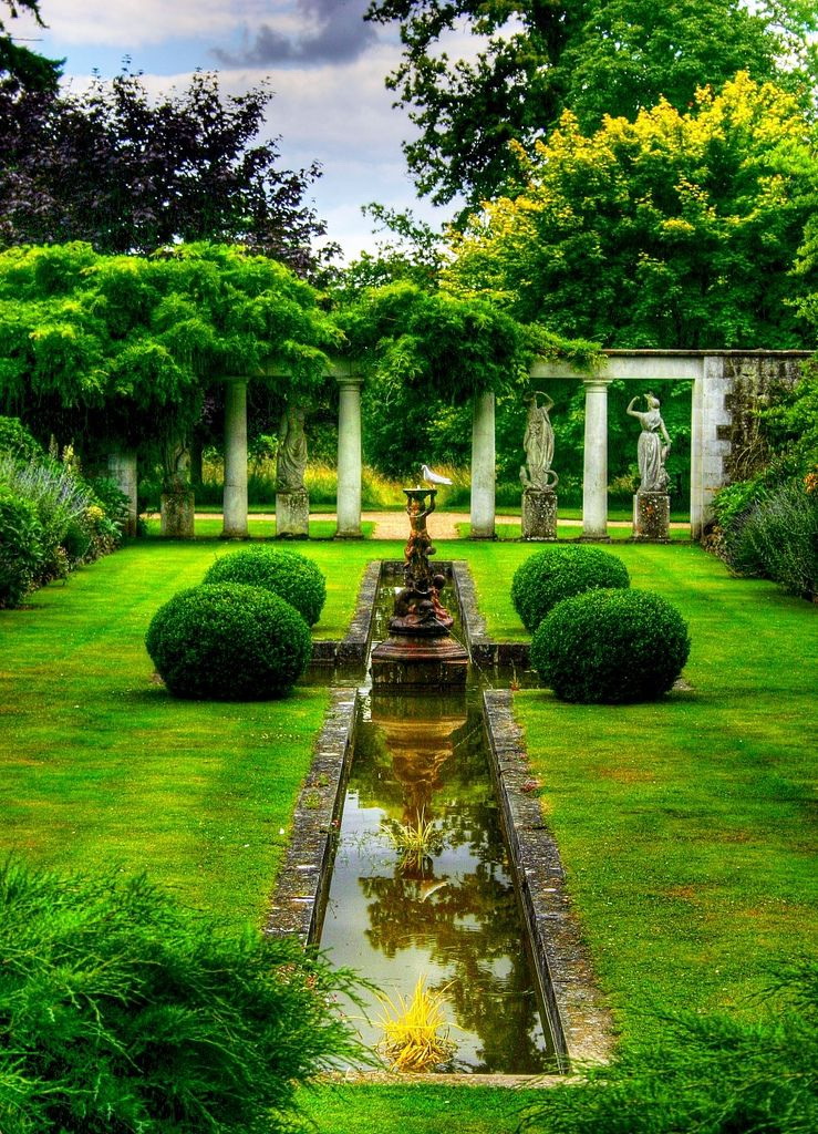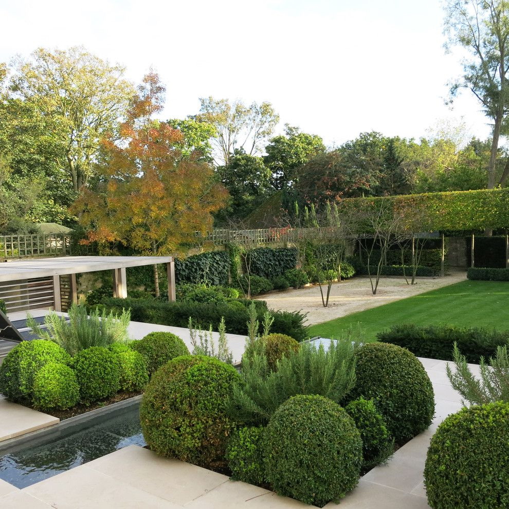 Pinheiros, aparados em uma forma triangular, criam interesse visual. Anuários, plantas perenes fornecem o jardim com cores brilhantes e formas interessantes. Aqui, o gladíolo claramente contrasta com a folhagem e flores ao redor deles. Listras coloridas grandes criarão uma atmosfera relaxante para este jardim.