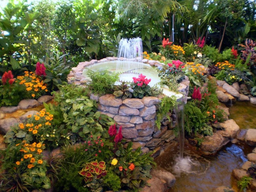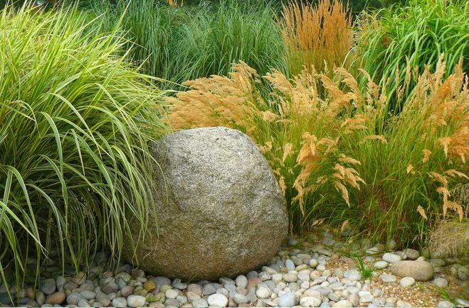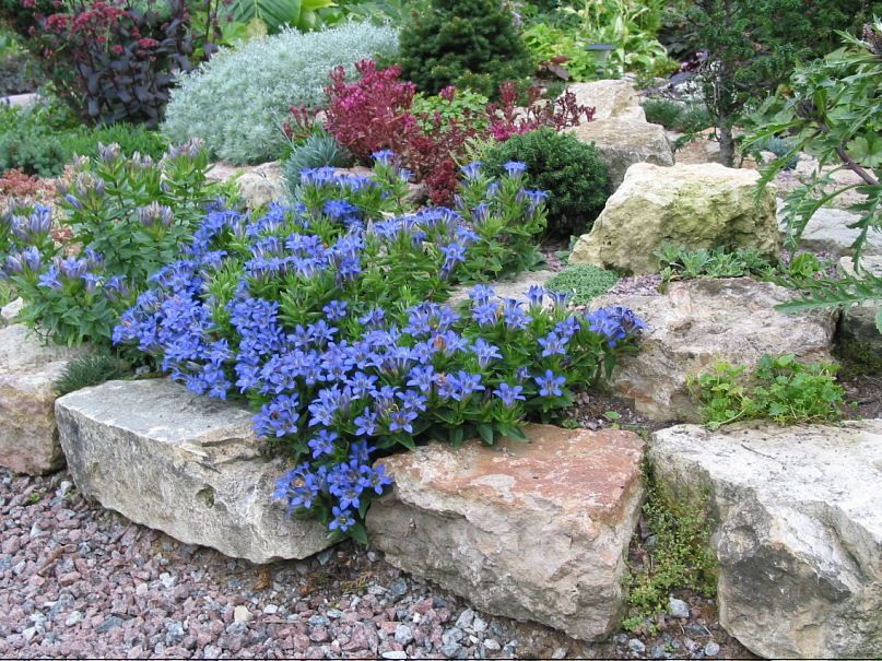 No centro do canteiro de flores você pode colocar um lago artificial decorado com pedras naturais e vegetação costeira.