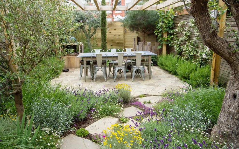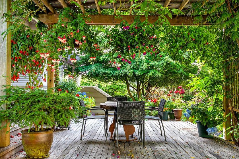 Para esta ideia, você deve ter muitas plantas diferentes. Você pode instalar este projeto em um lado separado do jardim e colocar várias cadeiras e uma mesa para que o canteiro pareça a atmosfera perfeita para a privacidade.