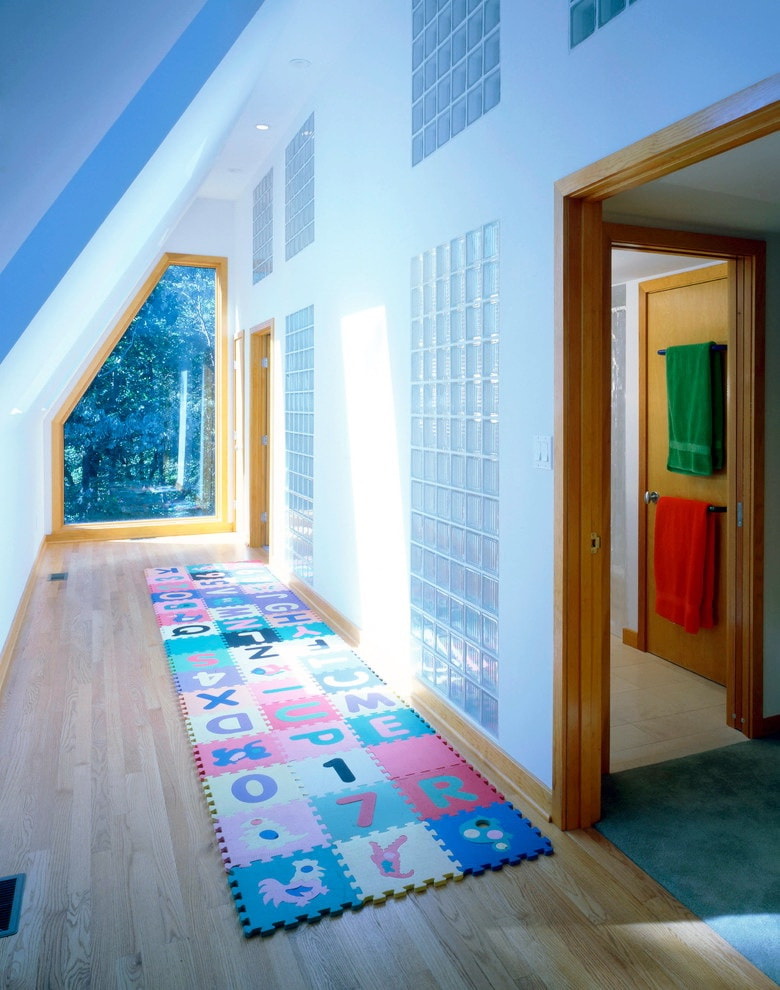 - Passarela multicolorida. Para estimular uma criança a engatinhar, uma ideia interessante seria construir uma passarela colorida que vai de uma sala a outra. Na sua superfície, você pode colocar brinquedos diferentes, incluindo bolas, chocalhos.