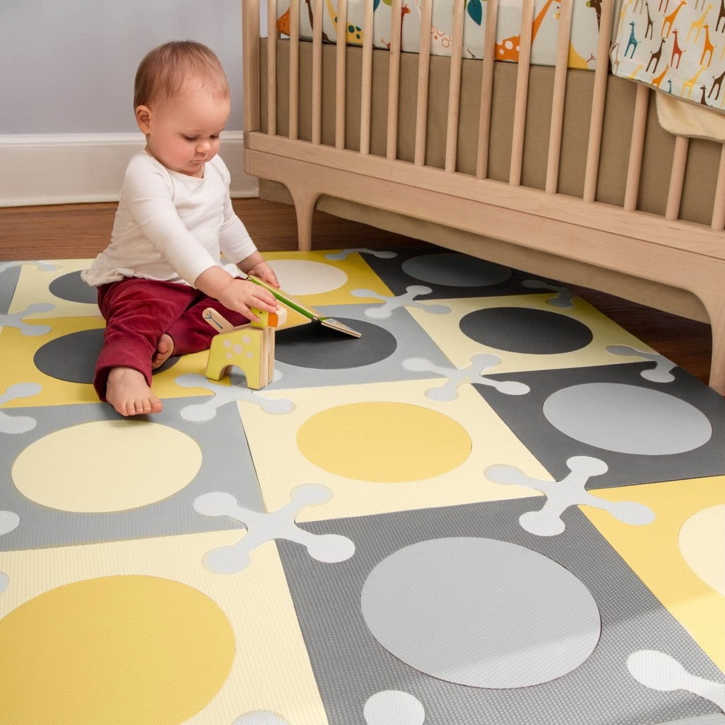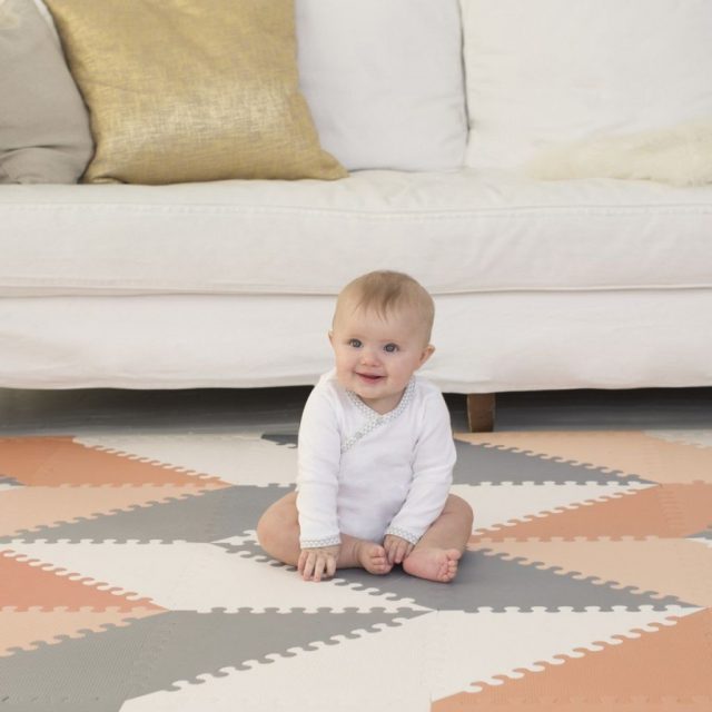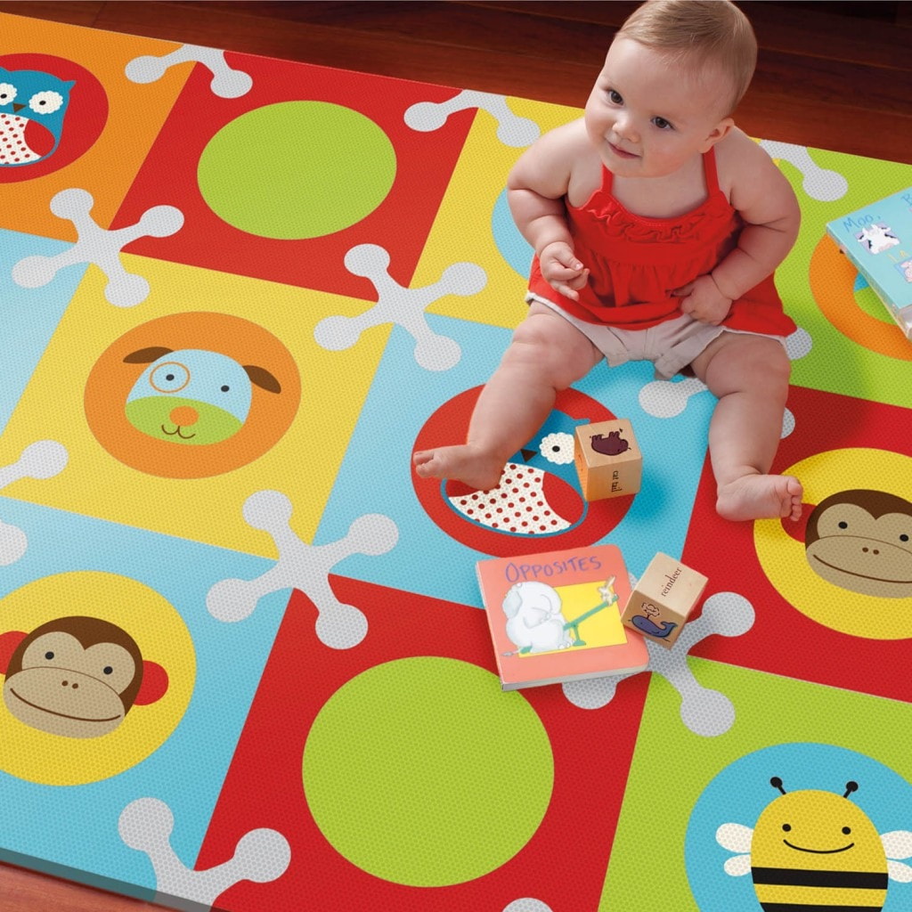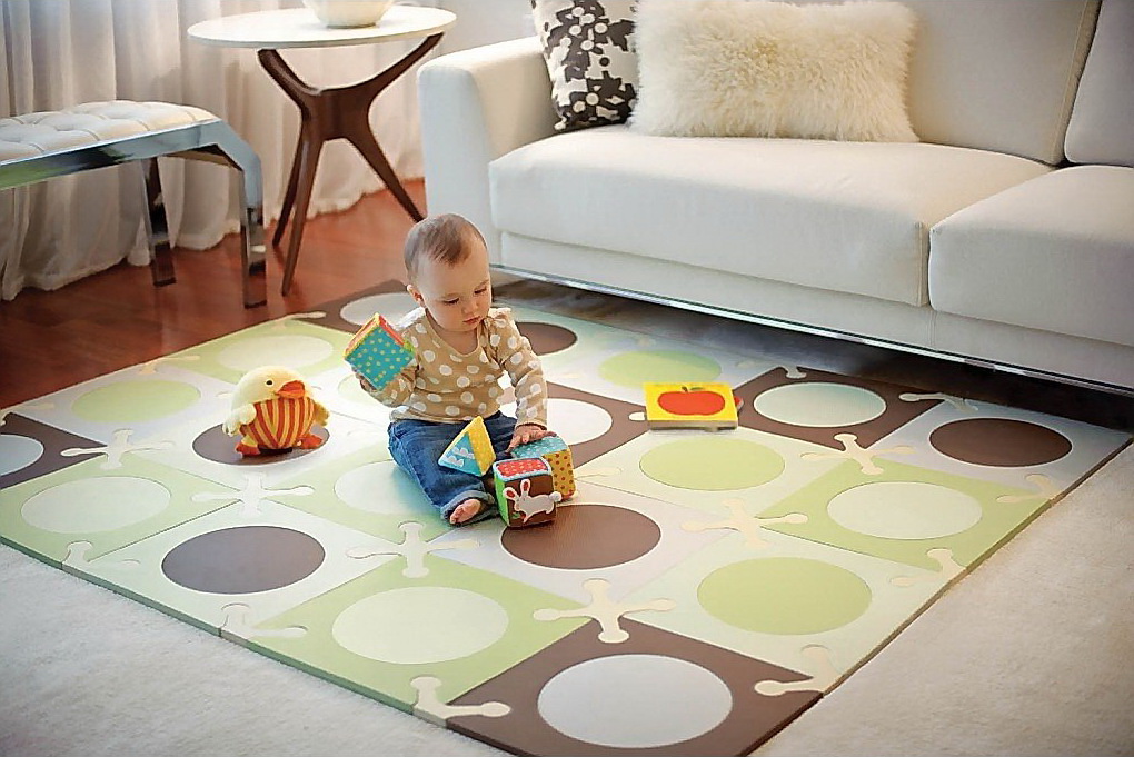 - Skip hop. Este é um tapete confortável e grande que é adequado para jogar, primeiros passos ou engatinhar uma criança. É feito de EVA, absorve bem choques se o bebê cair. O material inovador não emite odores desagradáveis e pontiagudos, não contém bifenol A, formamida e ftalatos. Peças individuais podem ser livremente preenchidas, selecionadas por tonalidades, conectando a imaginação e explorando as propriedades das figuras. Você pode criar ornamentos geométricos originais (diamantes, quadrados e círculos) de diferentes elementos. Se necessário, colete algumas peças, reduzindo o tamanho da superfície ou compondo várias liteiras.