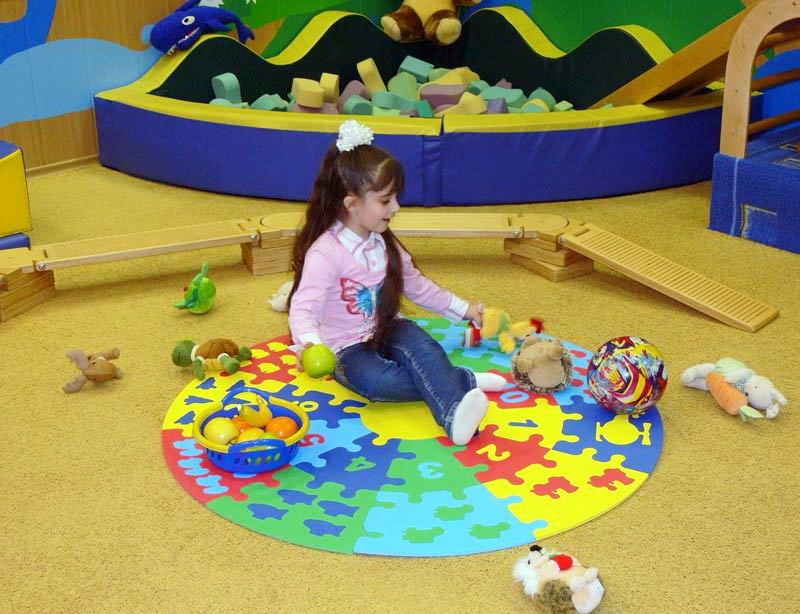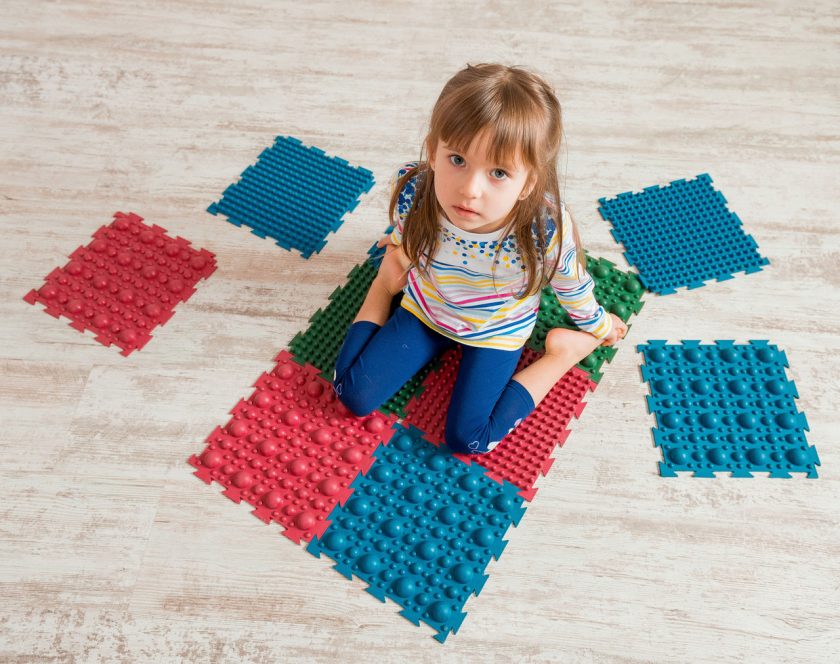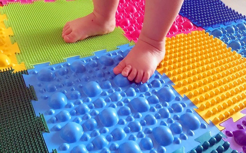 - O piso de massagem é representado por quebra-cabeças suaves com diferentes tipos de texturas (entalhes, ranhuras, tubérculos de várias formas, uma combinação de seções moles e duras). O revestimento ajudará na prevenção de flatfoot, o desenvolvimento do aparelho muscular-ligamentar.