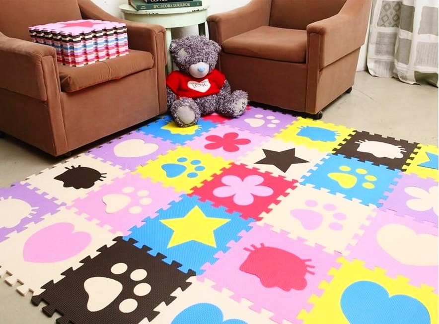 Puzzles brilhantes serão um excelente complemento para o interior do quarto das crianças. E se escolher blocos com um efeito de massagem, então o fornecimento de sangue para as pernas melhorará, a prevenção de pé chato será executada.