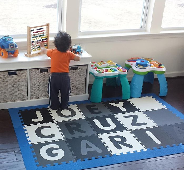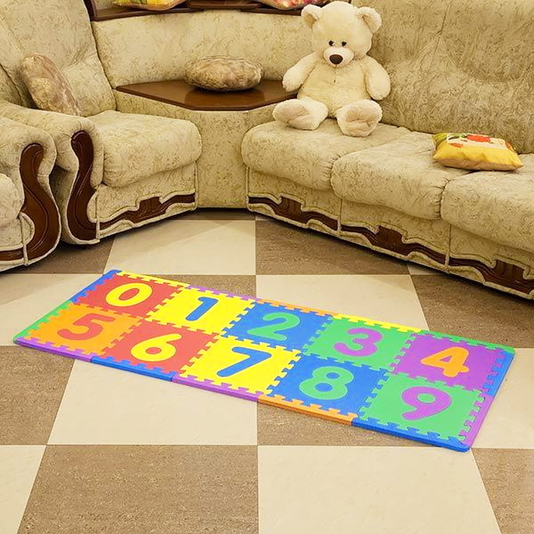 - Variantes com números, letras do alfabeto inglês ou russo. A escolha do piso macio é feita de acordo com a idade do bebê e o design da sala. Essa abordagem permitirá dividir a base em campos separados, combinando conjuntos de séries diferentes. Você pode escolher o piso, descrevendo sinais de trânsito, mapas geográficos com países e cidades. As crianças podem memorizar facilmente imagens com letras, palavras e números. Com o desenvolvimento e determinação de habilidades de fala em crianças, um pensamento desenvolvido é formado, o que é conseguido com um jogo divertido.