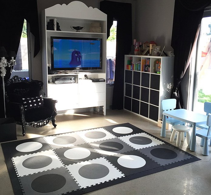 Além de decorar a sala, o piso torna-se o tema de um jogo fascinante e em desenvolvimento.Depois de desembalar a mercadoria, criamos um grande tapete fora dela. A criança percebe tal jogo com entusiasmo, ganha um novo lugar para realizar jogos. Mas é moda usá-lo para outros fins: