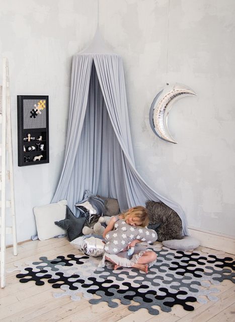 Modelo de decoração interior no berçário, adequado para bebês com idade superior a 10 meses. O custo de elementos de 1,4 * 1,0 m começa a partir de 5 mil rublos.