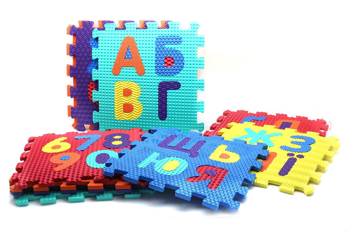 - Estudar objetos, formas, números e letras. O produto com a imagem de números, letras servirá como um material isolante confortável, bem como um material visual interessante para familiarizar a criança mais nova com números e formas geométricas. O treinamento será divertido e acessível. Disponível em modelos com inserções de quadro. Em cada quadrado existem figuras que podem ser retiradas e reinseridas.