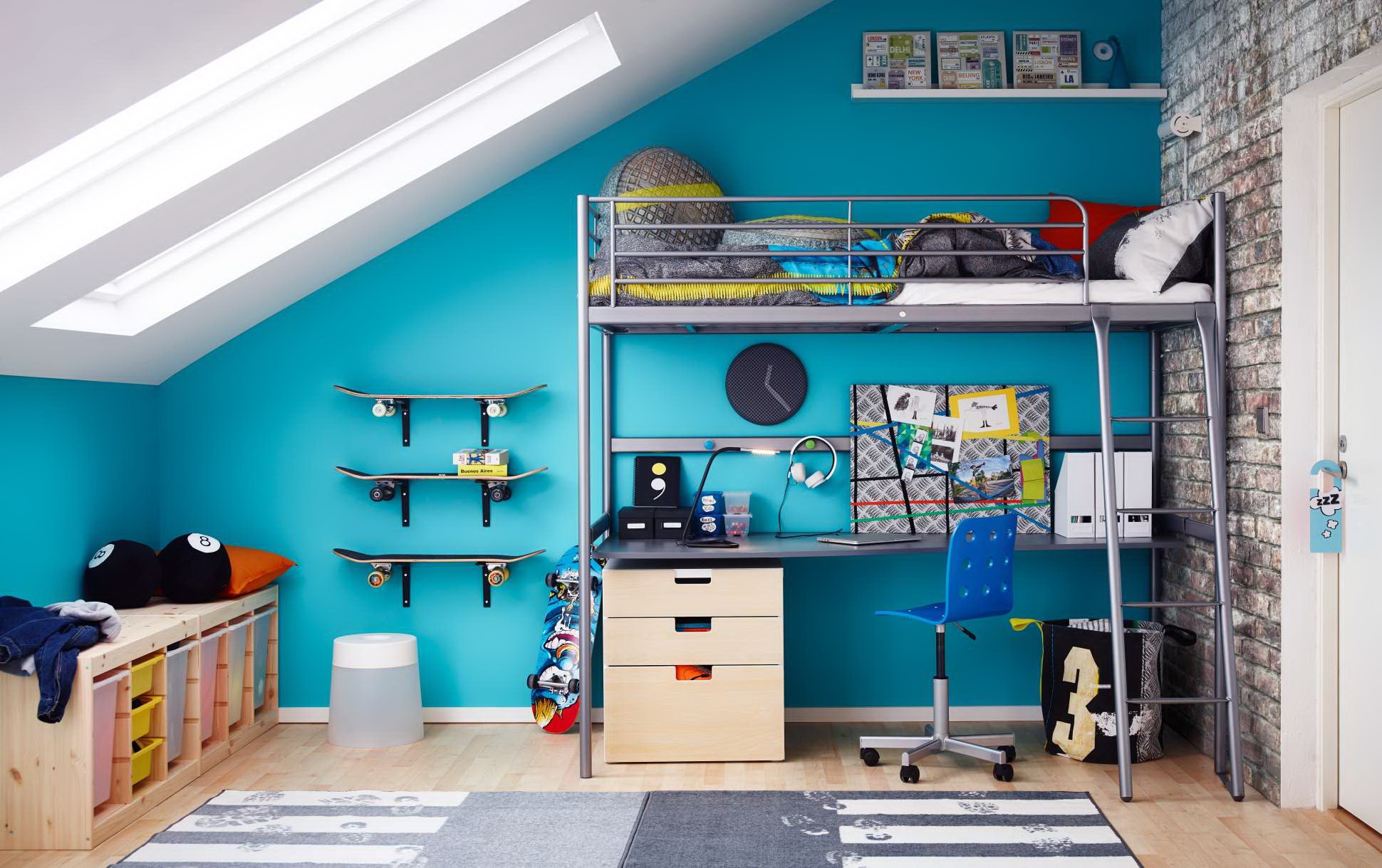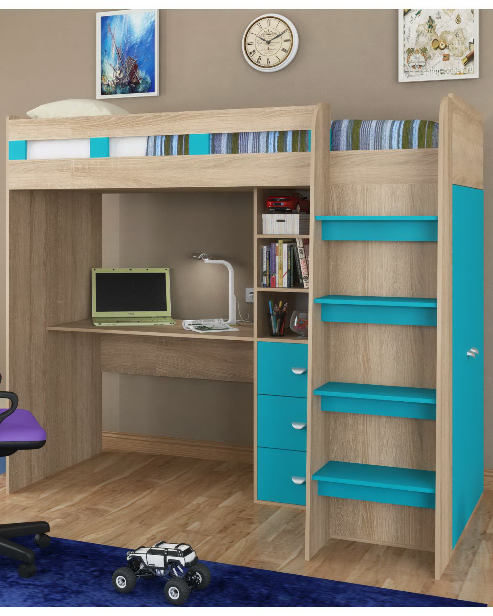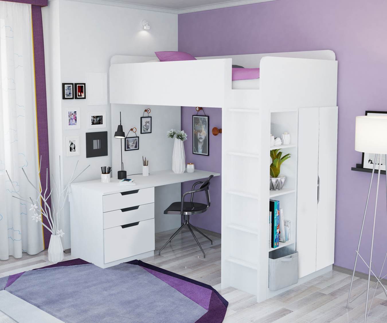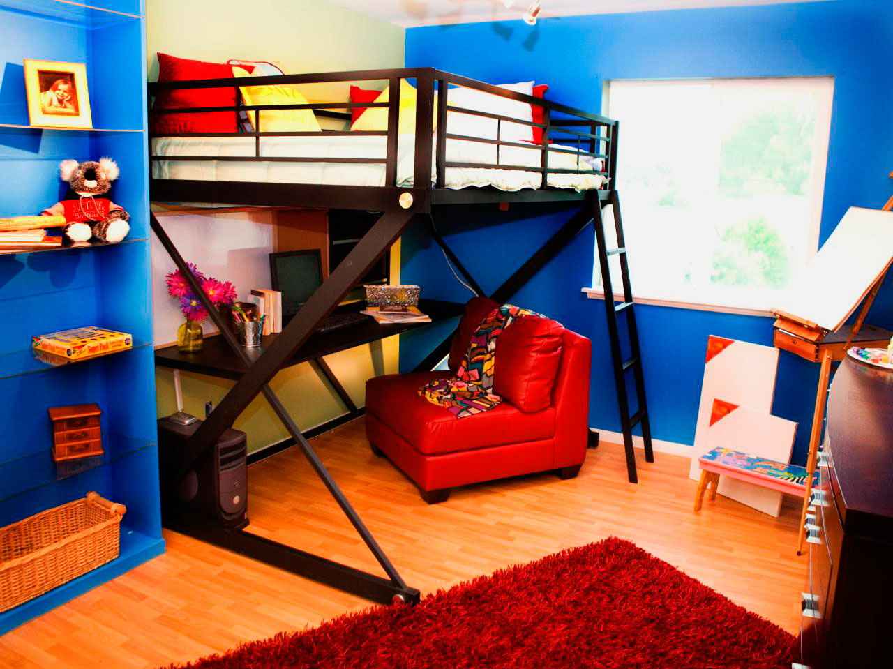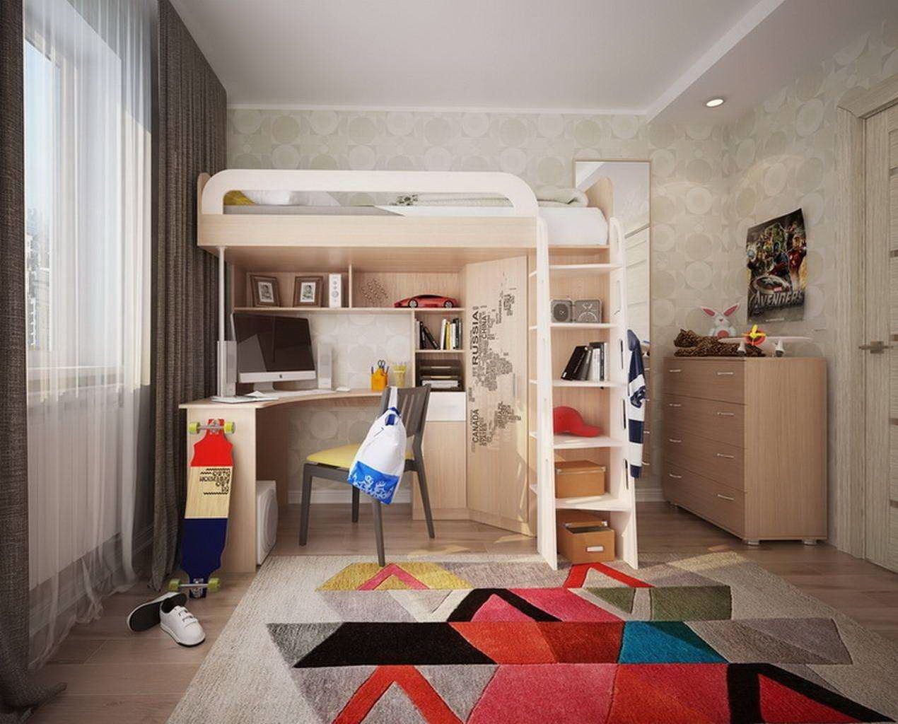 Um adolescente em idade de transição precisa especialmente de reclusão periódica. O território alocado permitirá que ele cuide de seus negócios silenciosamente em seu próprio canto aconchegante. Essa cama alta deve ter prateleiras e gavetas suficientes para a organização racional do espaço.