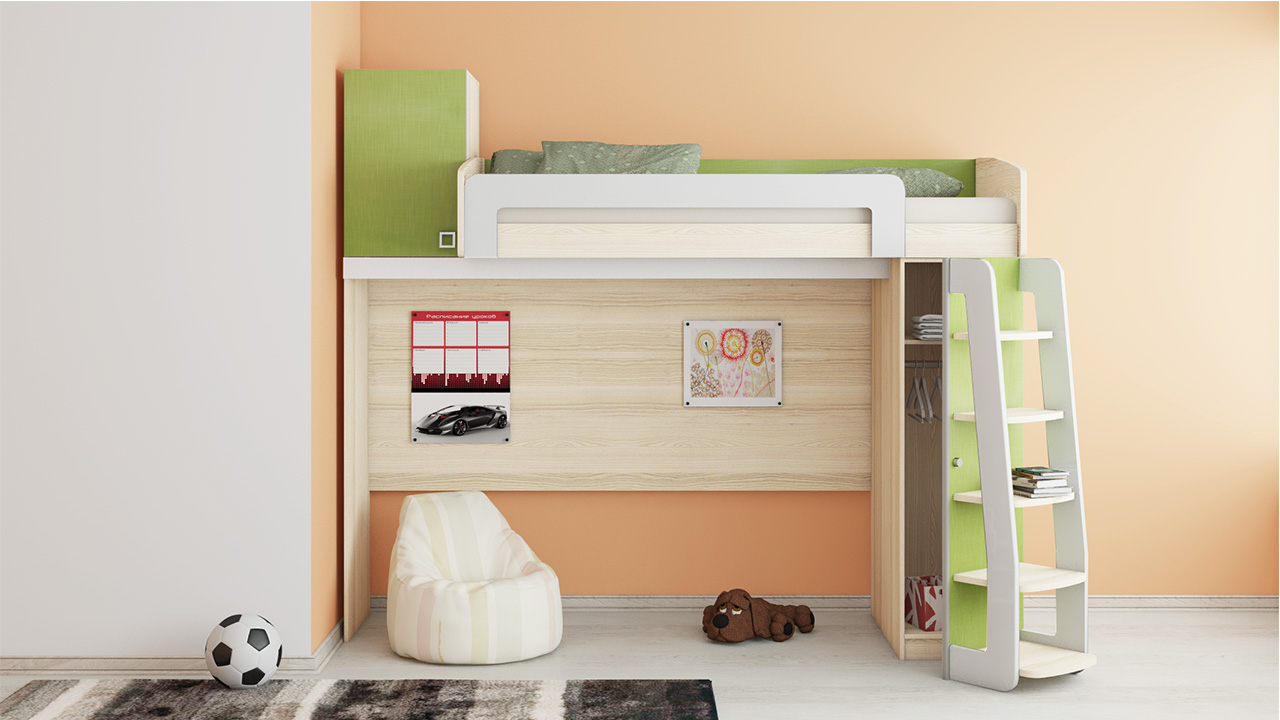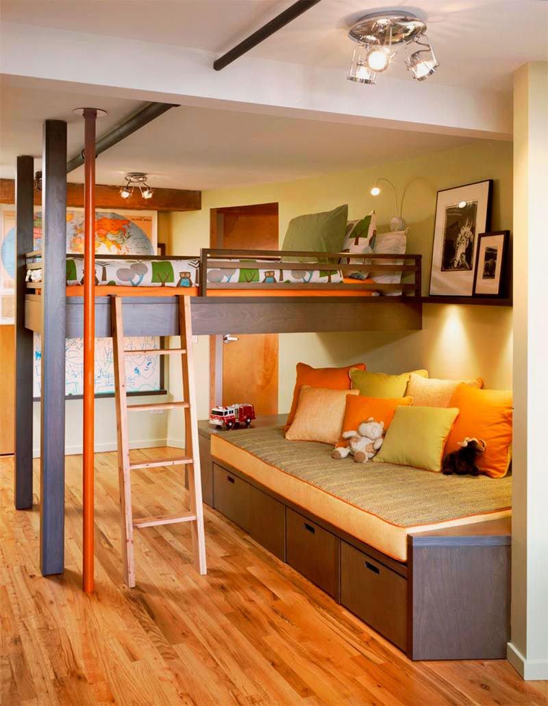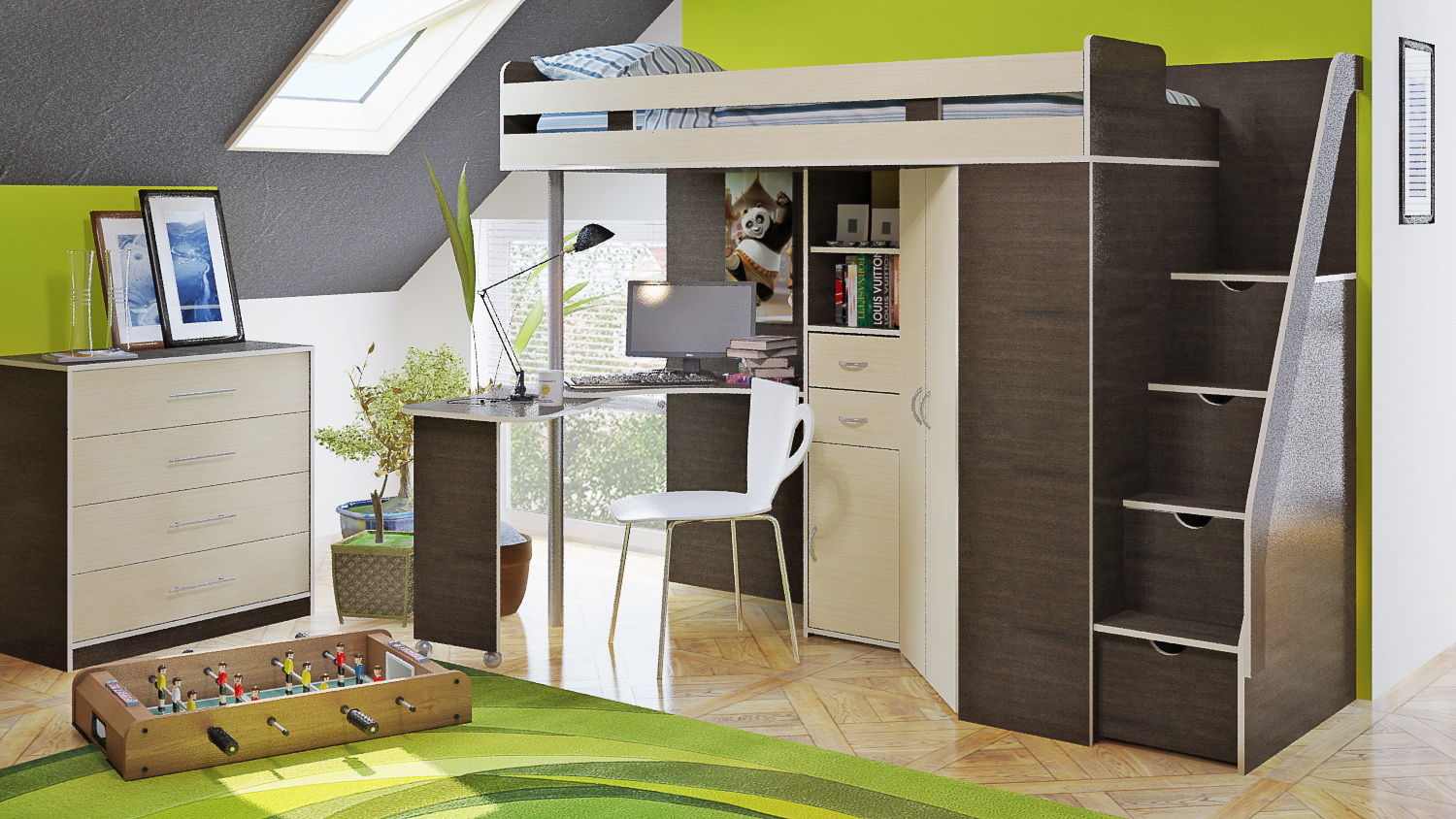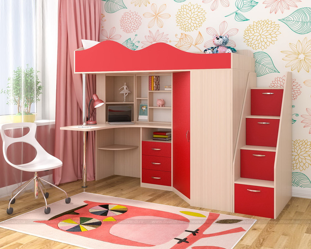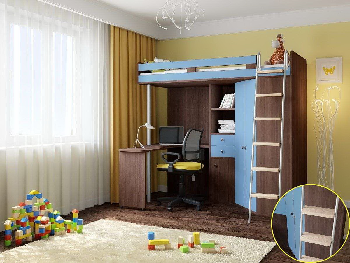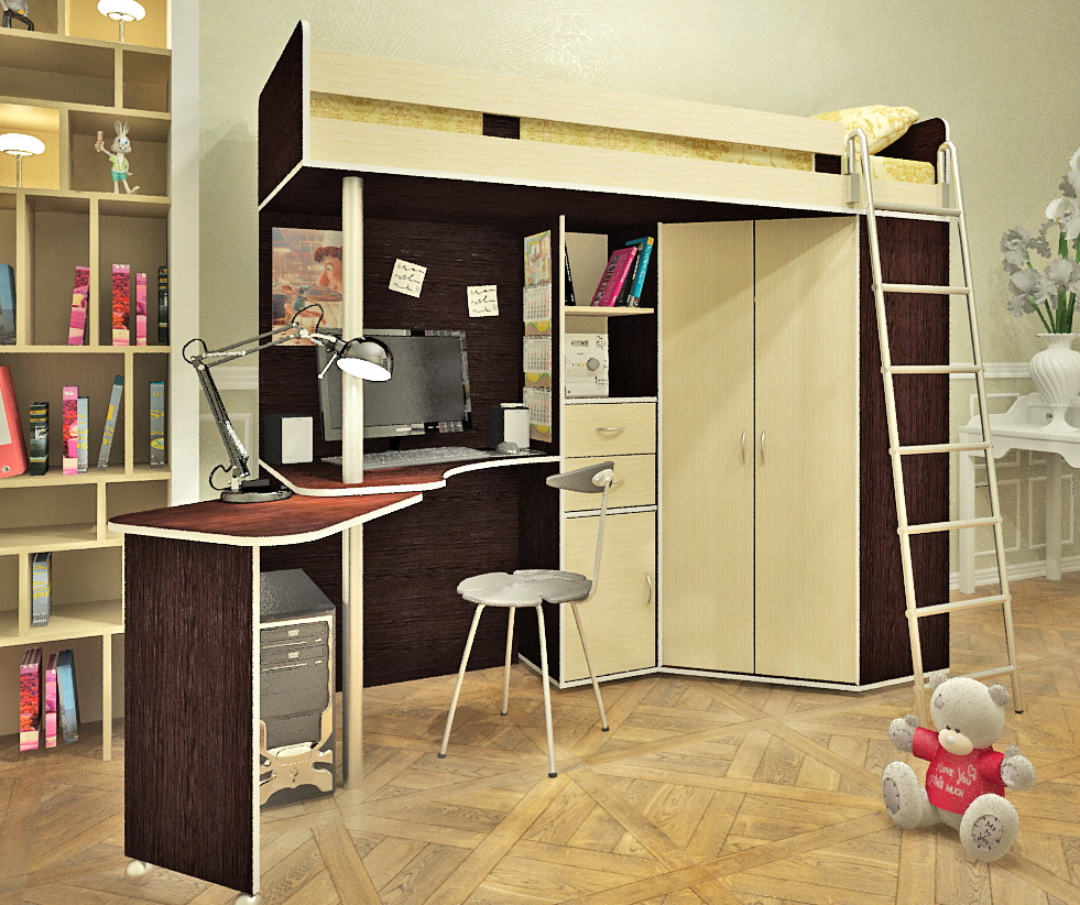 Na sua parte inferior, como de costume, há uma zona de trabalho ou um sofá dobrável para um dia de descanso. Armários ou prateleiras, bem como no caso de mobiliário infantil, estão equipados com extremidades. As escadas podem ser posicionadas estritamente na vertical ou executadas como uma combinação de gavetas, postes de amarração ou pódios.
