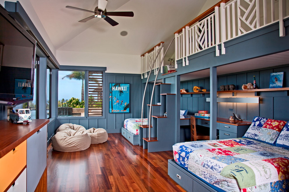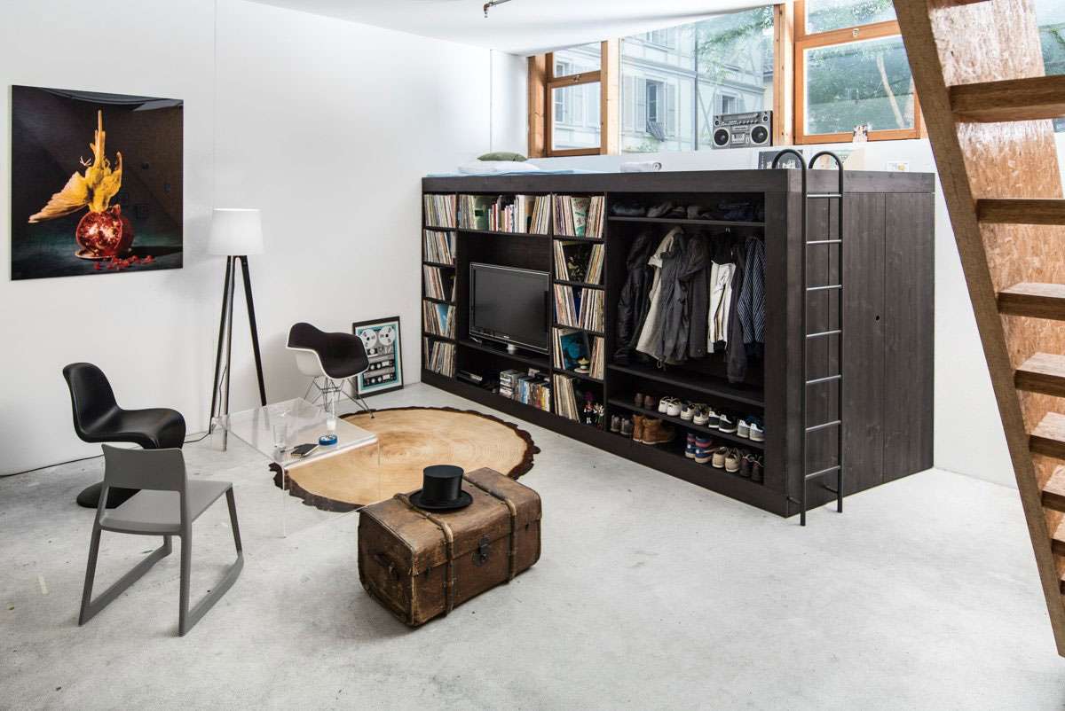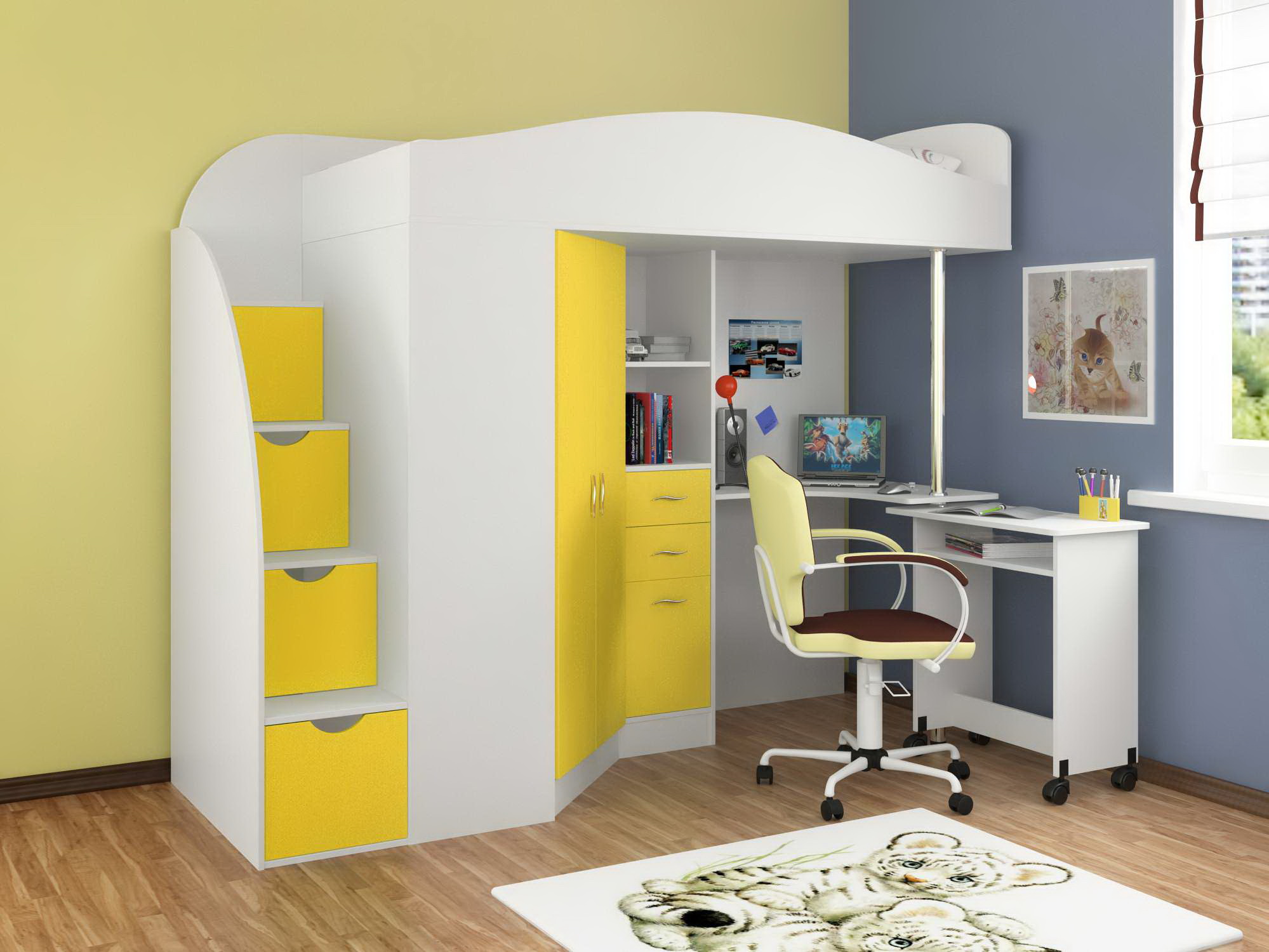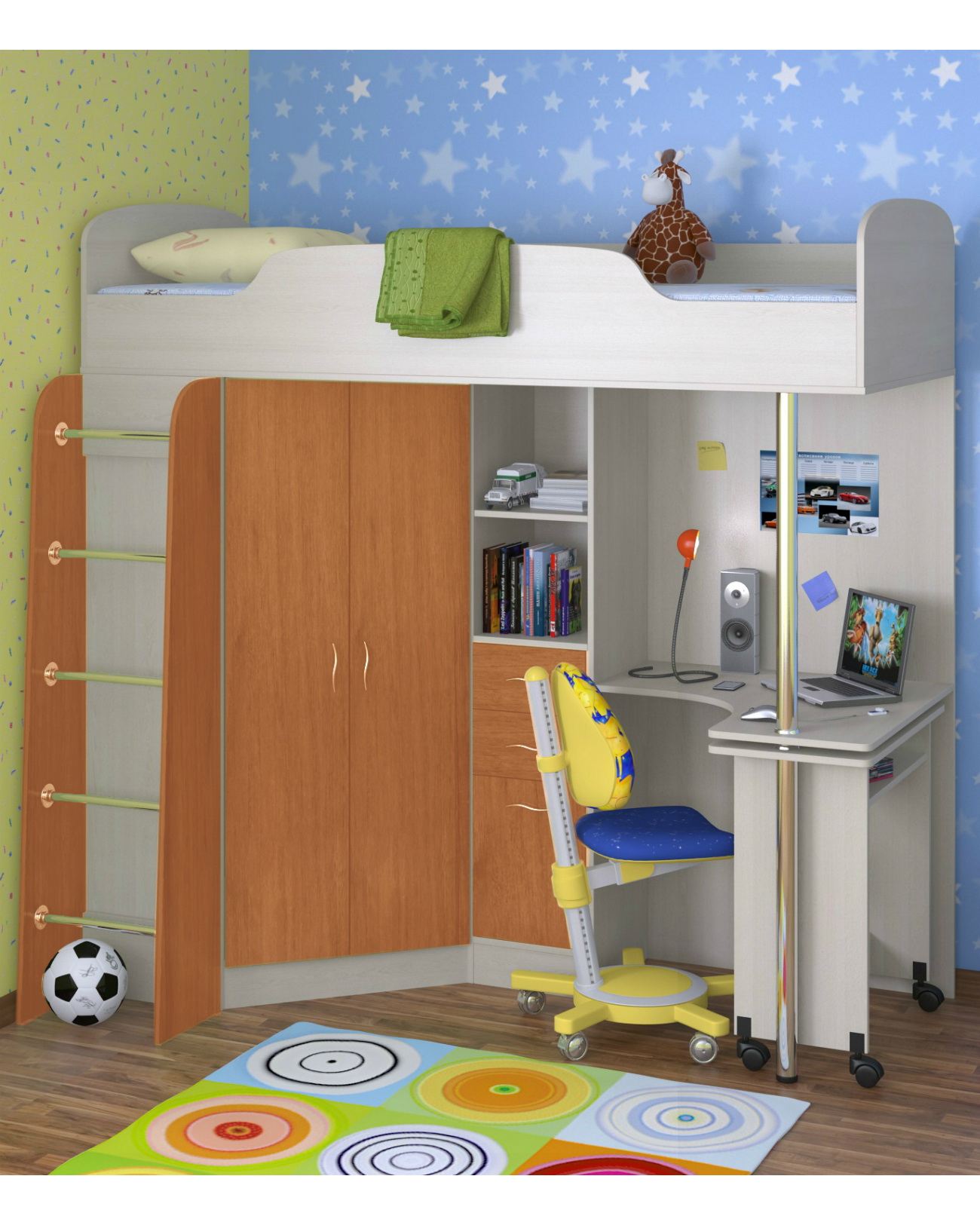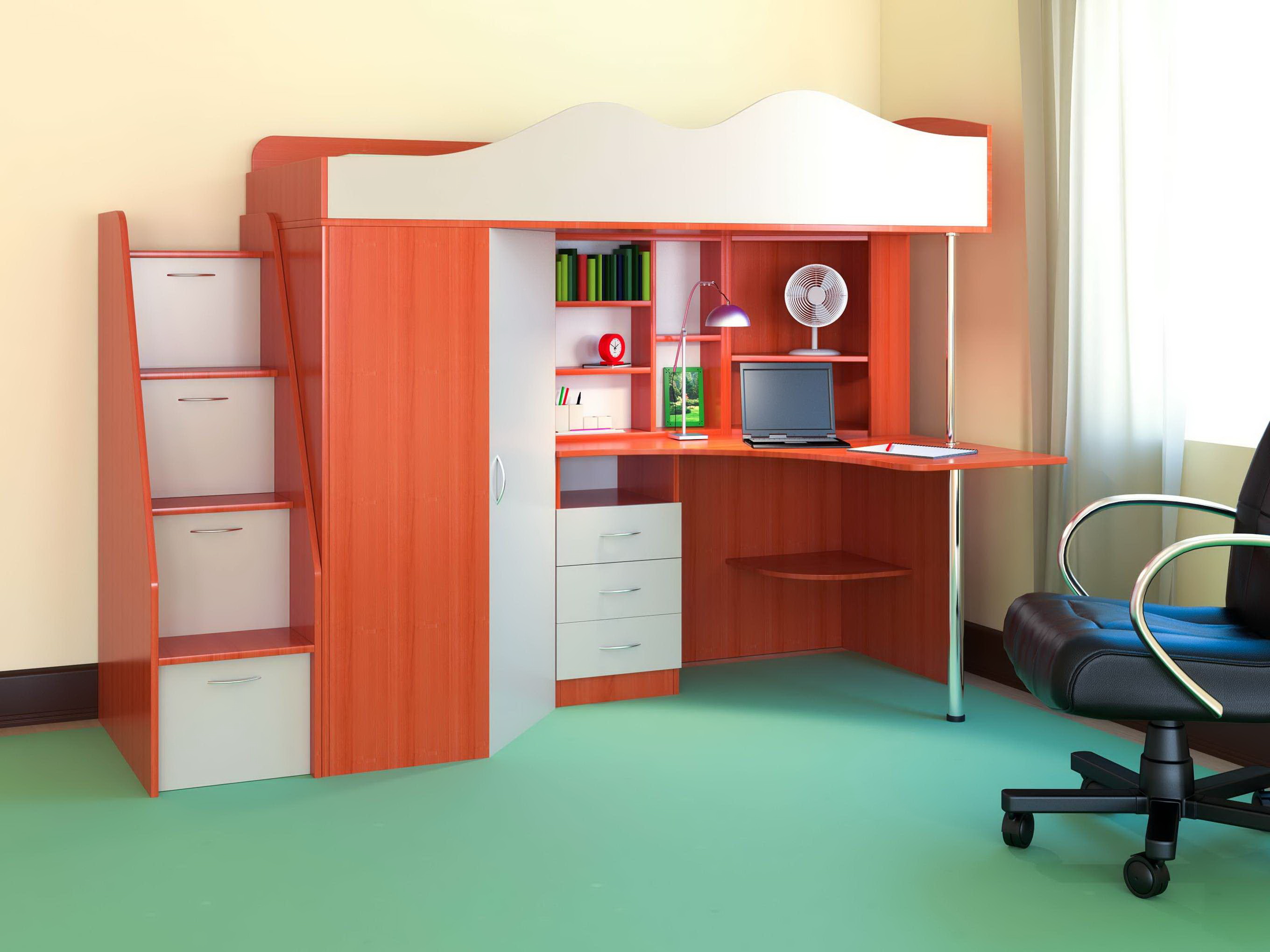 Na sua parte inferior, como de costume, há uma zona de trabalho ou um sofá dobrável para um dia de descanso. Armários ou prateleiras, bem como no caso de mobiliário infantil, estão equipados com extremidades. As escadas podem ser posicionadas estritamente na vertical ou executadas como uma combinação de gavetas, postes de amarração ou pódios.