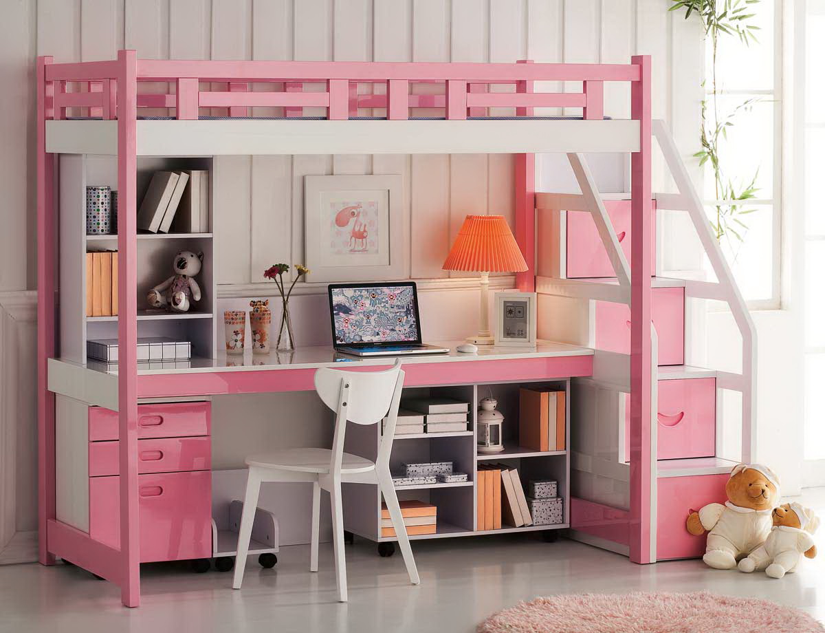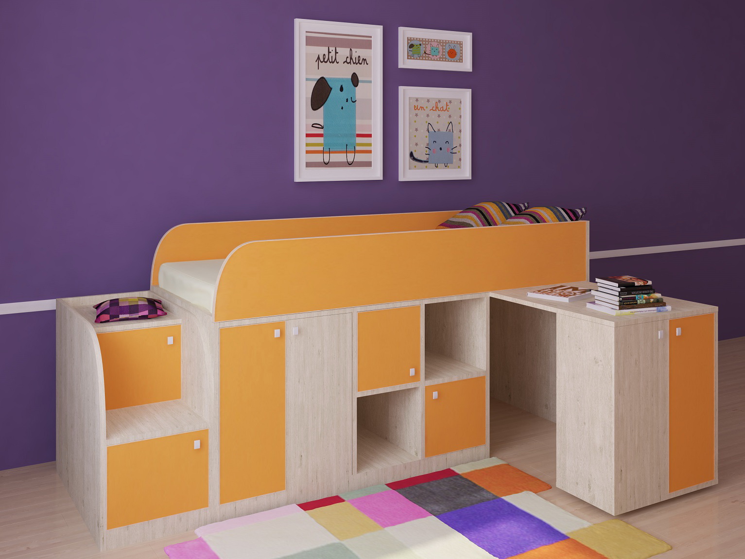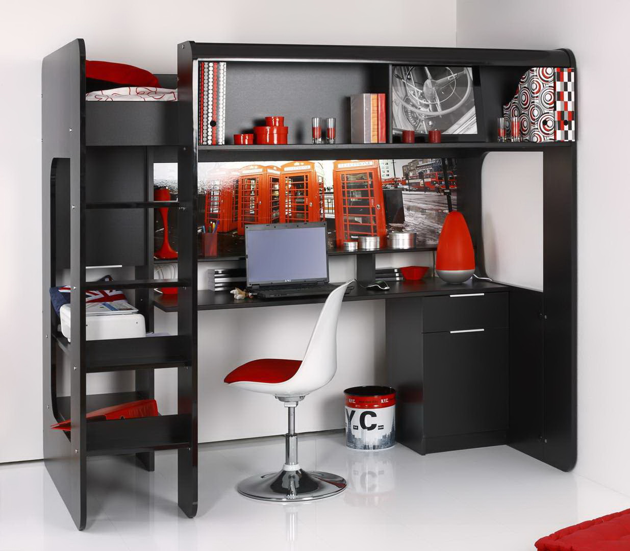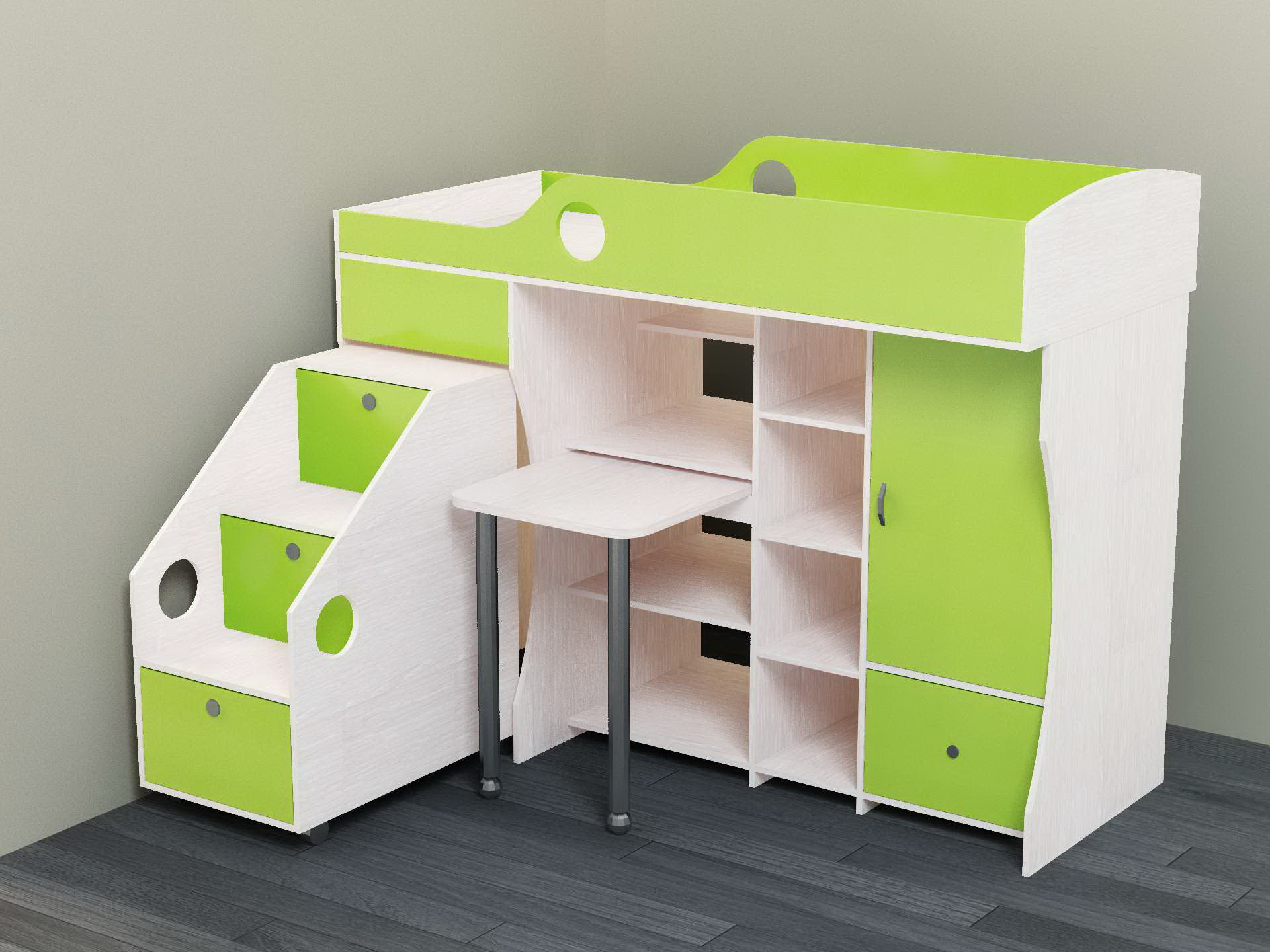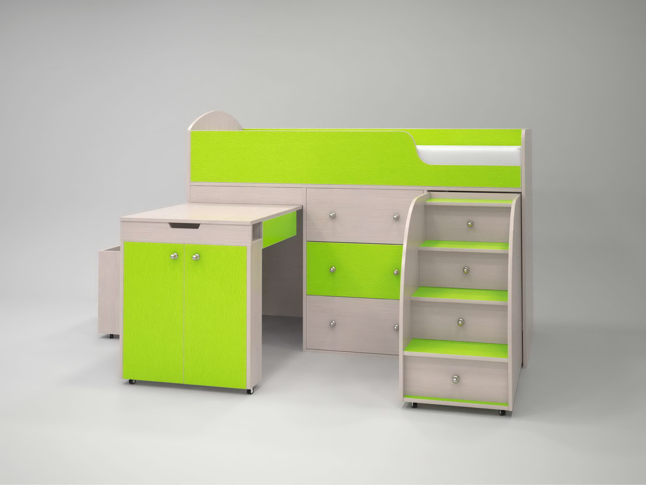 Na sua parte inferior, como de costume, há uma zona de trabalho ou um sofá dobrável para um dia de descanso. Armários ou prateleiras, bem como no caso de mobiliário infantil, estão equipados com extremidades. As escadas podem ser posicionadas estritamente na vertical ou executadas como uma combinação de gavetas, postes de amarração ou pódios.