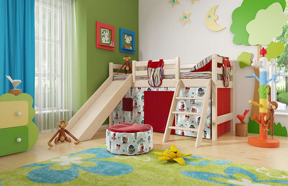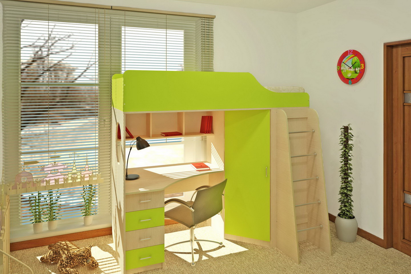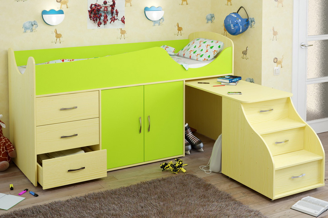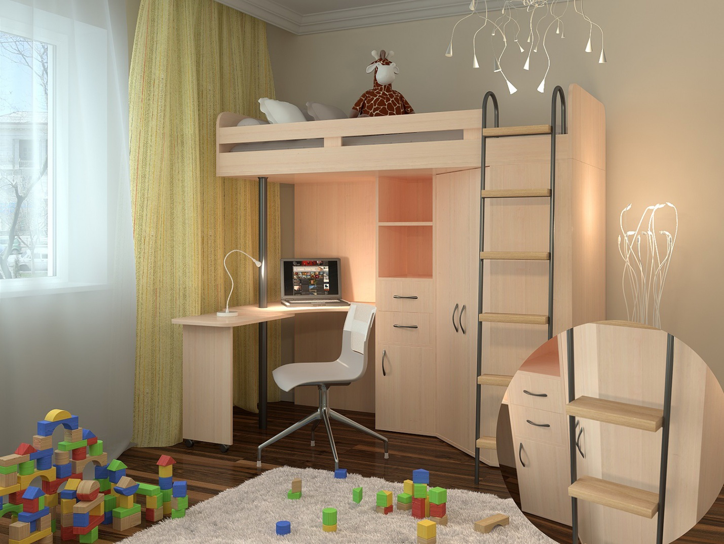 Mobiliário para crianças pode ter um design clássico ou uma forma estilizada na forma de um carro, um carro de bombeiros, uma locomotiva, um navio, uma cabana de pirata, um castelo ou uma casa. Para as meninas, as camas são feitas com uma cabeceira colorida feita de couro ecológico, tecido ou madeira esculpida.
