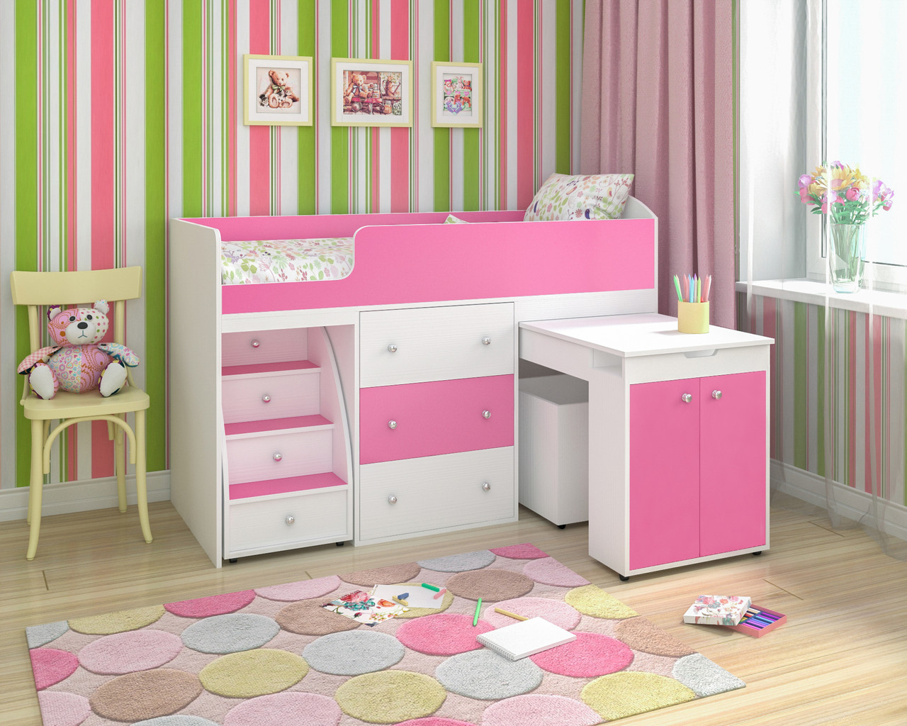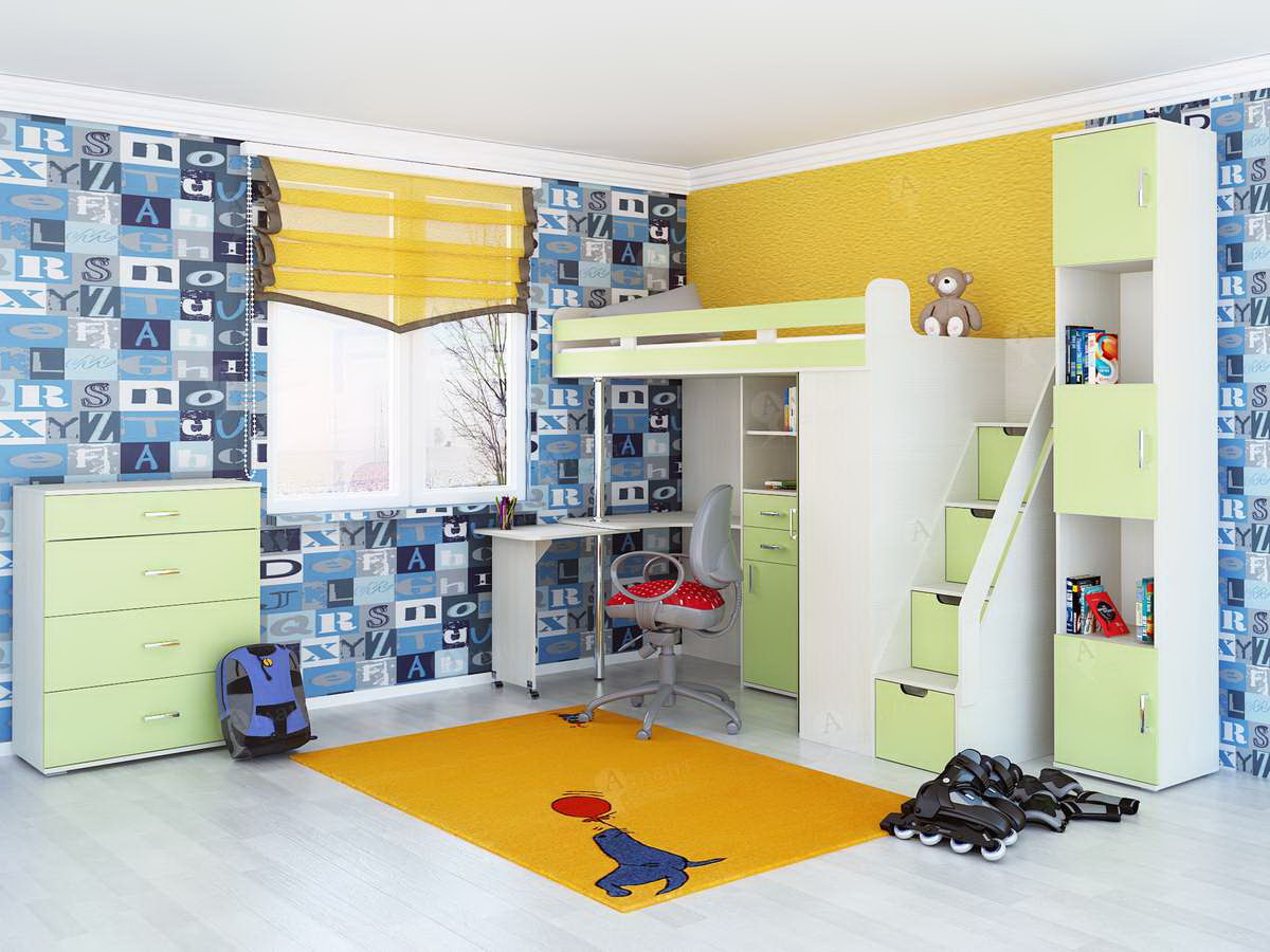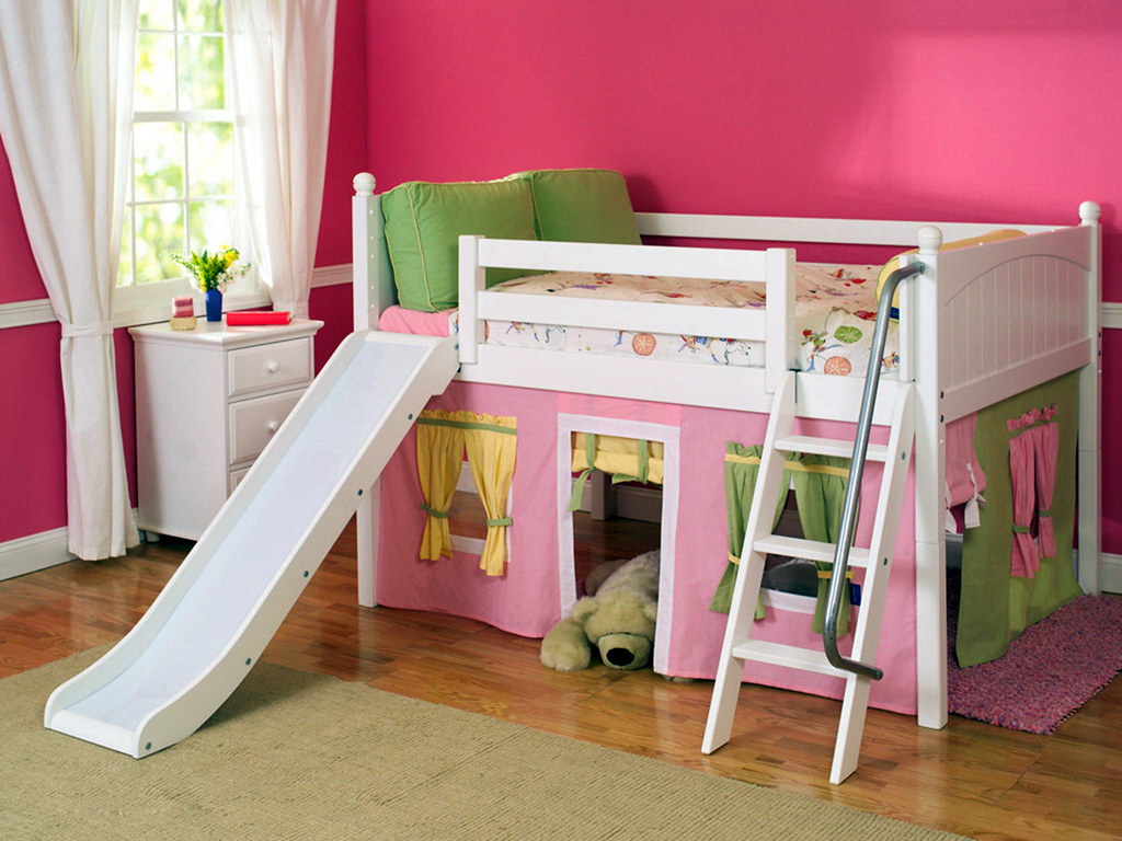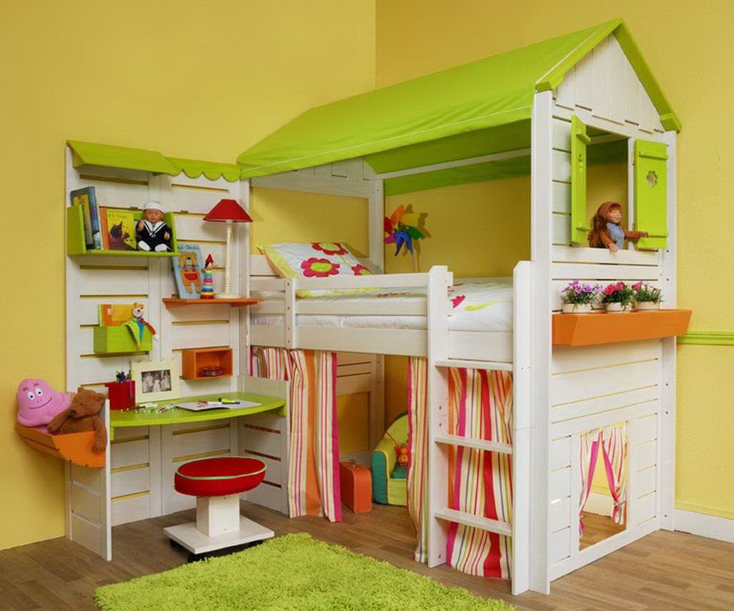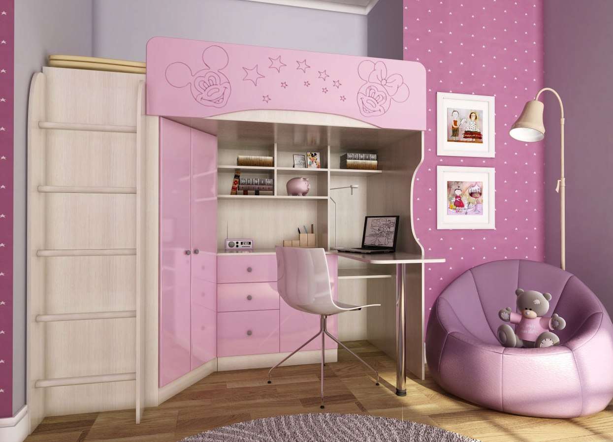 Mobiliário para crianças pode ter um design clássico ou uma forma estilizada na forma de um carro, um carro de bombeiros, uma locomotiva, um navio, uma cabana de pirata, um castelo ou uma casa. Para as meninas, as camas são feitas com uma cabeceira colorida feita de couro ecológico, tecido ou madeira esculpida.