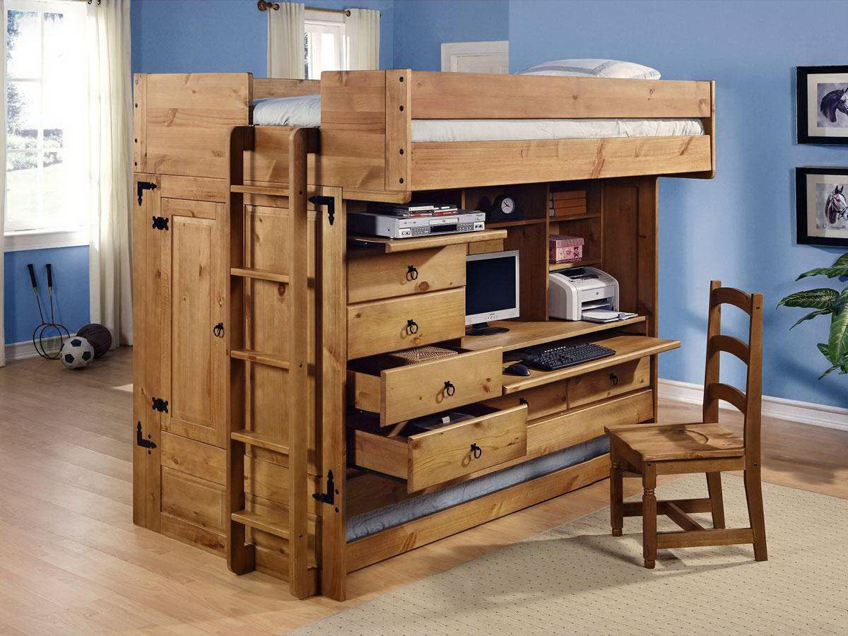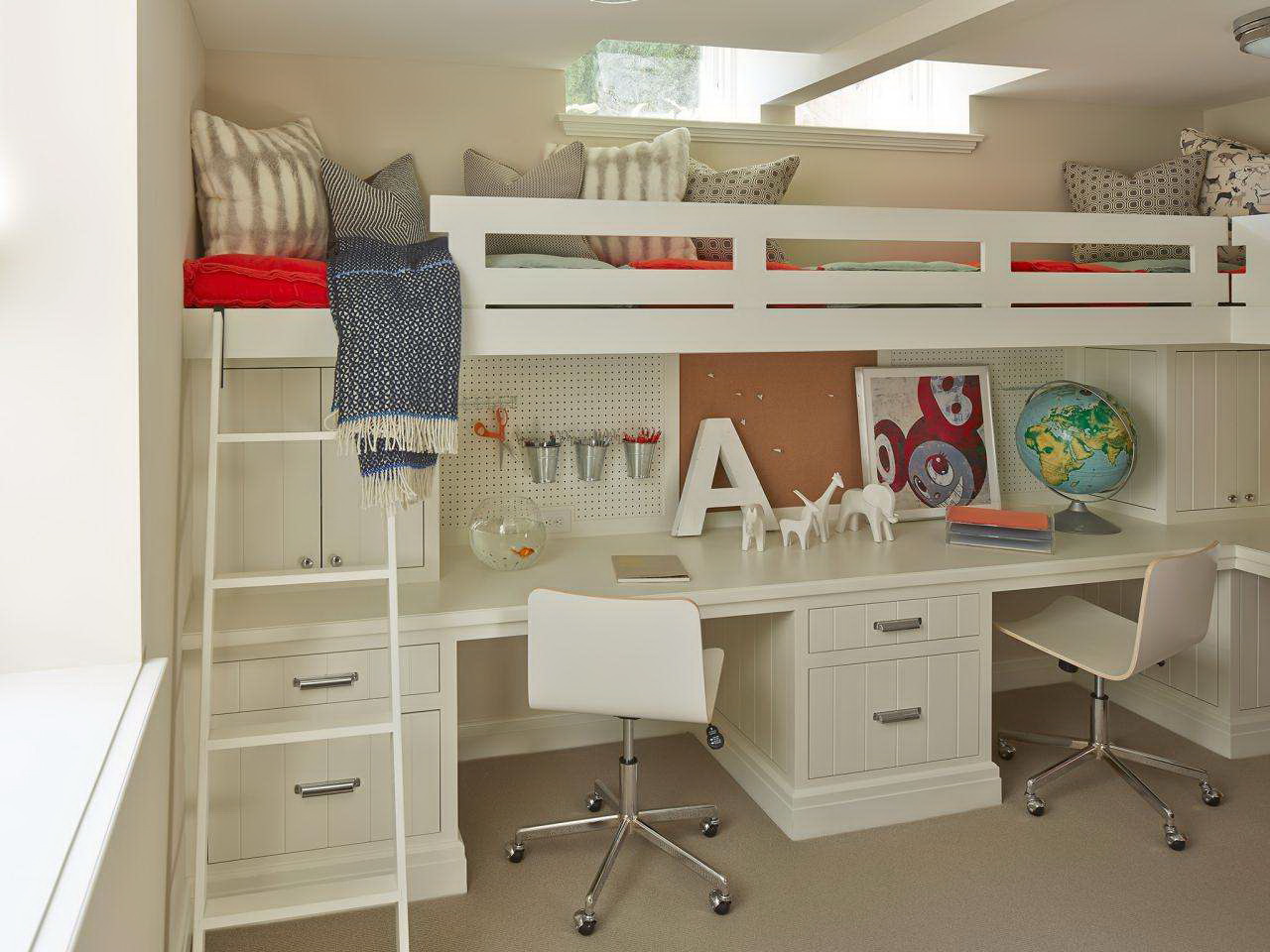 As camas para crianças e adolescentes estão equipadas não apenas com locais de trabalho, mas também com áreas de lazer e esportes. Para duas crianças, construções com duas camas de solteiro estão instaladas. Se houver três crianças na casa, você pode comprar uma cama alta, equipada, além das duas camas superiores, com uma parte inferior extraível.