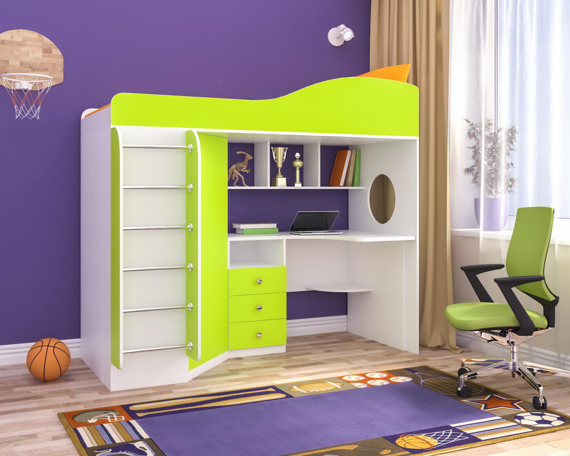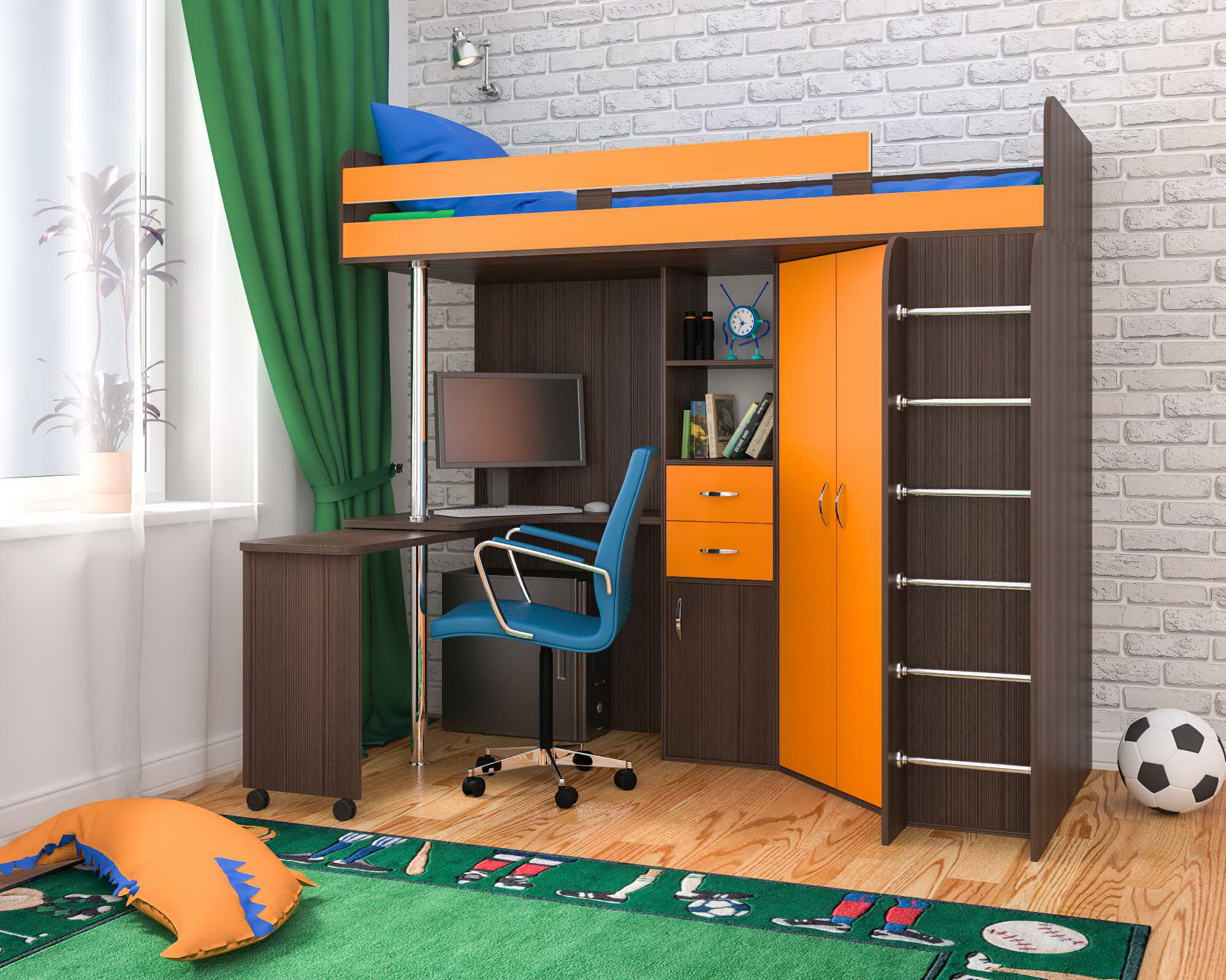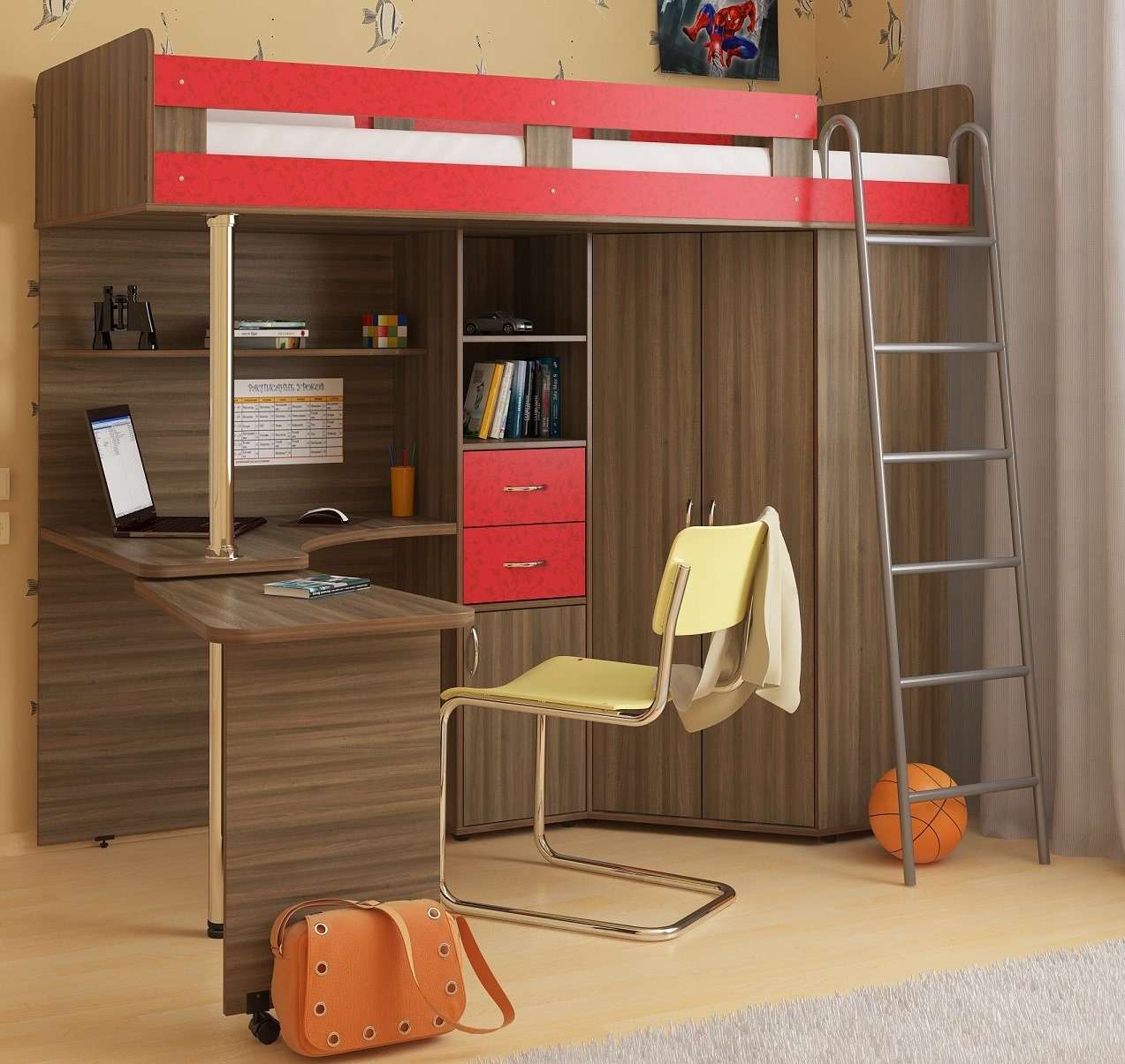 O conjunto padrão de cama alta com canto esportivo inclui barras de parede. Modelos de tamanhos grandes podem ter anéis de suspensão, escadas de corda, catracas e cordas. Camas no sótão para pré-escolares e estudantes mais jovens estão equipados com balanços de corda.