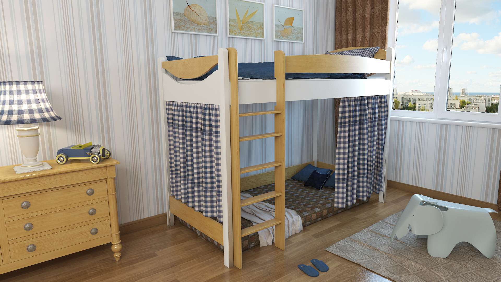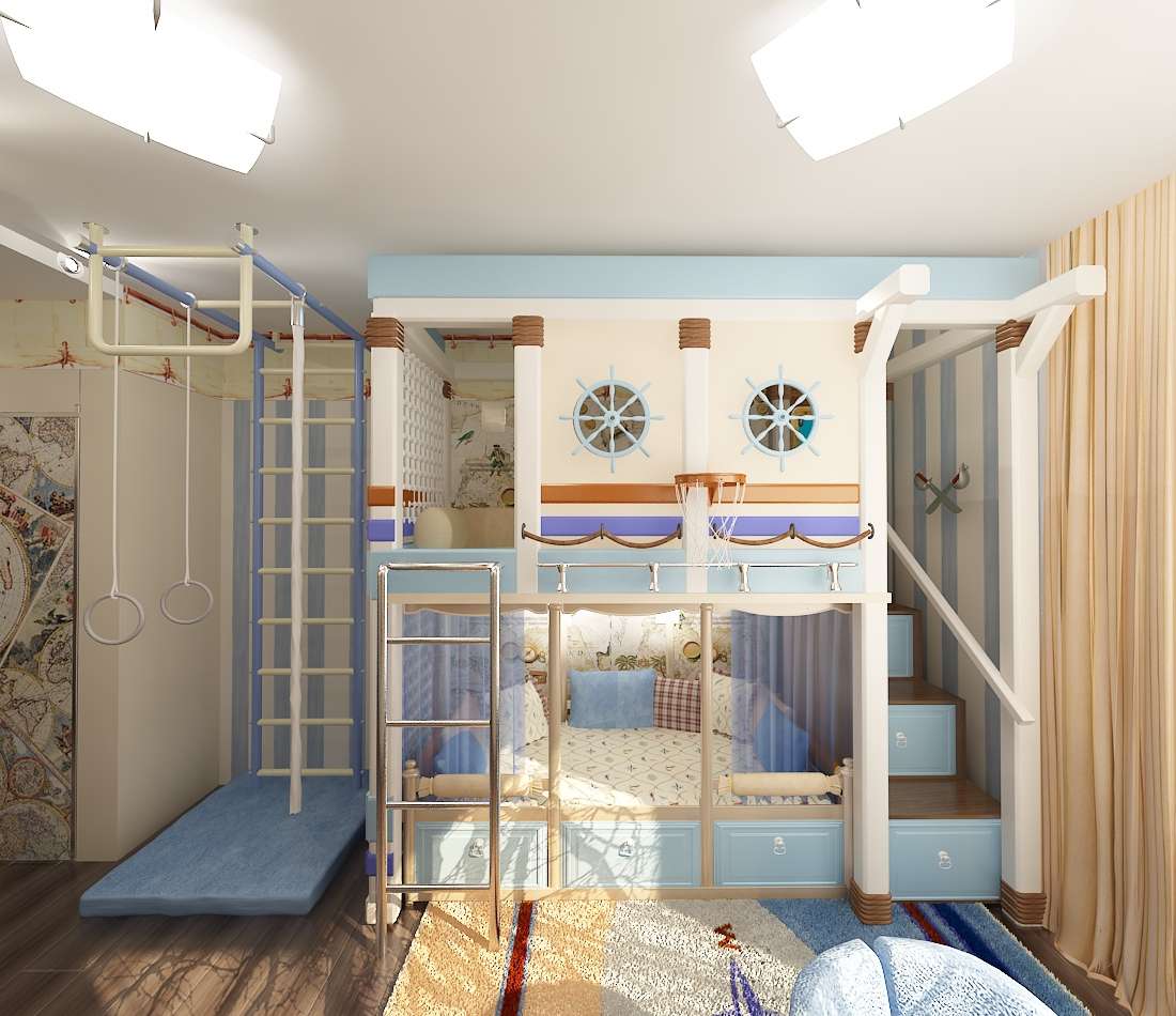 Dormindo na cama mais se assemelha a cama de um navio. A escada tem a aparência de uma escada com degraus largos. As partes principais são brancas, e os lados da bainha e da segurança são aparados com azul e azul. Para estes fins, é utilizado couro artificial ou plástico. A cama do sotão, em forma de navio pirata ou de uma escuna velha e maltratada, pelo contrário, é feita em cores mais escuras com madeira de imitação, com inserções temáticas brilhantes.