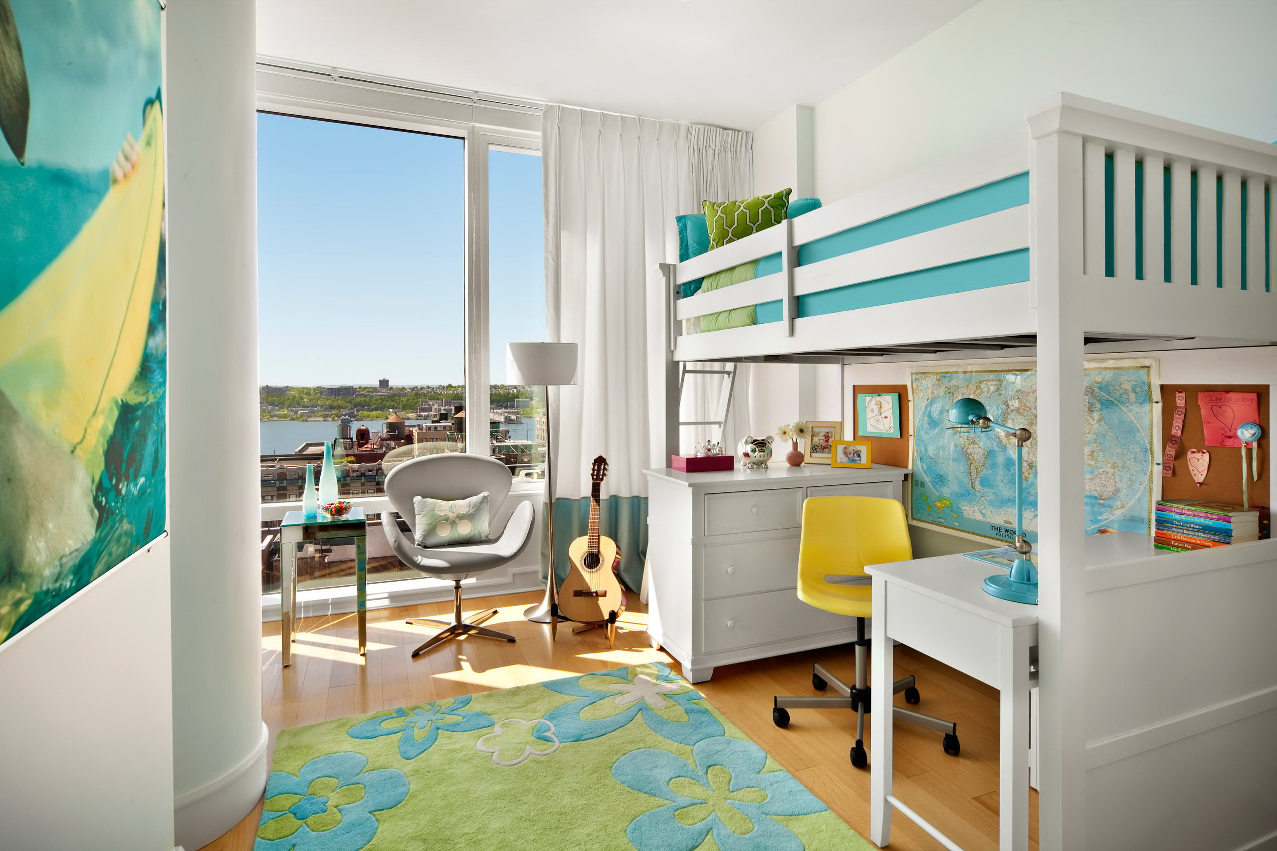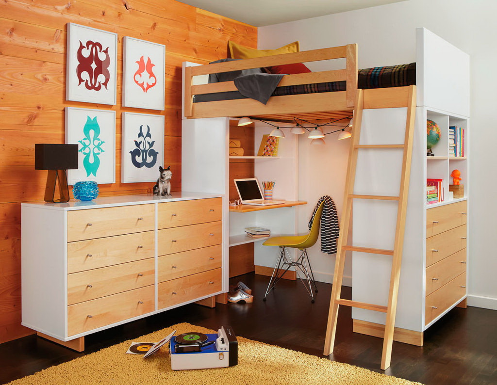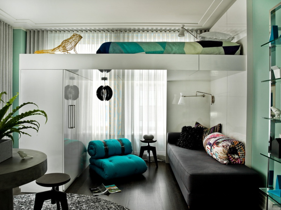 Para a recepção dos hóspedes e descanso durante o dia é melhor comprar uma cama alta com um sofá retrátil ou sofá. É bom que o seu filho possa modificar elementos individuais do mobiliário, expandindo assim a sua funcionalidade. Por exemplo, recue um par de nightstands ou instale um sofá compacto, não só debaixo da cama, mas também na outra extremidade da sala.