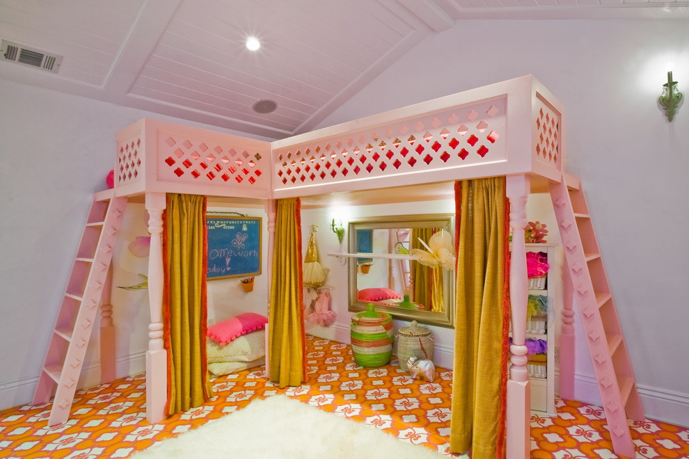 Estas camas do sotão são projetadas para crianças e crianças em idade escolar. Para as crianças mais novas, é instalado um tecido ou casa translúcida, localizado ao lado da cama ou abaixo dela. Por conveniência, é cortinado com cortinas brilhantes, que podem ser abertas ou empurradas a qualquer momento, e com janelas.