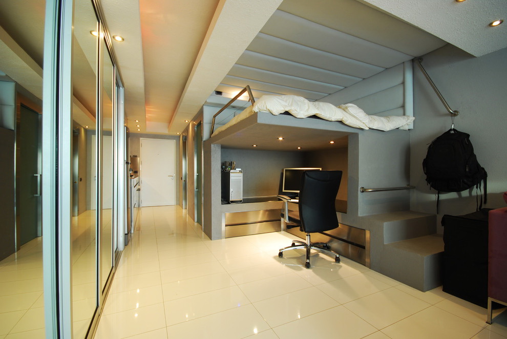 Ao comprar este tipo de mobília, você não precisa mais lutar onde colocar a mesa de cabeceira ou onde instalar as prateleiras. Levantar a cama até o "segundo andar" permite liberar espaço para trabalhar no computador, fazer aulas, jogar, praticar esportes, etc.