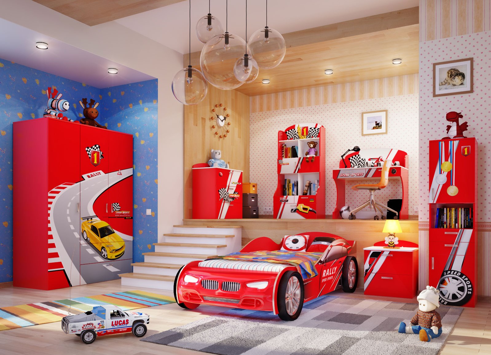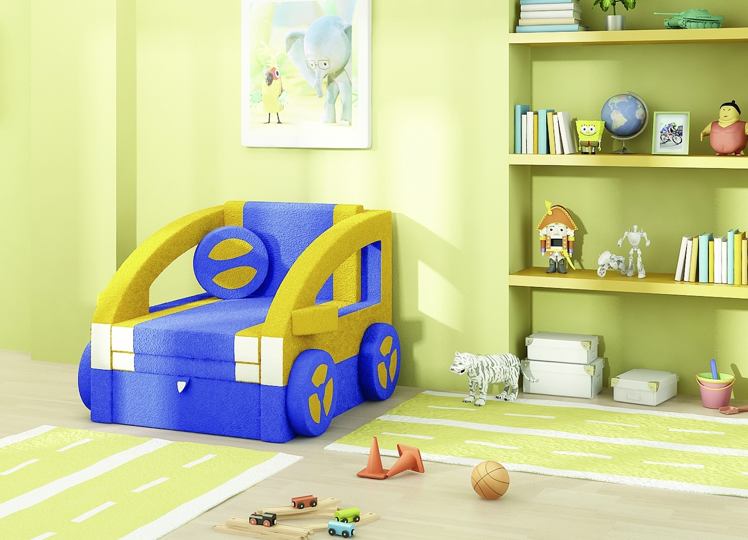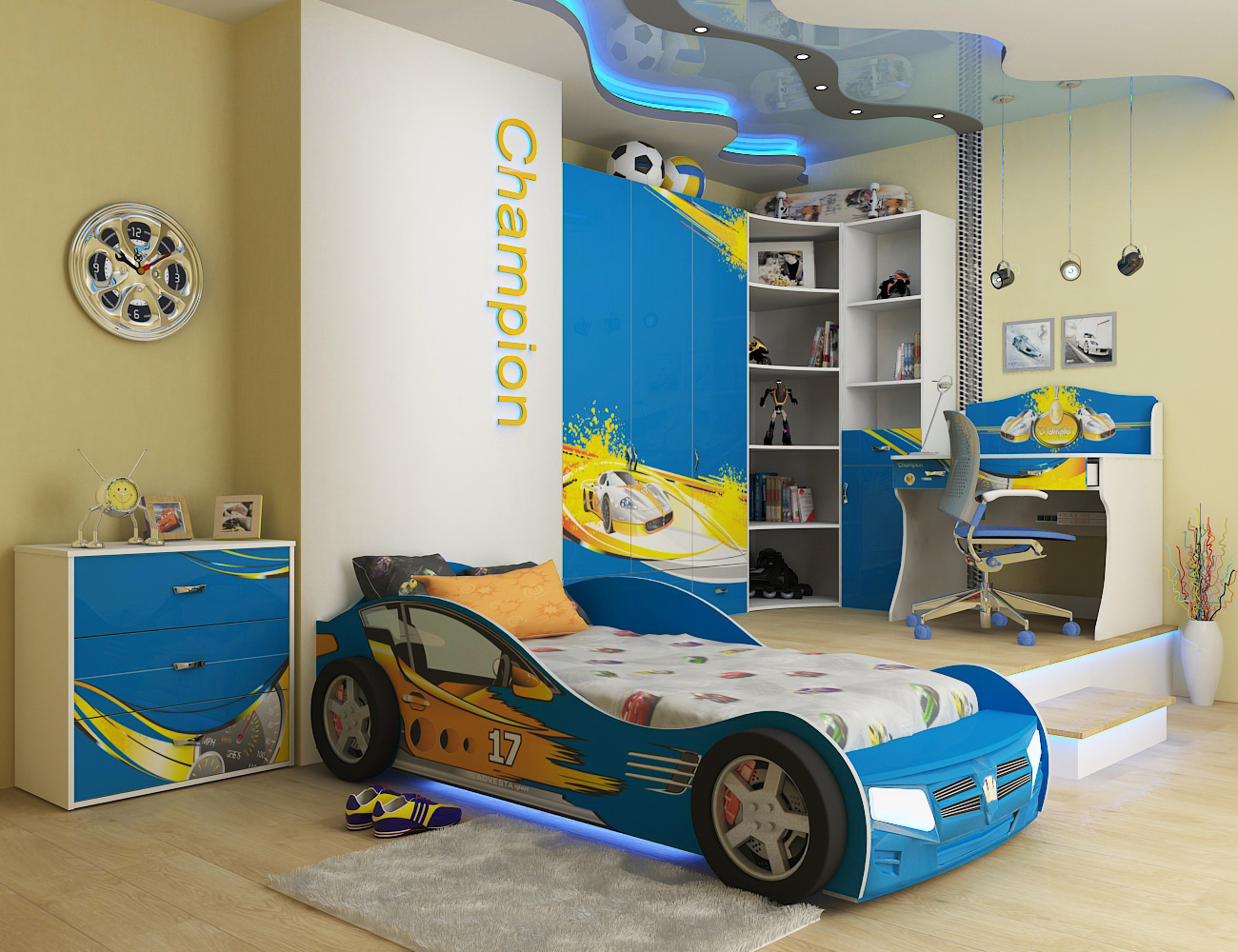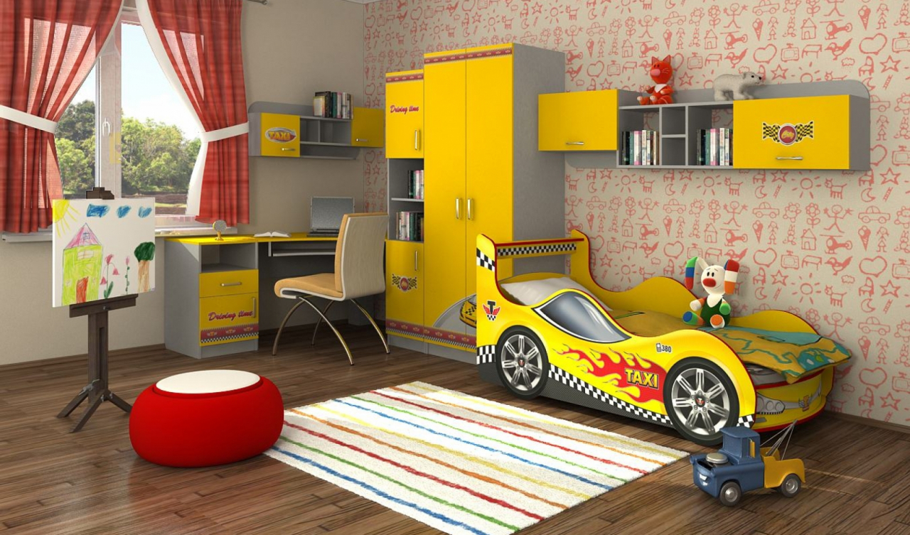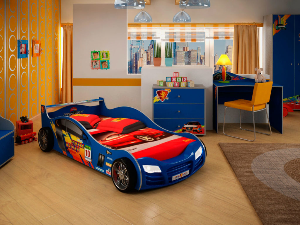 A mobília em forma de carro é universal, caberá em qualquer estilo da sala. Além disso, vai dar um toque brilhante e interessante para o quartopor assim dizer, atualize a situação.