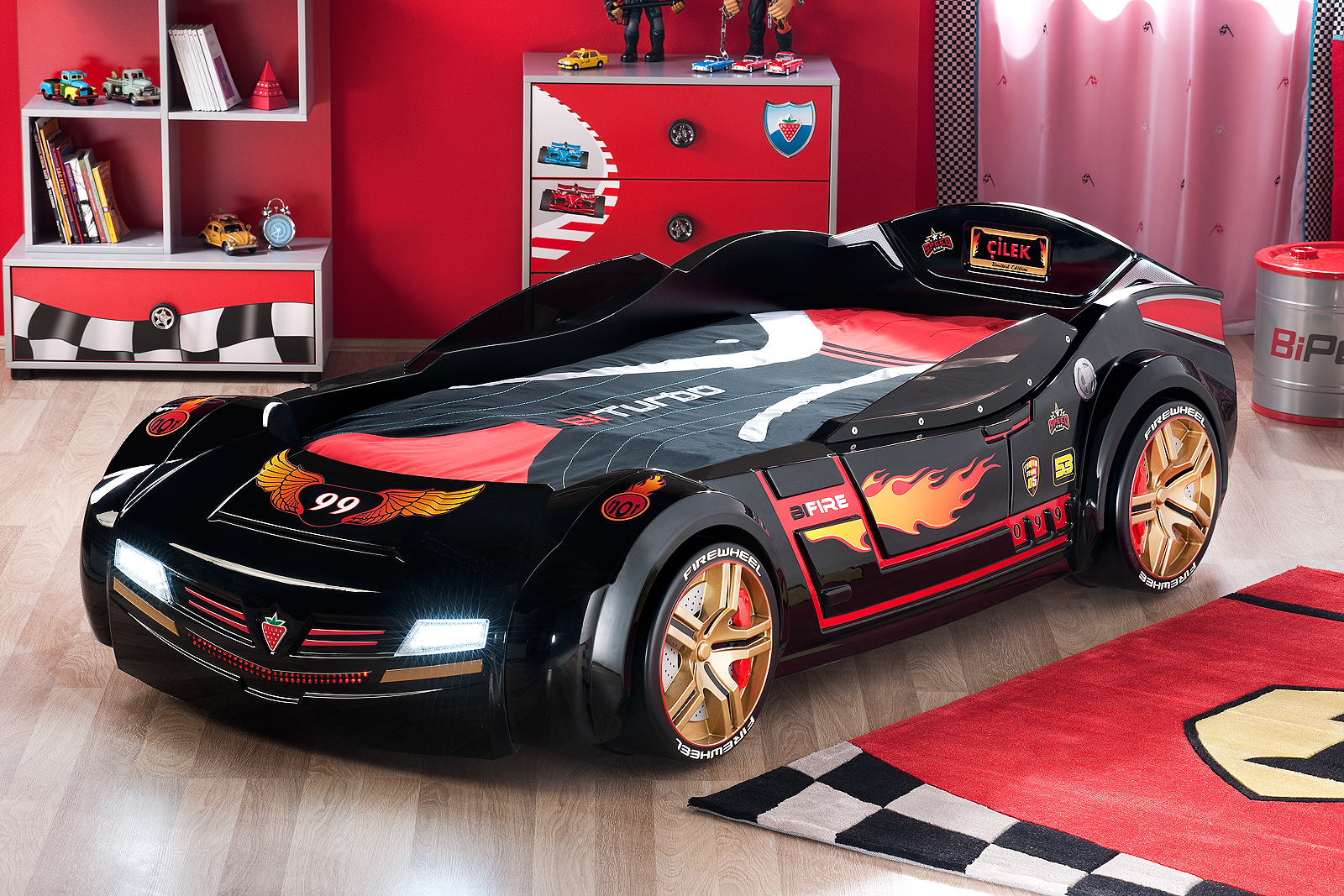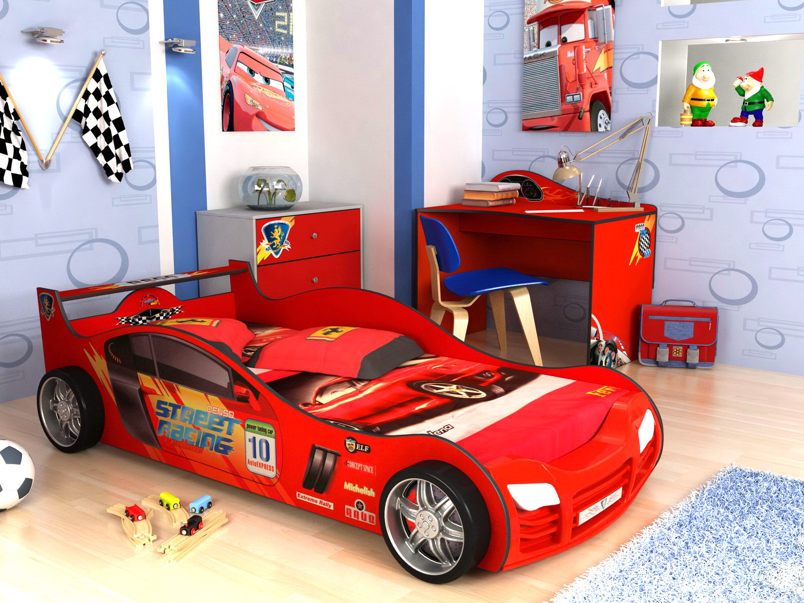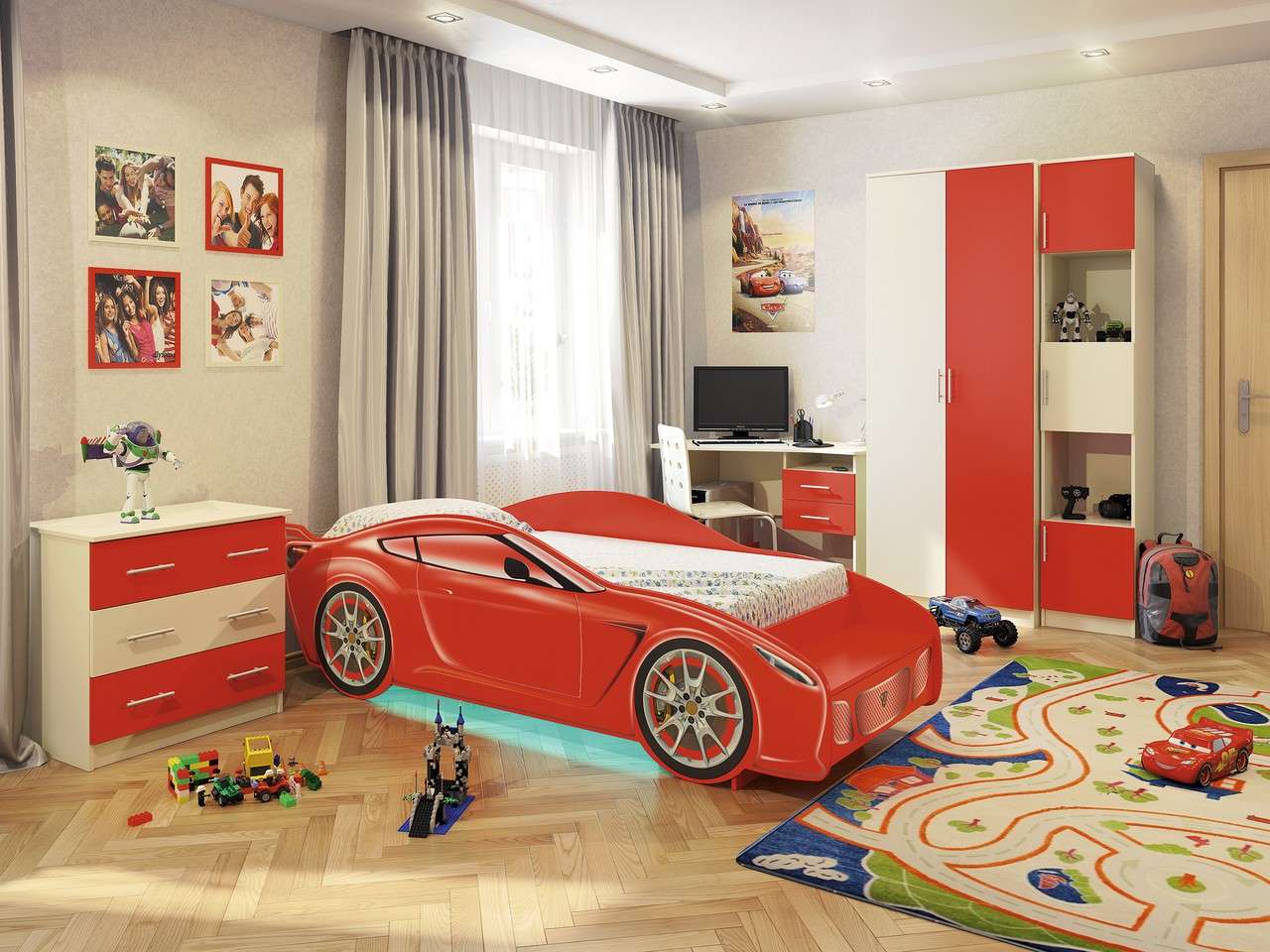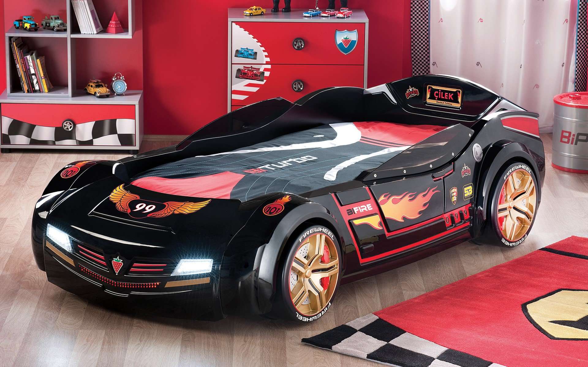 A mobília em forma de carro é universal, caberá em qualquer estilo da sala. Além disso, vai dar um toque brilhante e interessante para o quartopor assim dizer, atualize a situação.