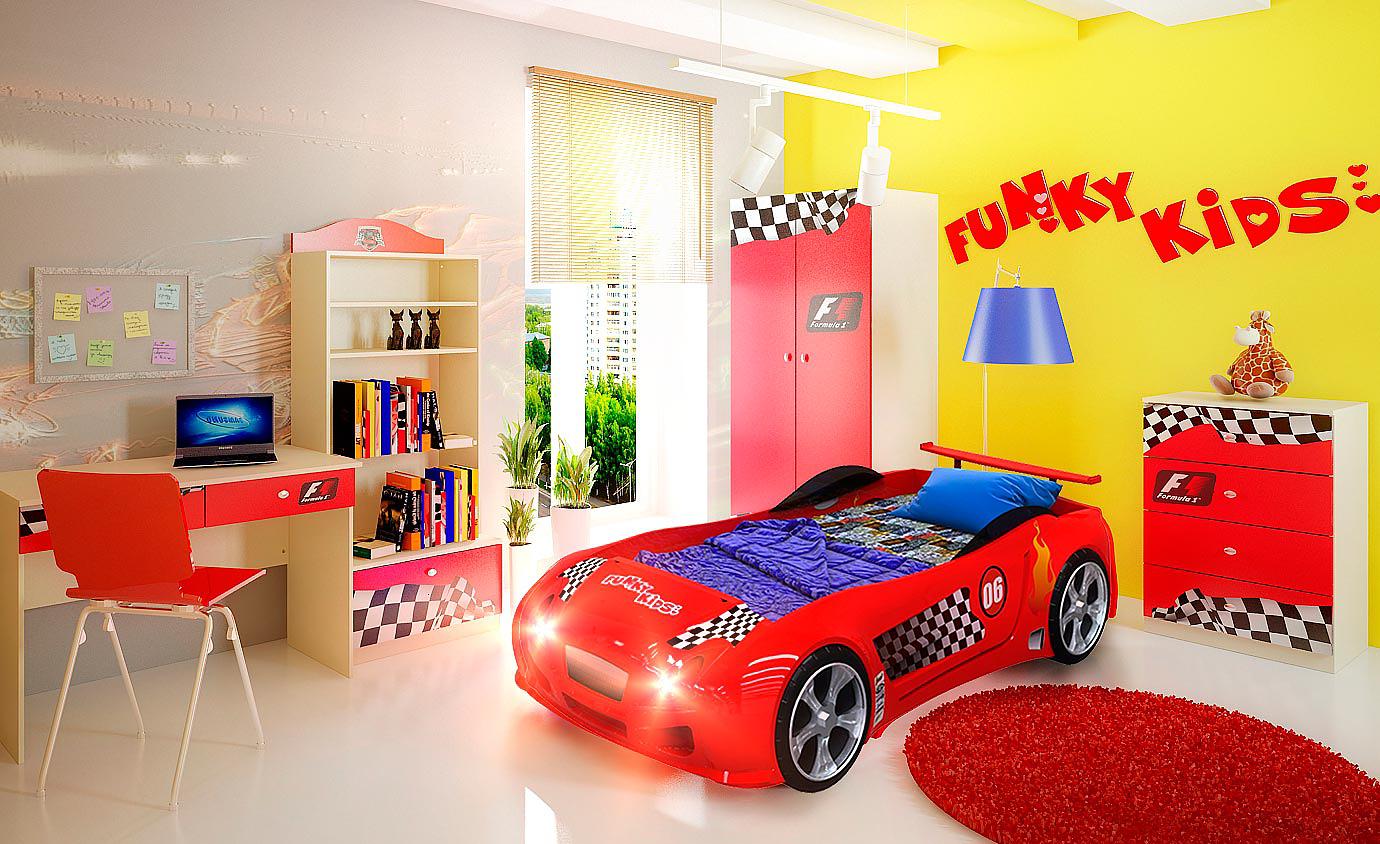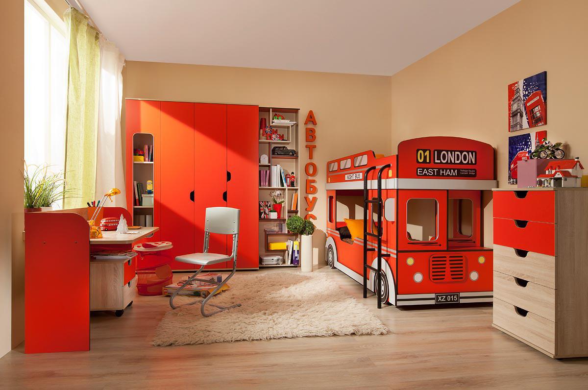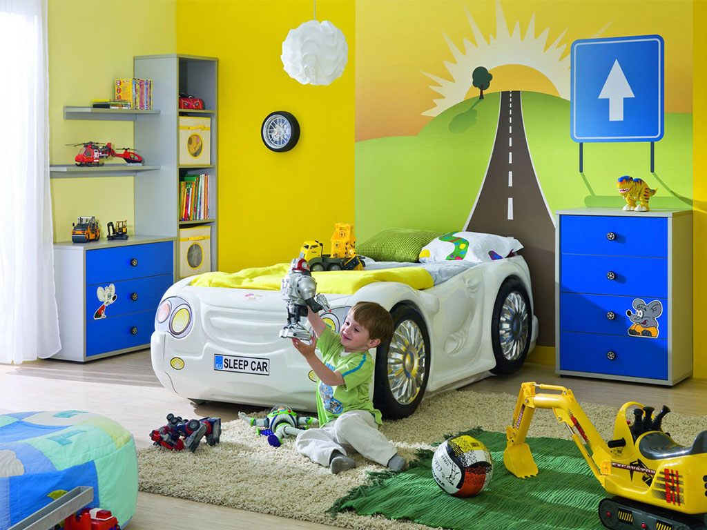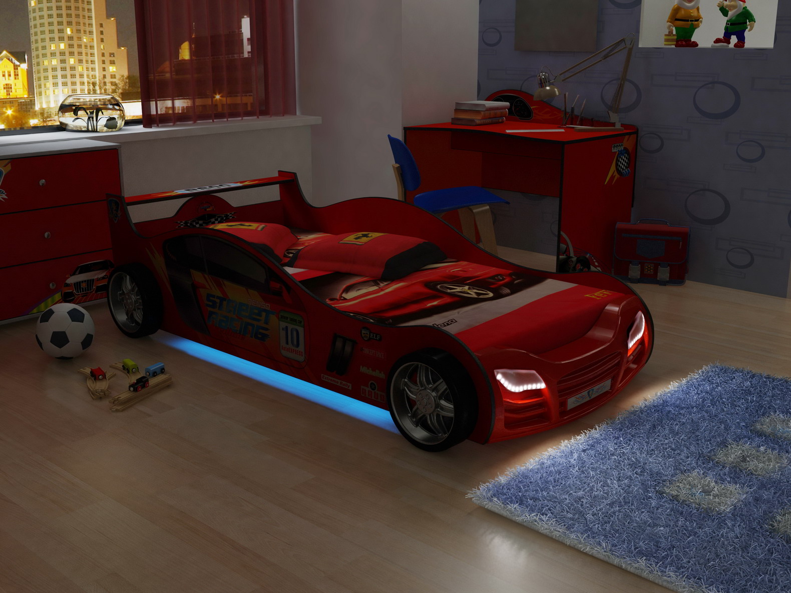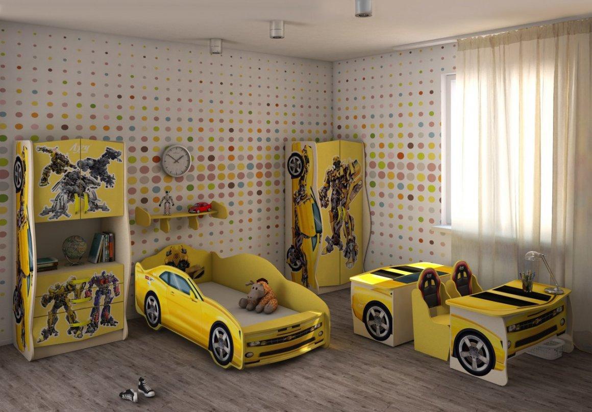 A mobília em forma de carro é universal, caberá em qualquer estilo da sala. Além disso, vai dar um toque brilhante e interessante para o quartopor assim dizer, atualize a situação.