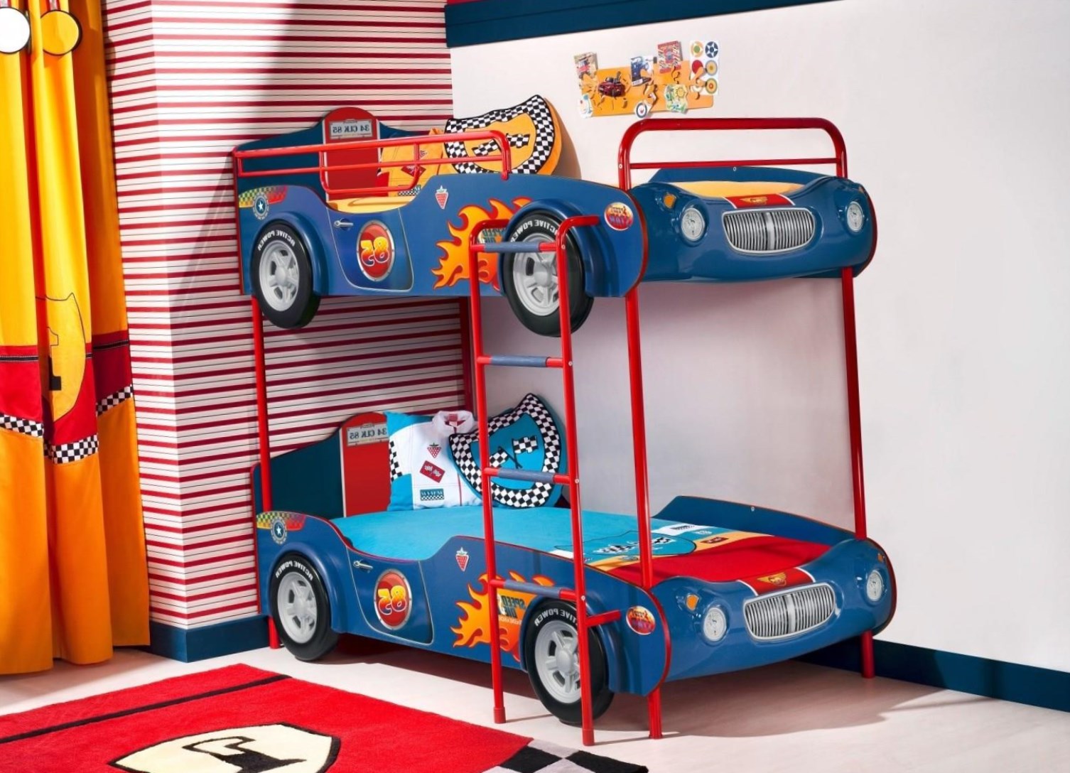 Você pode economizar espaço no berçário de uma forma original - para colocar um beliche. Ele também vem em tópicos automotivos úteis. Esta ideia é adequada não apenas para crianças do mesmo sexo, mas também modelos que se adequam tanto a meninas quanto a meninos.