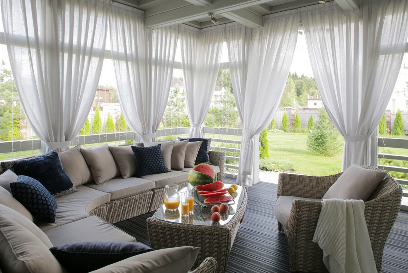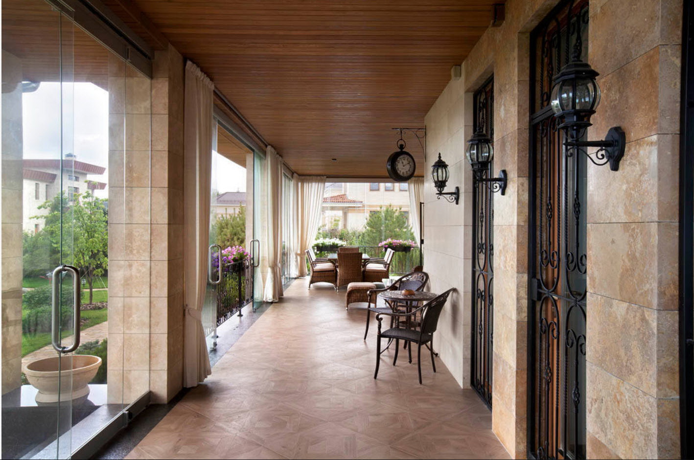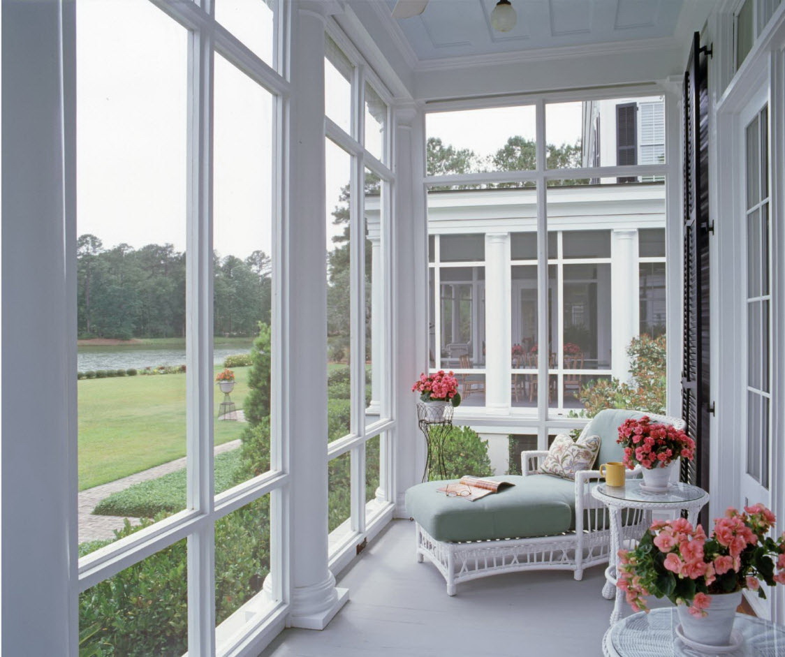 Uma das variedades de estilo europeu, com charme. O destaque é a presença de uma porta de vidro com uma treliça no projeto openwork. O design deve ser decorado com elementos encaracolados, belos móveis de vime, muitas flores (vasos no chão, vasos suspensos).