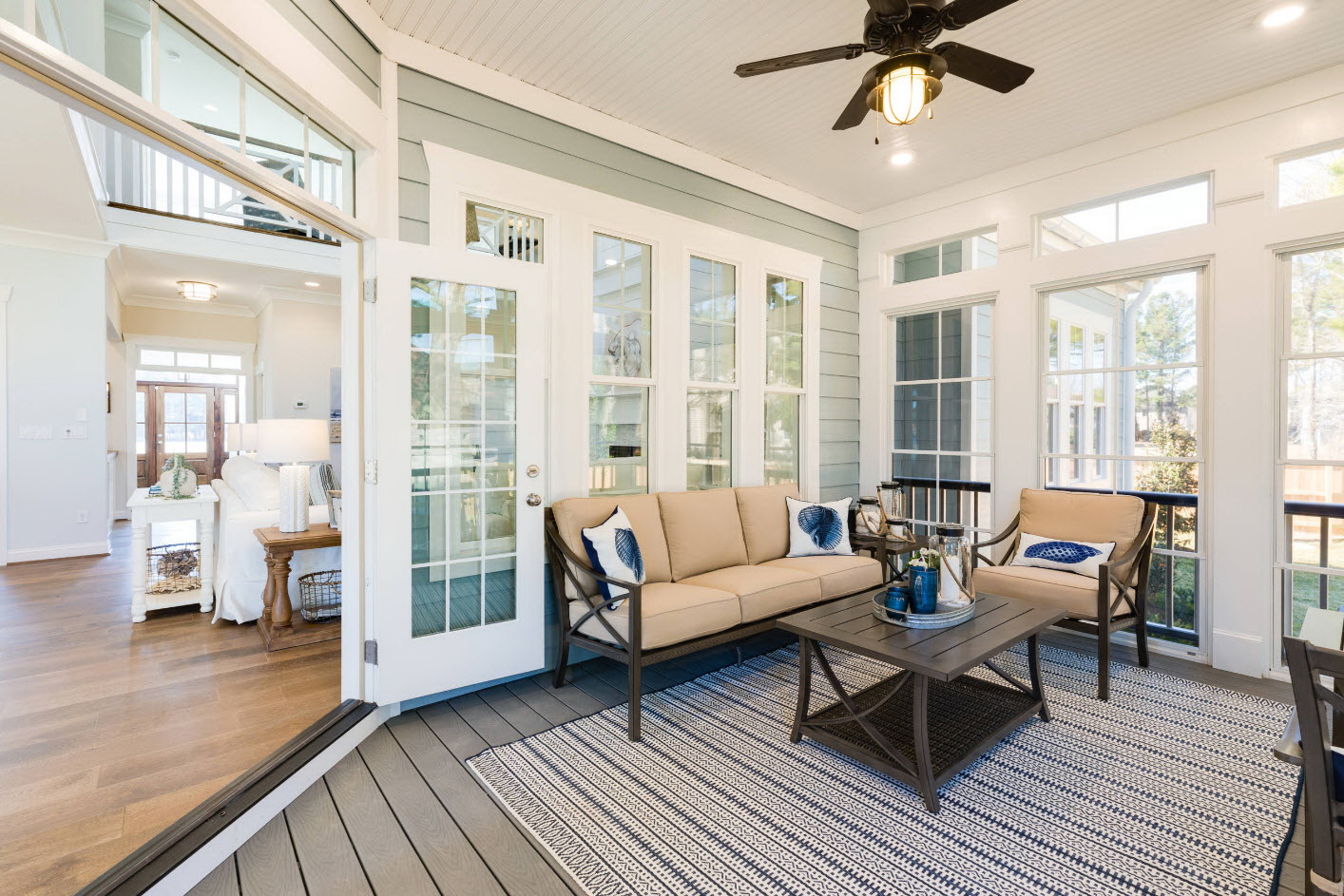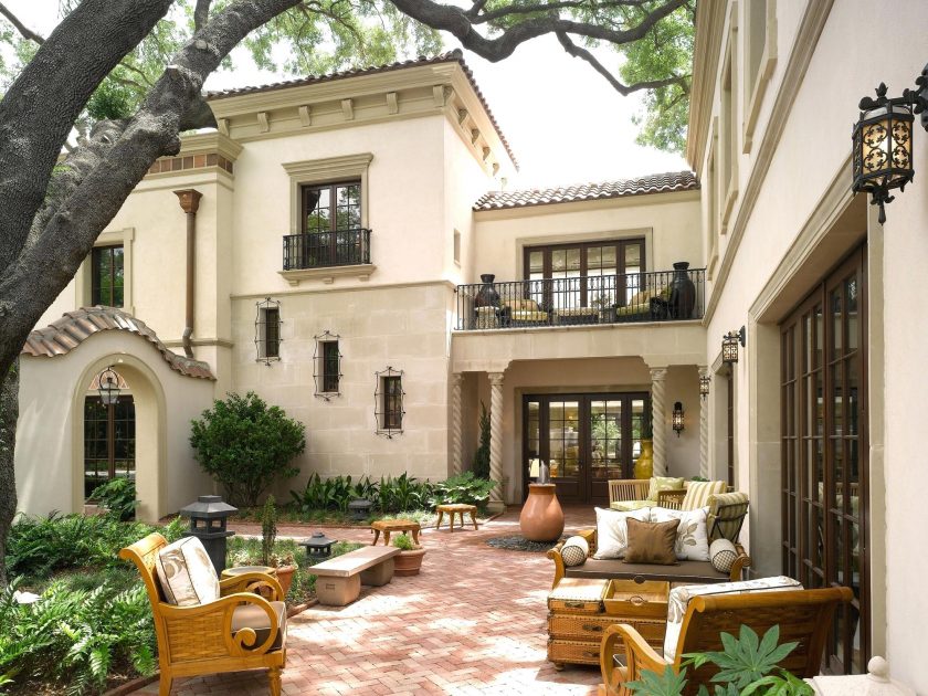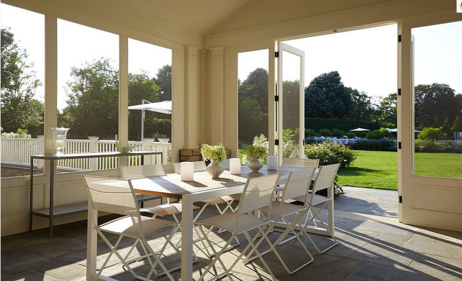 Uma das variedades de estilo europeu, com charme. O destaque é a presença de uma porta de vidro com uma treliça no projeto openwork. O design deve ser decorado com elementos encaracolados, belos móveis de vime, muitas flores (vasos no chão, vasos suspensos).