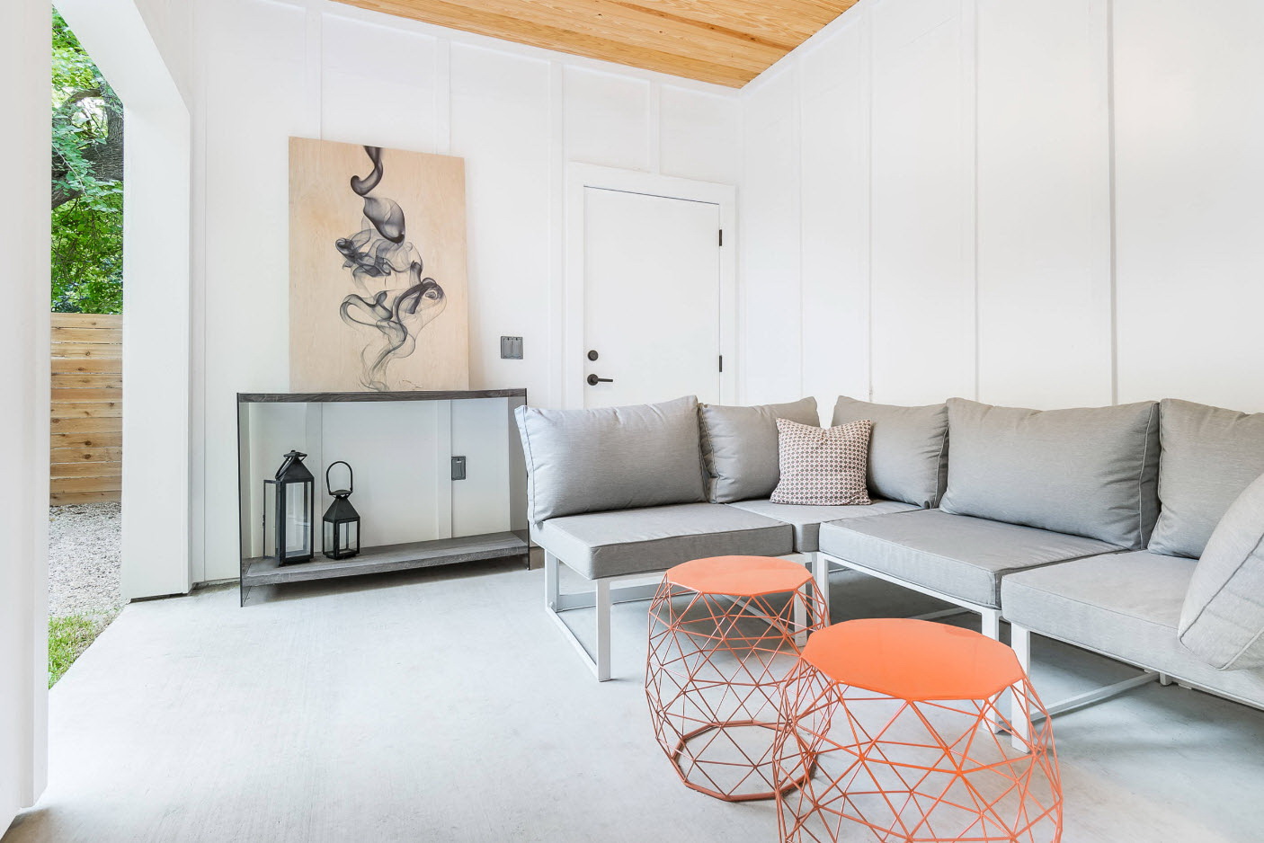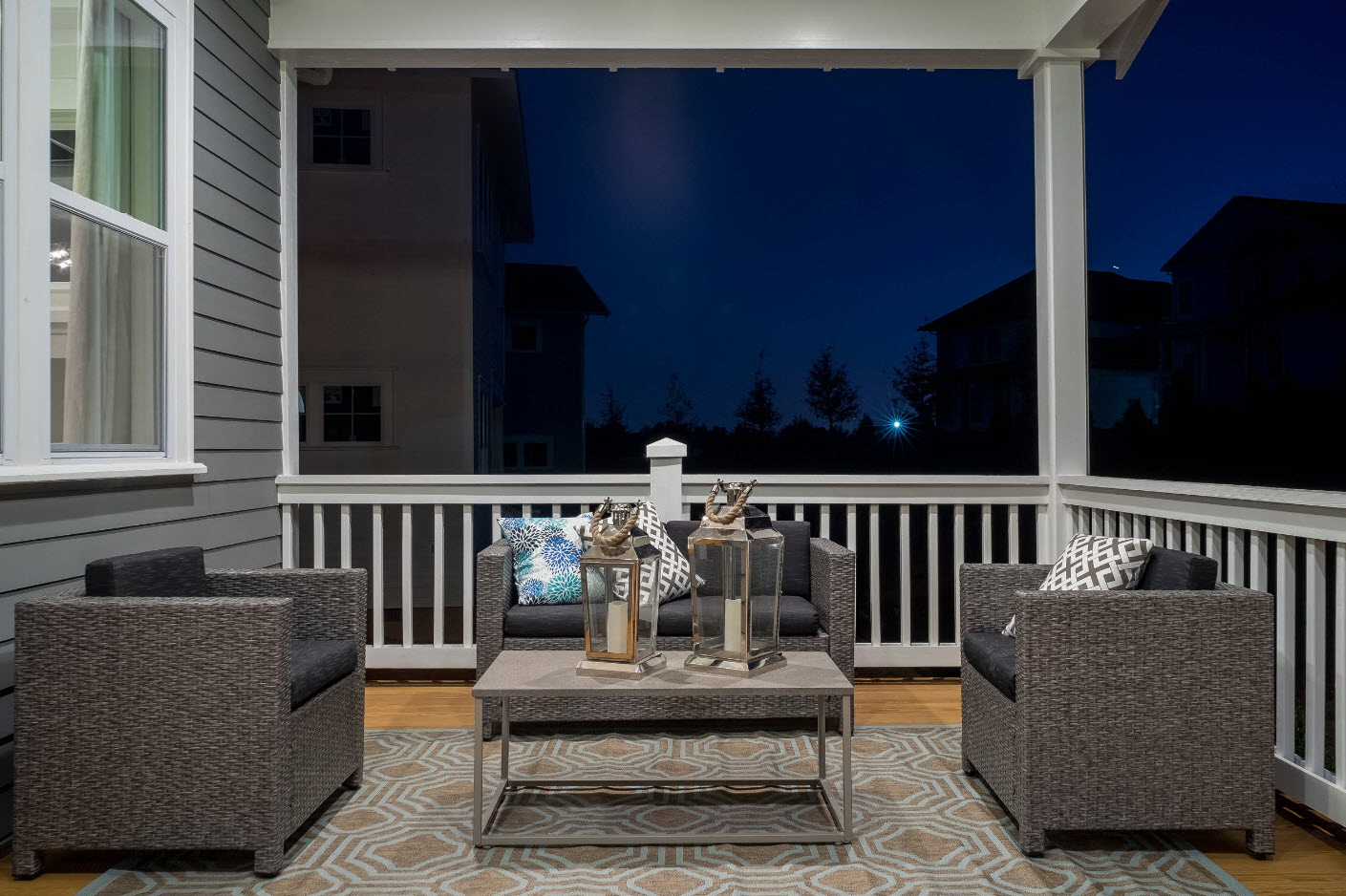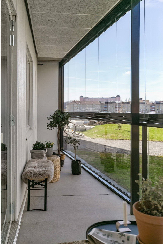 O design desta varanda é rigoroso, mas elegante. Para diluir tons frios, aconselhamos que você adicione uma decoração interessante, cores brilhantes, instale mais fontes de luz.