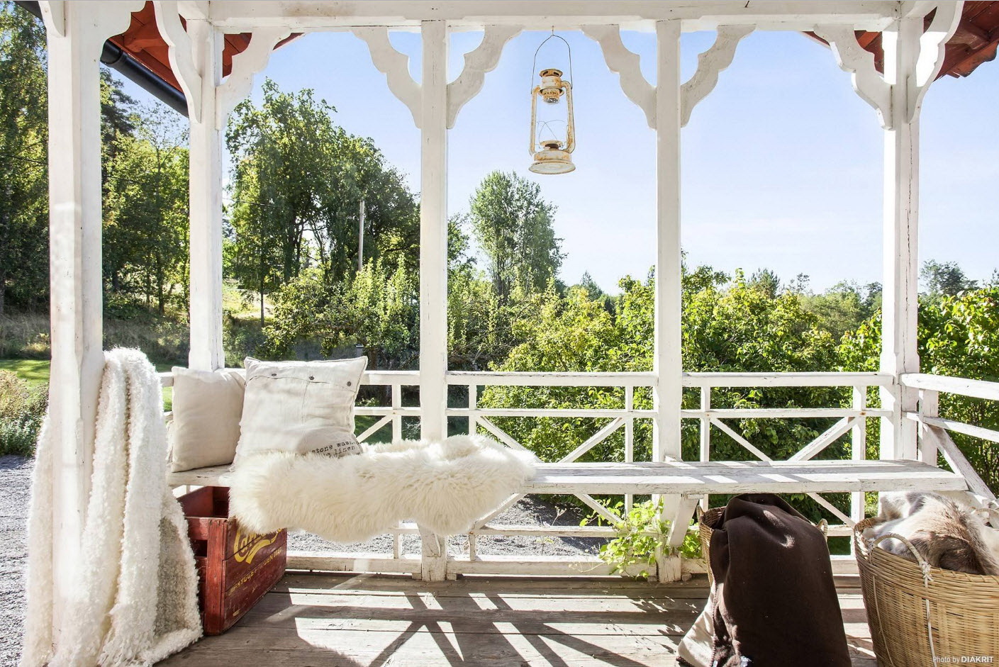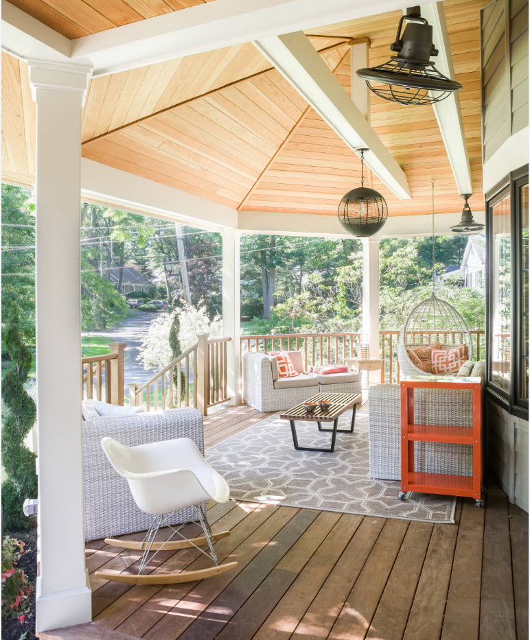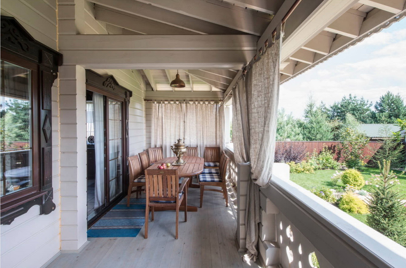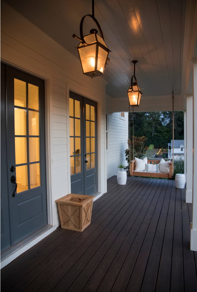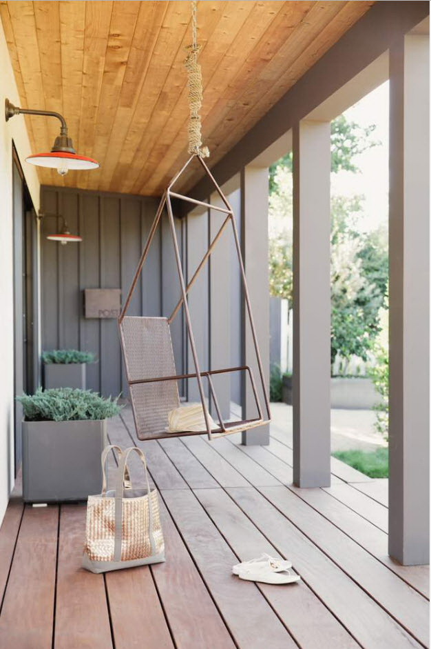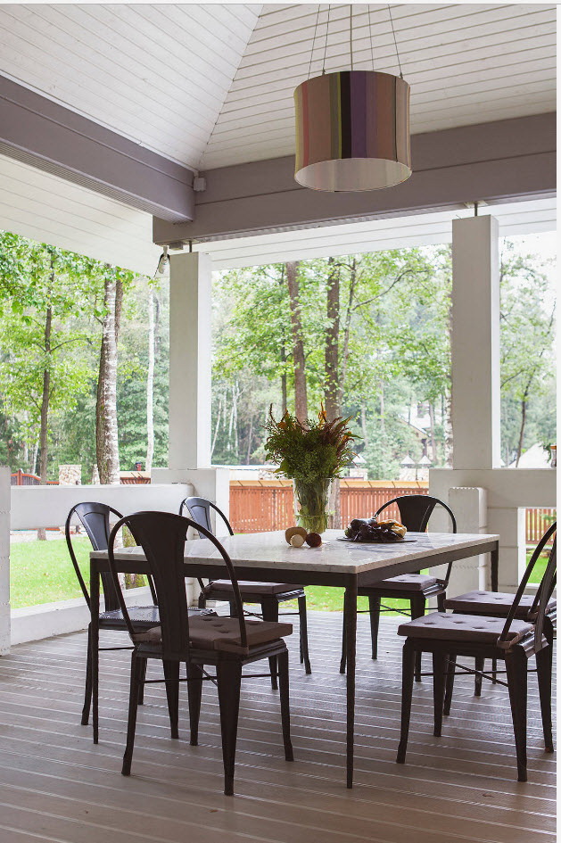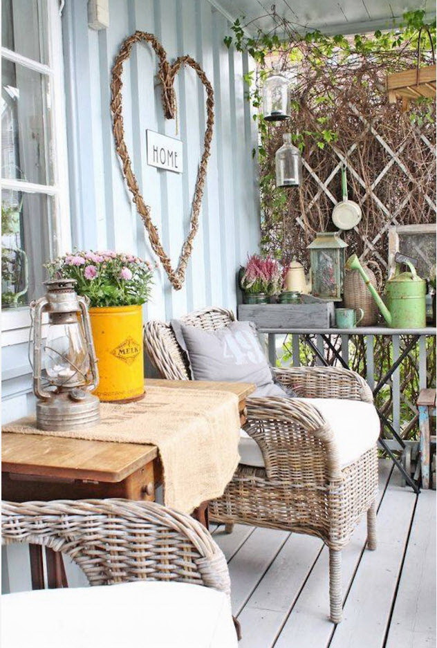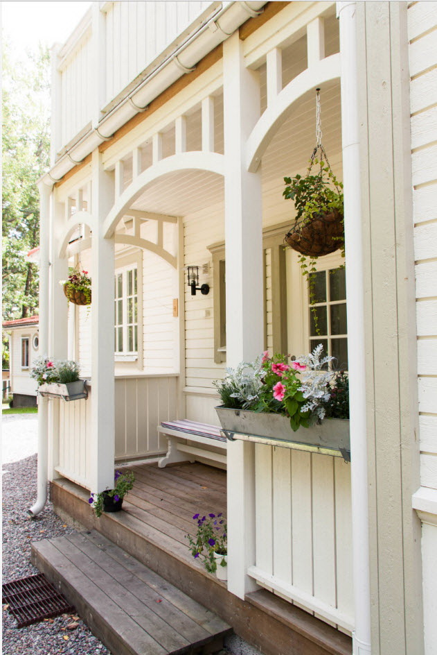 A varanda e a casa são um conjunto, mas não é necessário limitar a imaginação durante o registro. Quer fazer isso requintado? Adicione algumas lanternas, pendurando panelas com floresfotos.