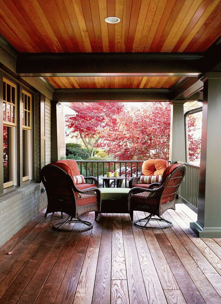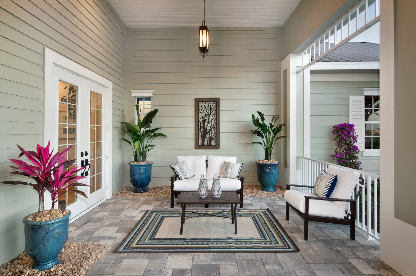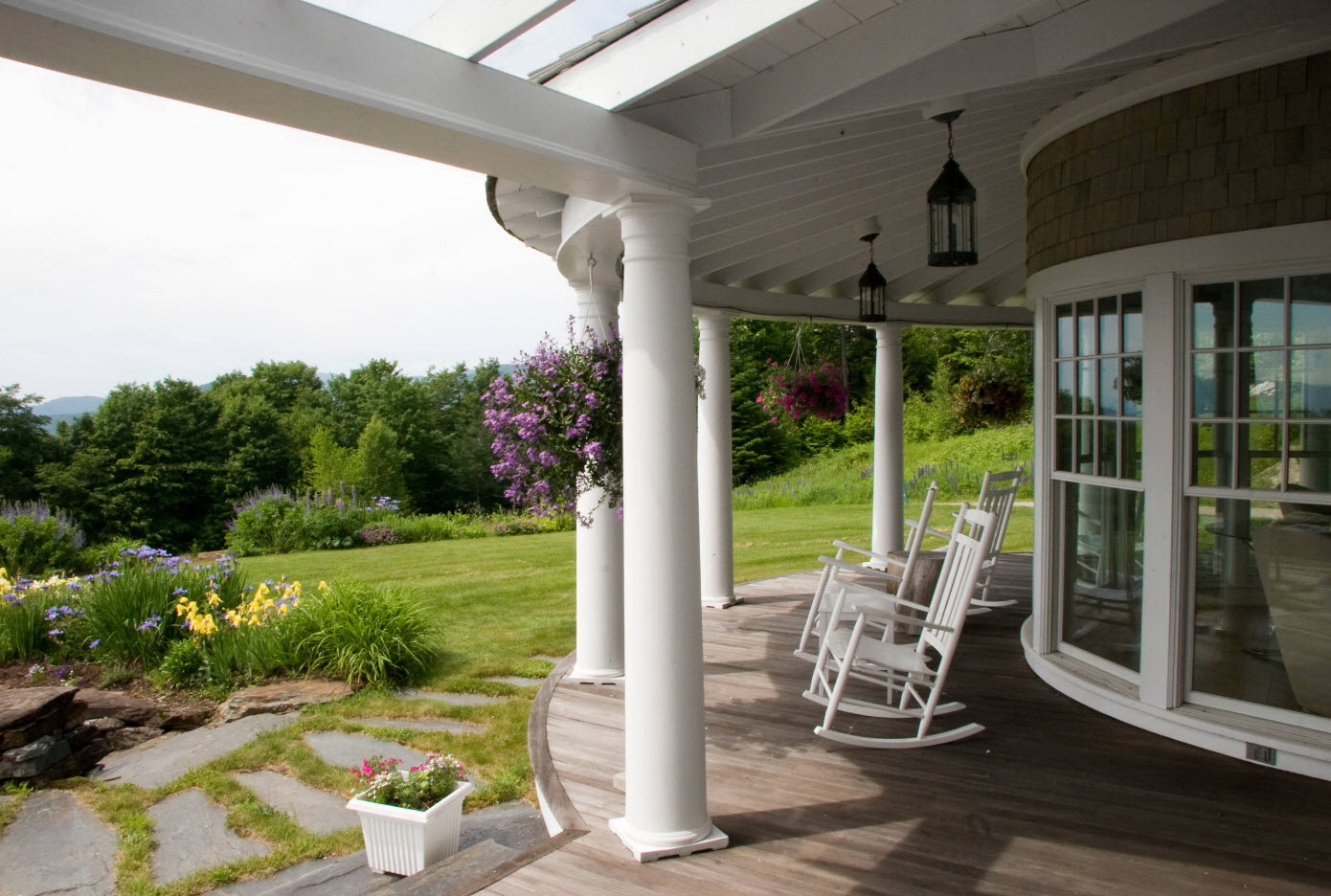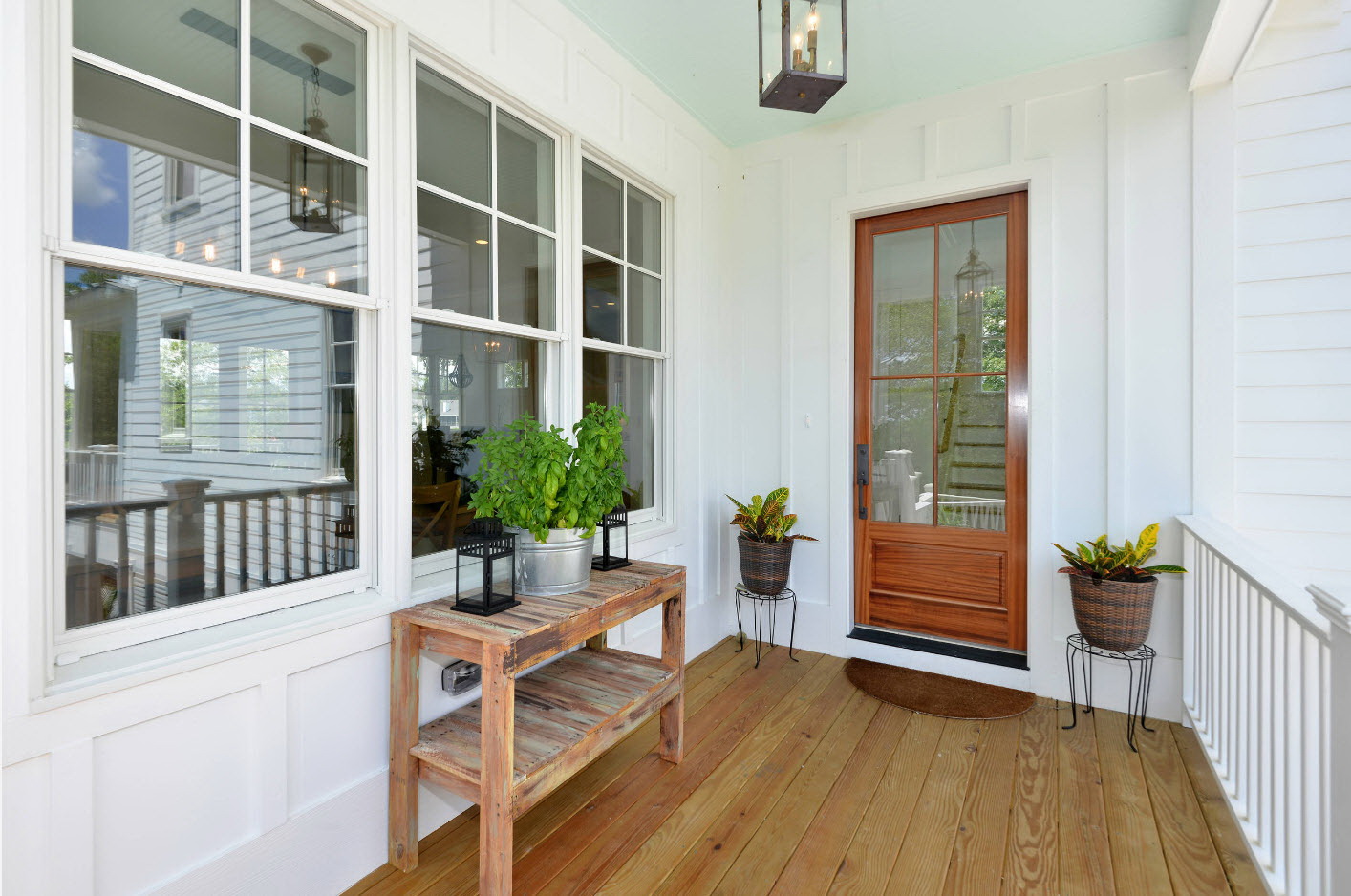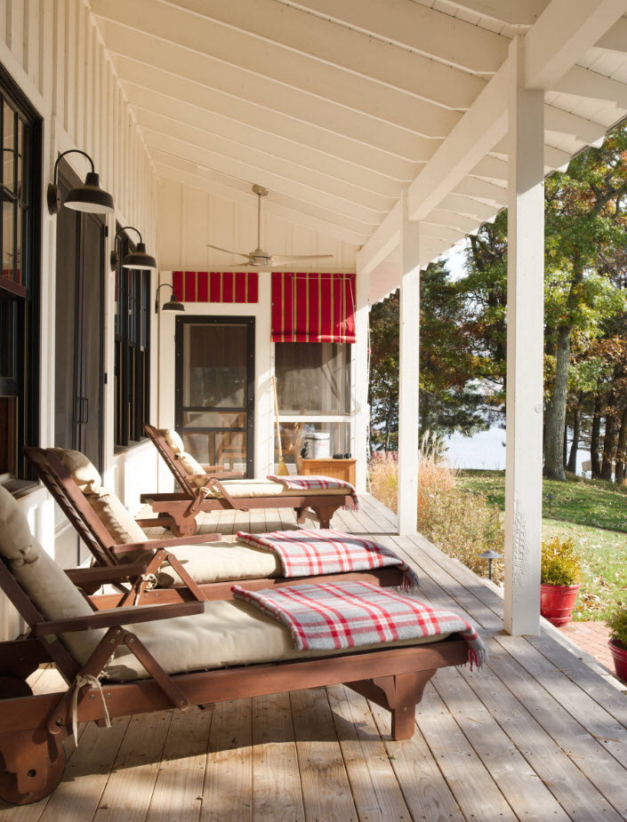 A varanda e a casa são um conjunto, mas não é necessário limitar a imaginação durante o registro. Quer fazer isso requintado? Adicione algumas lanternas, pendurando panelas com floresfotos.