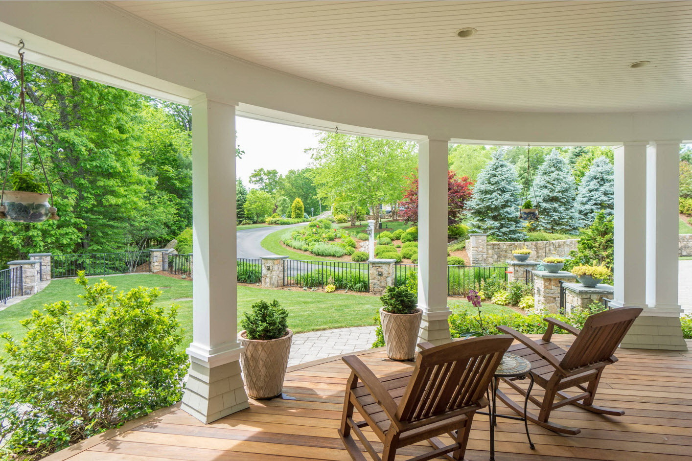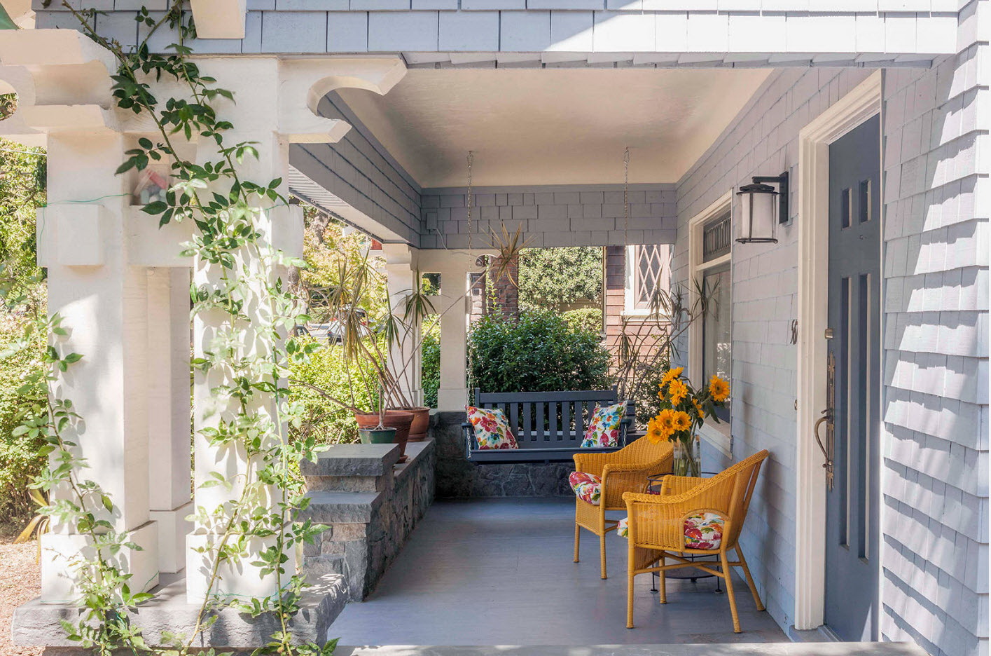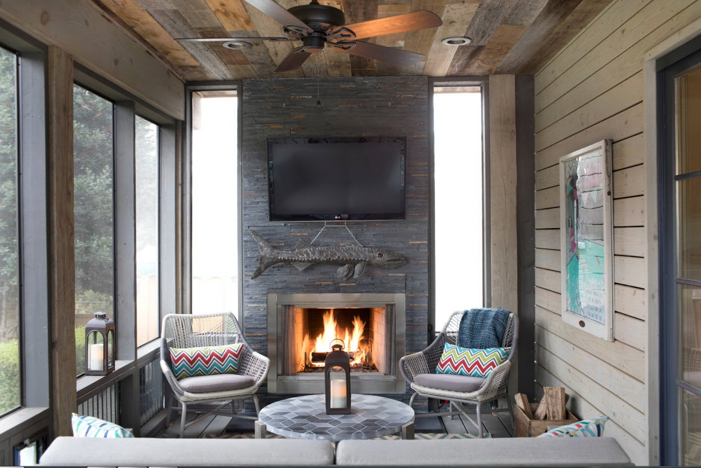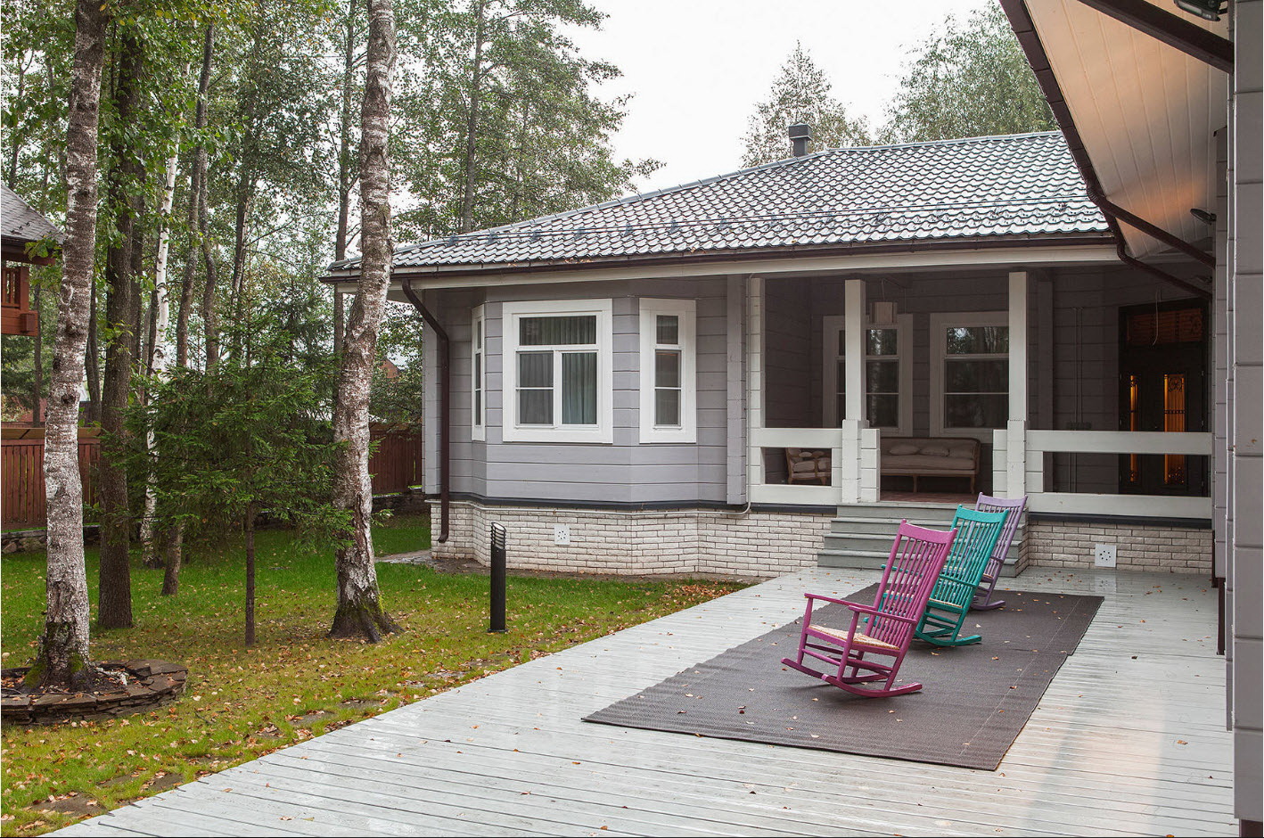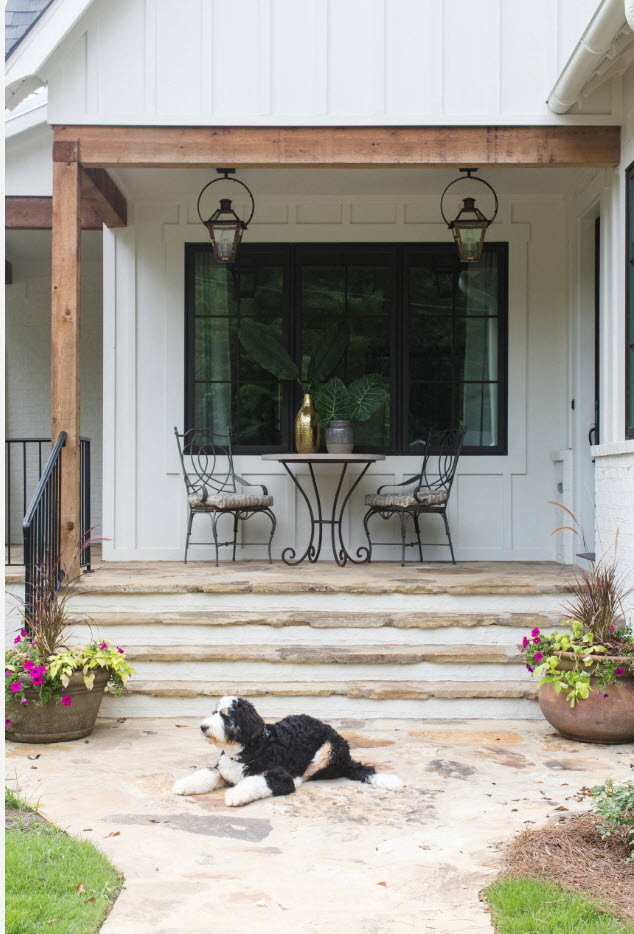 A varanda e a casa são um conjunto, mas não é necessário limitar a imaginação durante o registro. Quer fazer isso requintado? Adicione algumas lanternas, pendurando panelas com floresfotos.