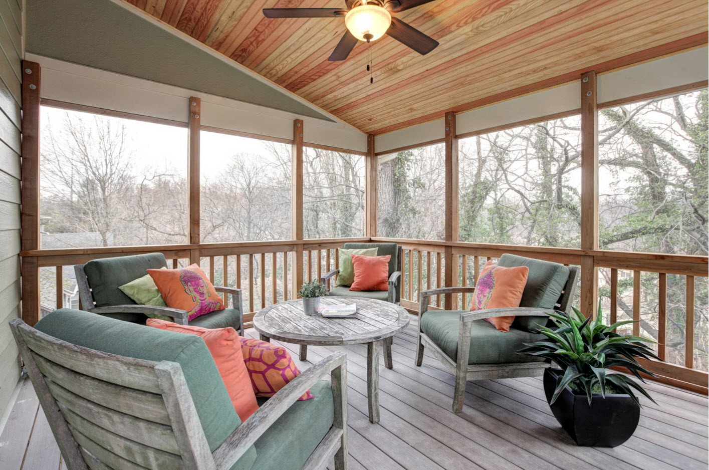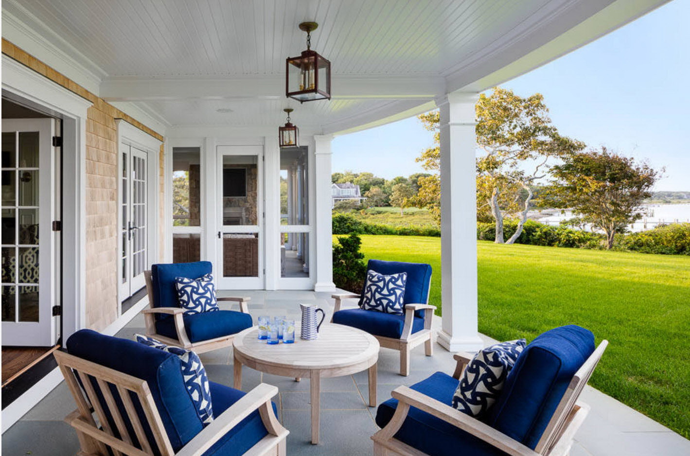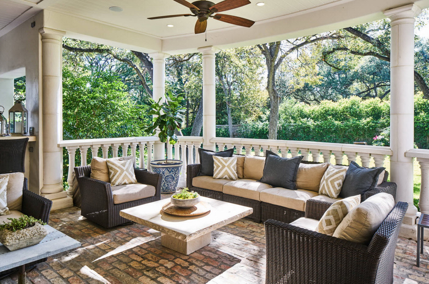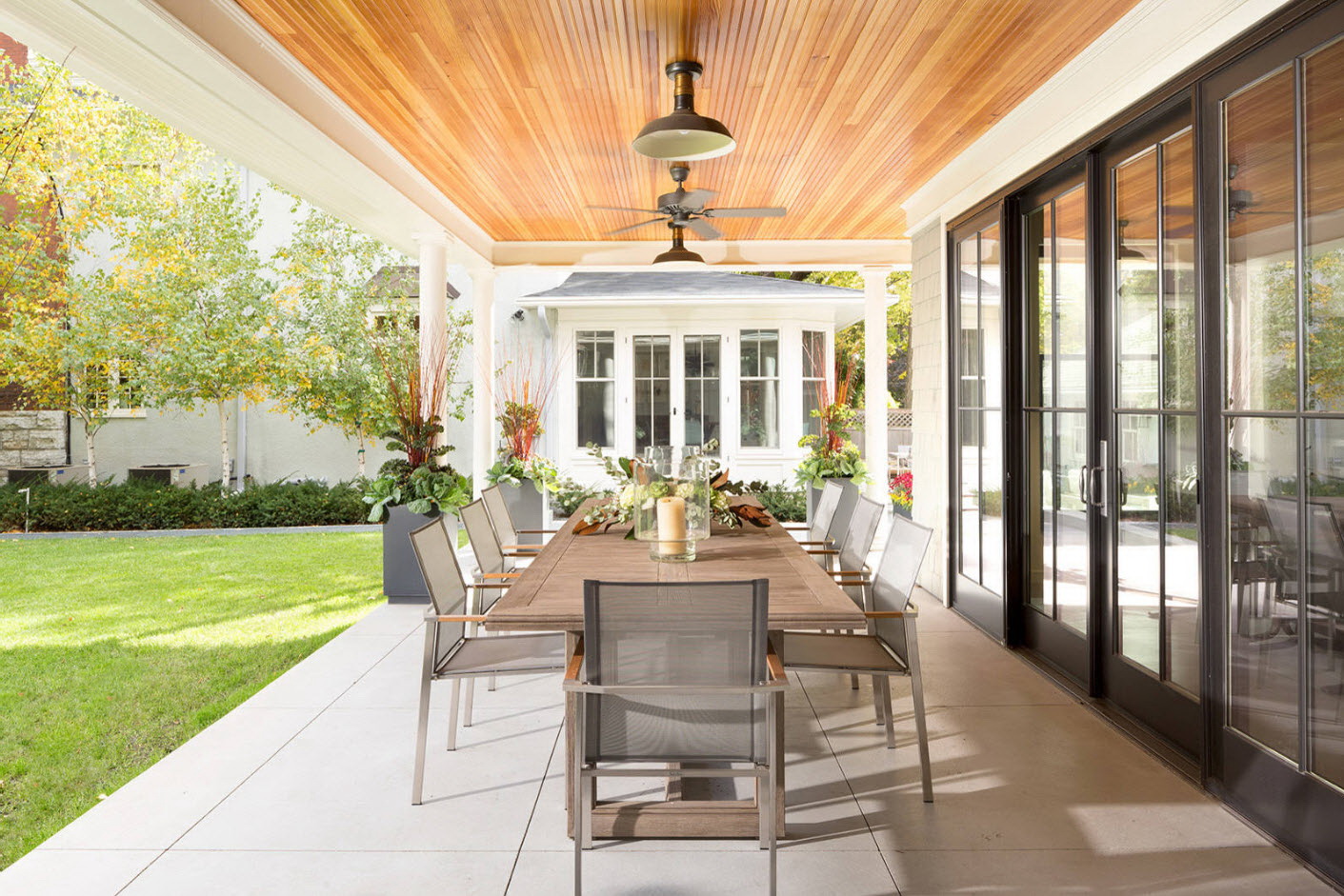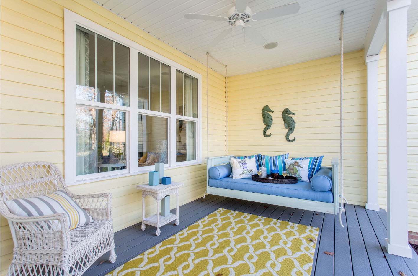 A varanda e a casa são um conjunto, mas não é necessário limitar a imaginação durante o registro. Quer fazer isso requintado? Adicione algumas lanternas, pendurando panelas com floresfotos.