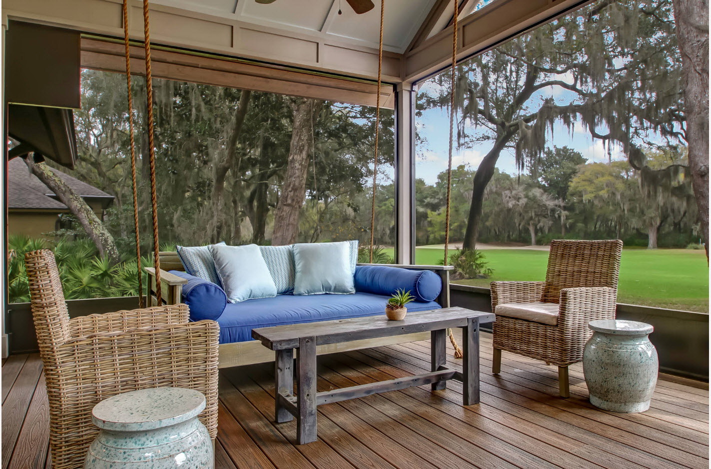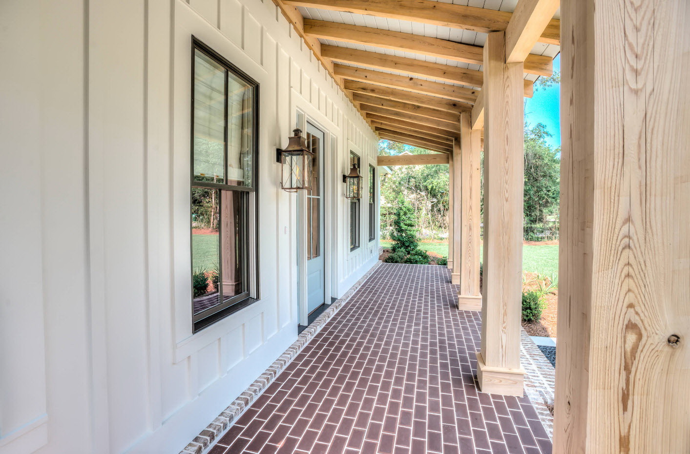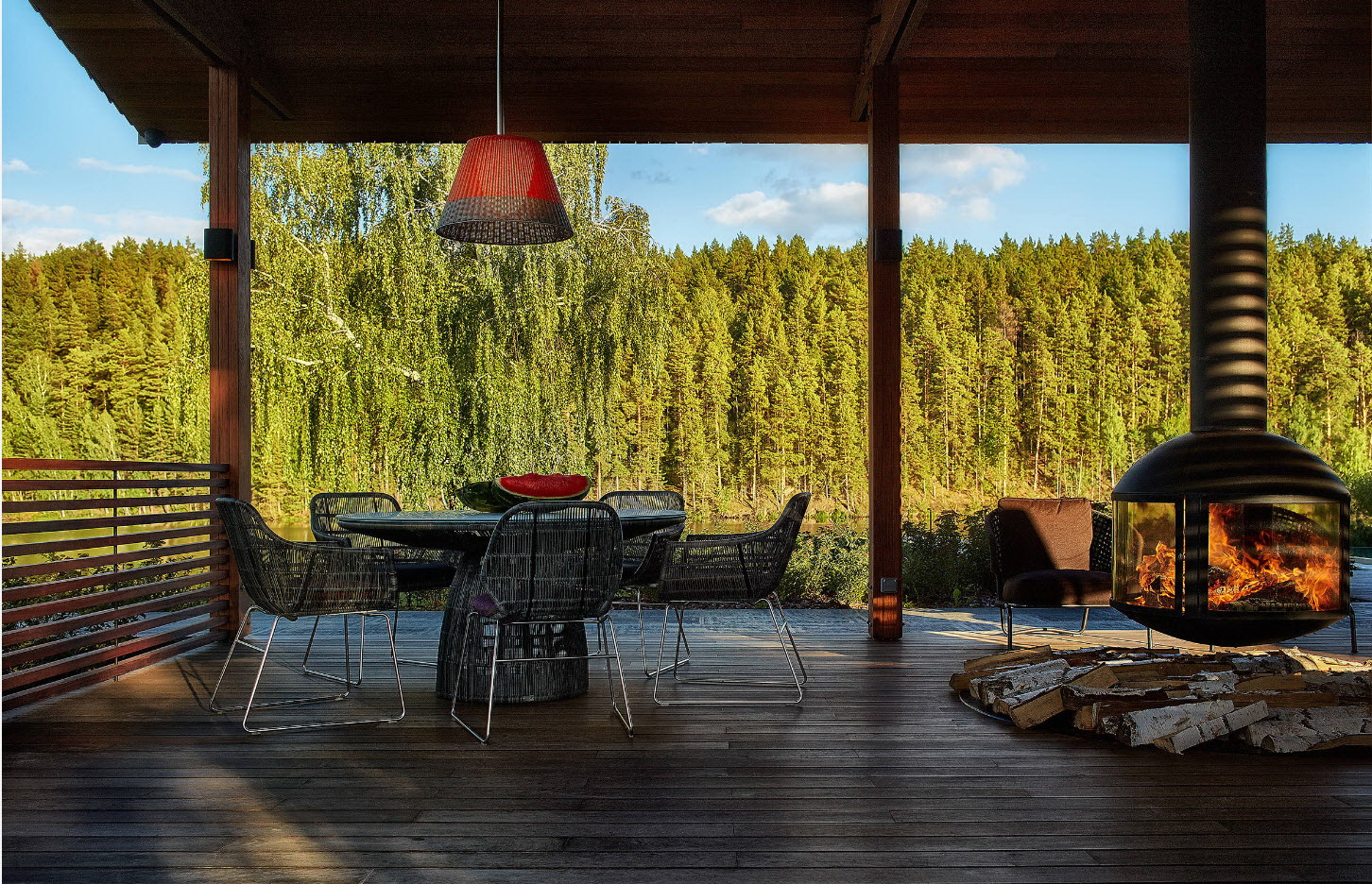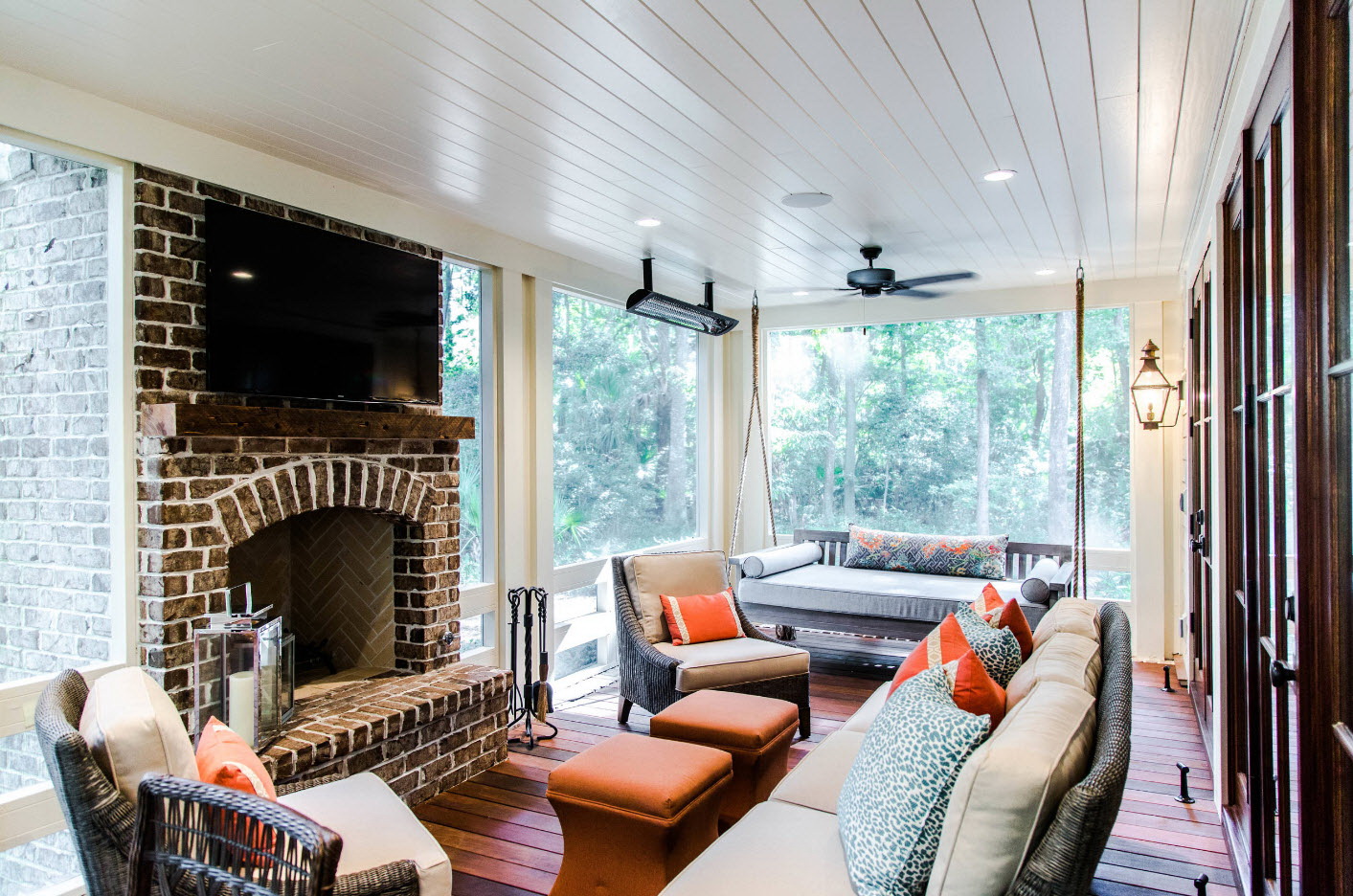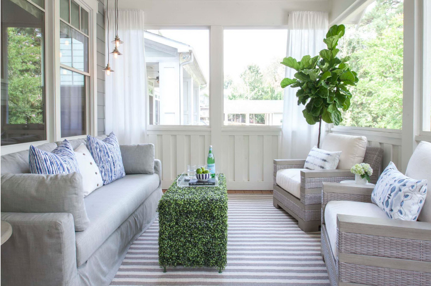 A varanda e a casa são um conjunto, mas não é necessário limitar a imaginação durante o registro. Quer fazer isso requintado? Adicione algumas lanternas, pendurando panelas com floresfotos.