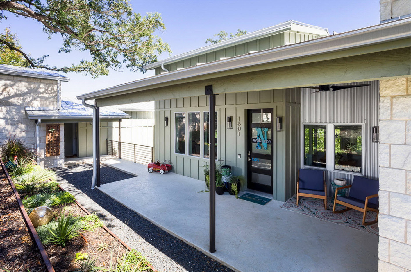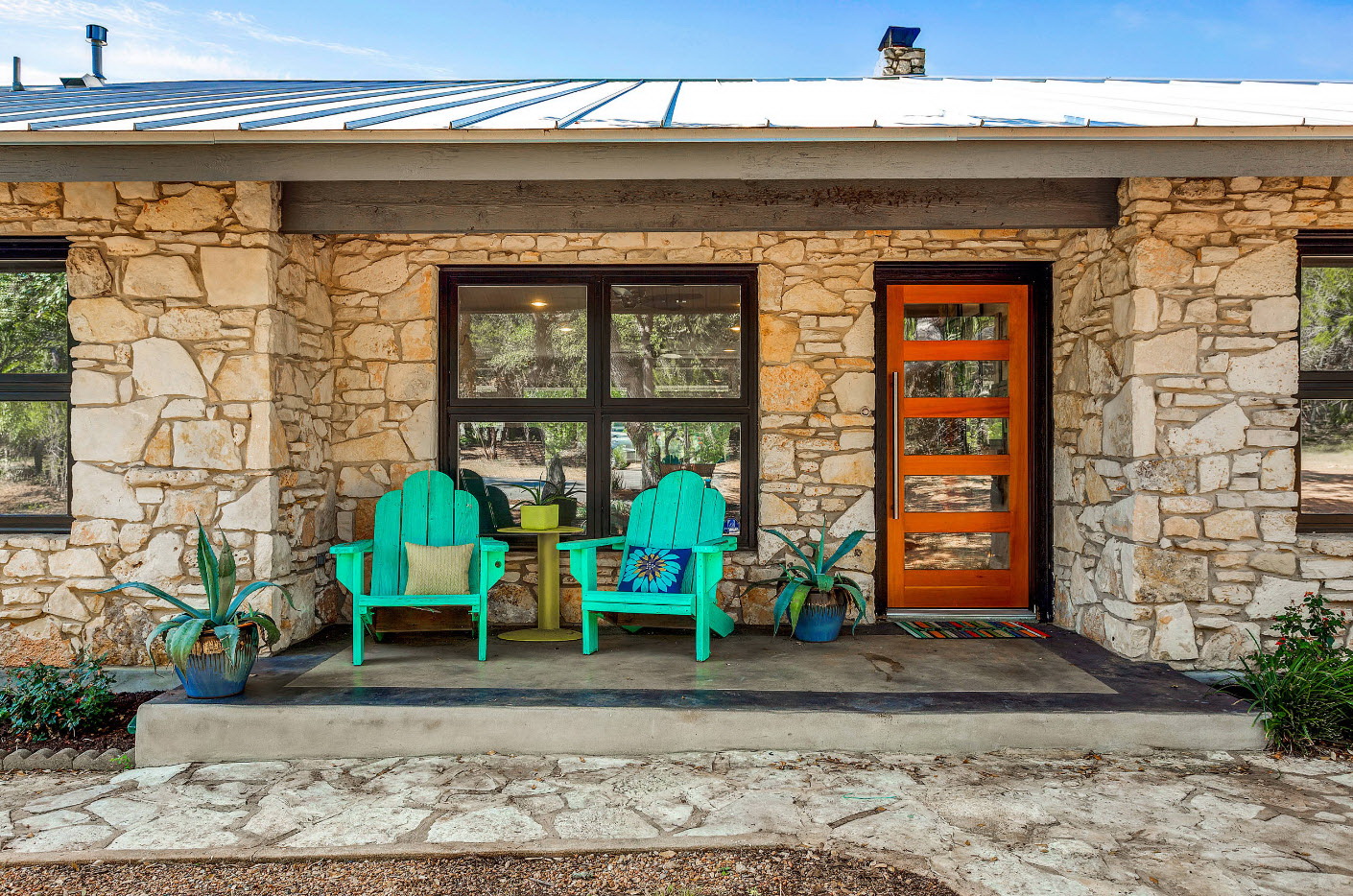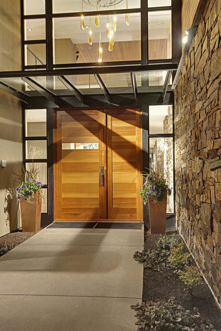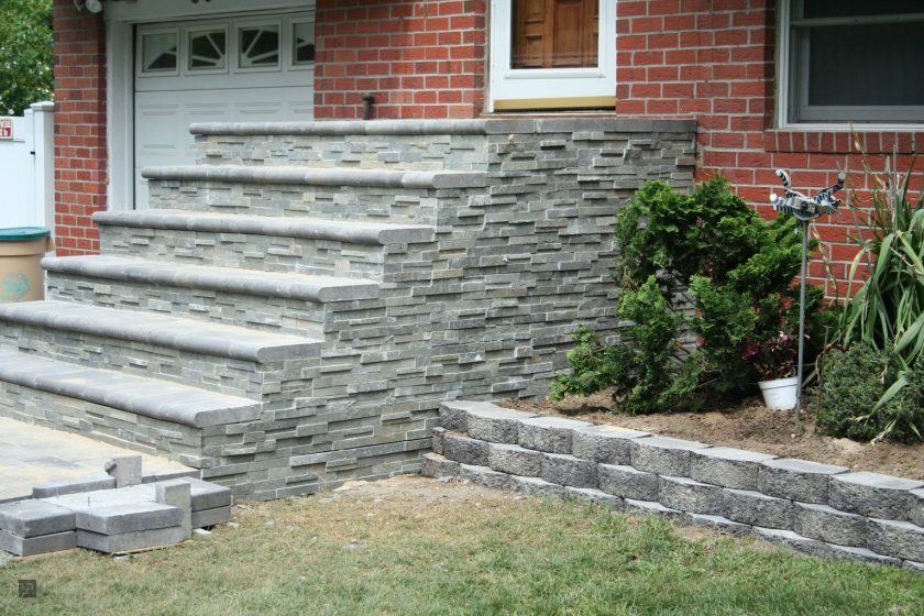 As pedras naturais são um material forte, durável e bonito. Este design tem várias variações. Excelente solução de projeto - o uso de dois tipos de pedras, uma das quais é para a base (mais cara, mais confiável), a segunda para a decoração. Esta extensão é resistente ao mau tempo, não requer cuidados especiais.