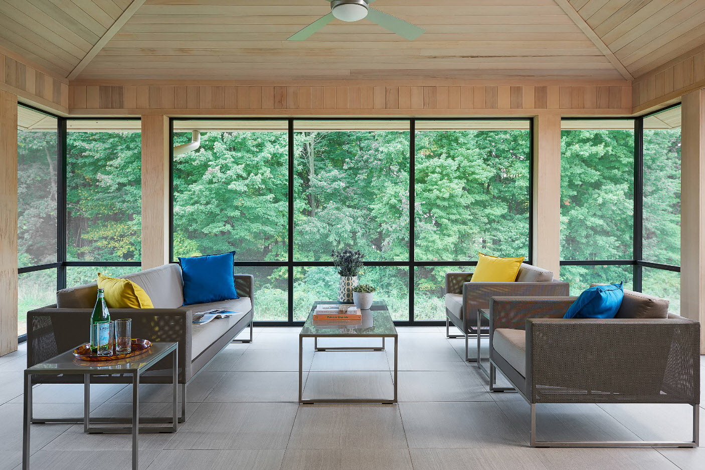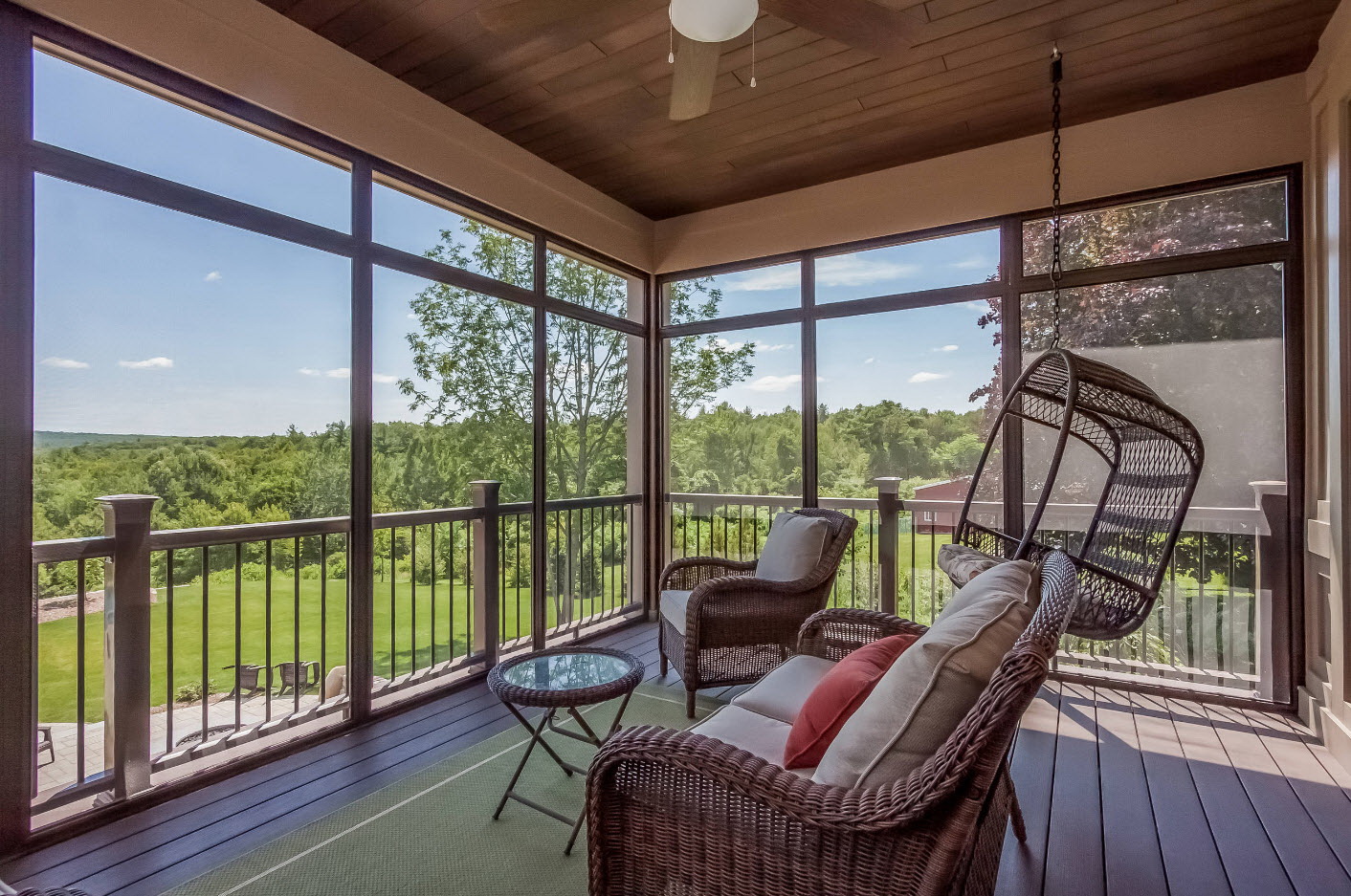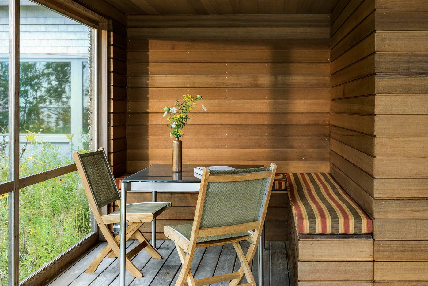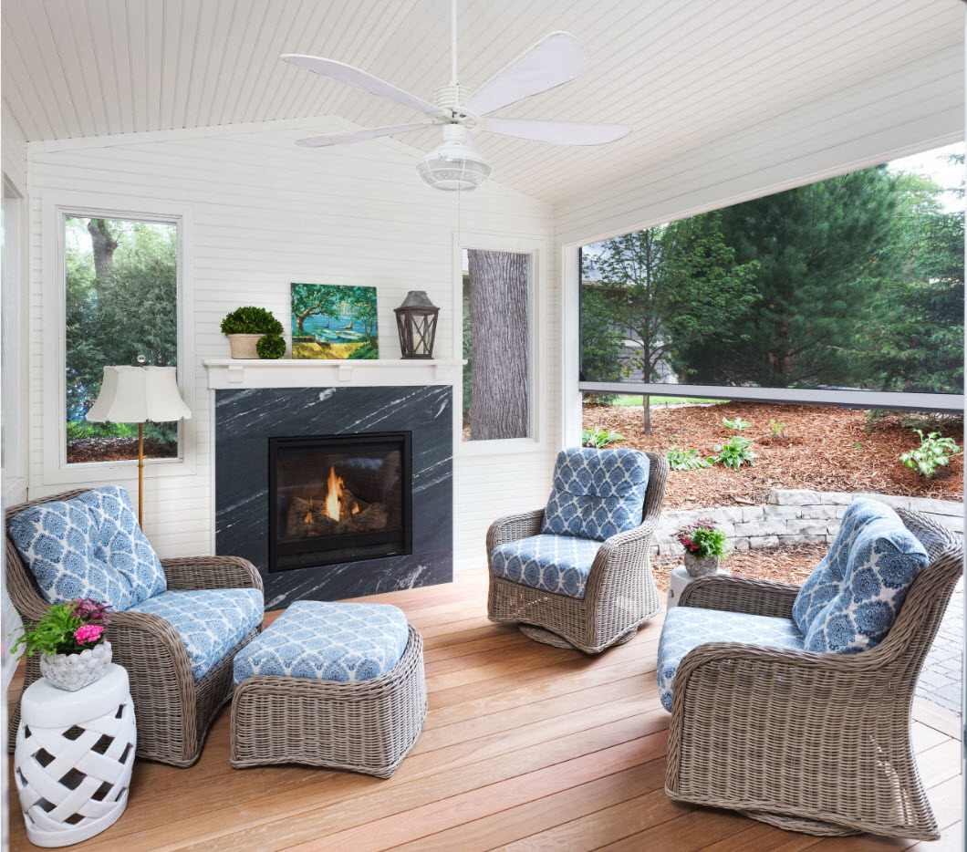 - Fechado - tem paredes transparentes ou translúcidas feitas de materiais: vidro, policarbonato, mosquiteiro. Estas viseiras fazem a entrada, o corredorFornecer um lugar para descansar em qualquer clima.