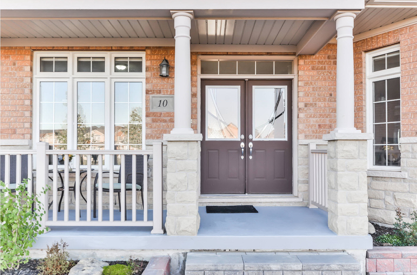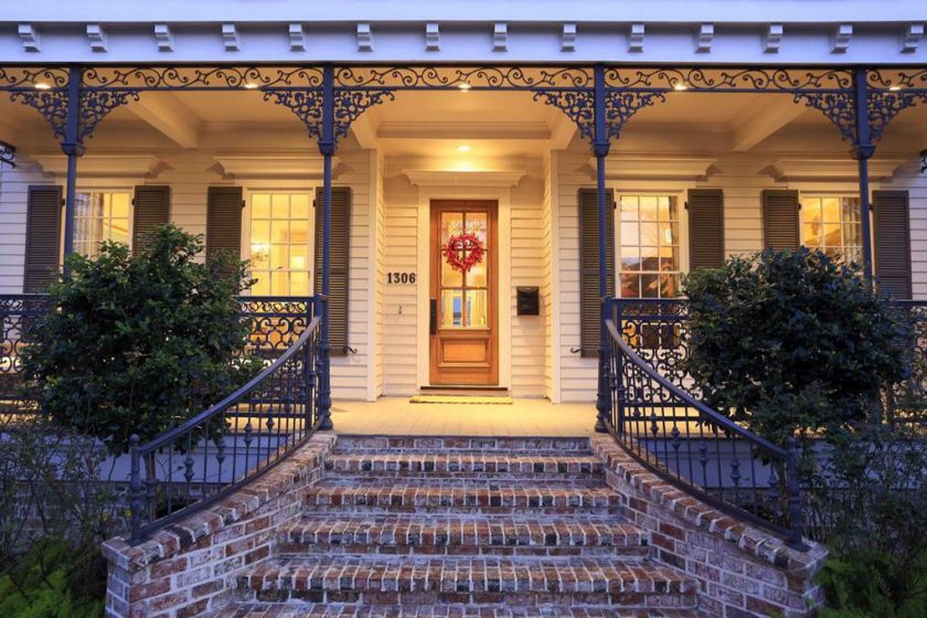 Varanda maciça adornada com pedras naturais.Partes relevantes - a presença de grades forjadas, lâmpadas, tochas. As grades podem ser decoradas com vasos de flores.