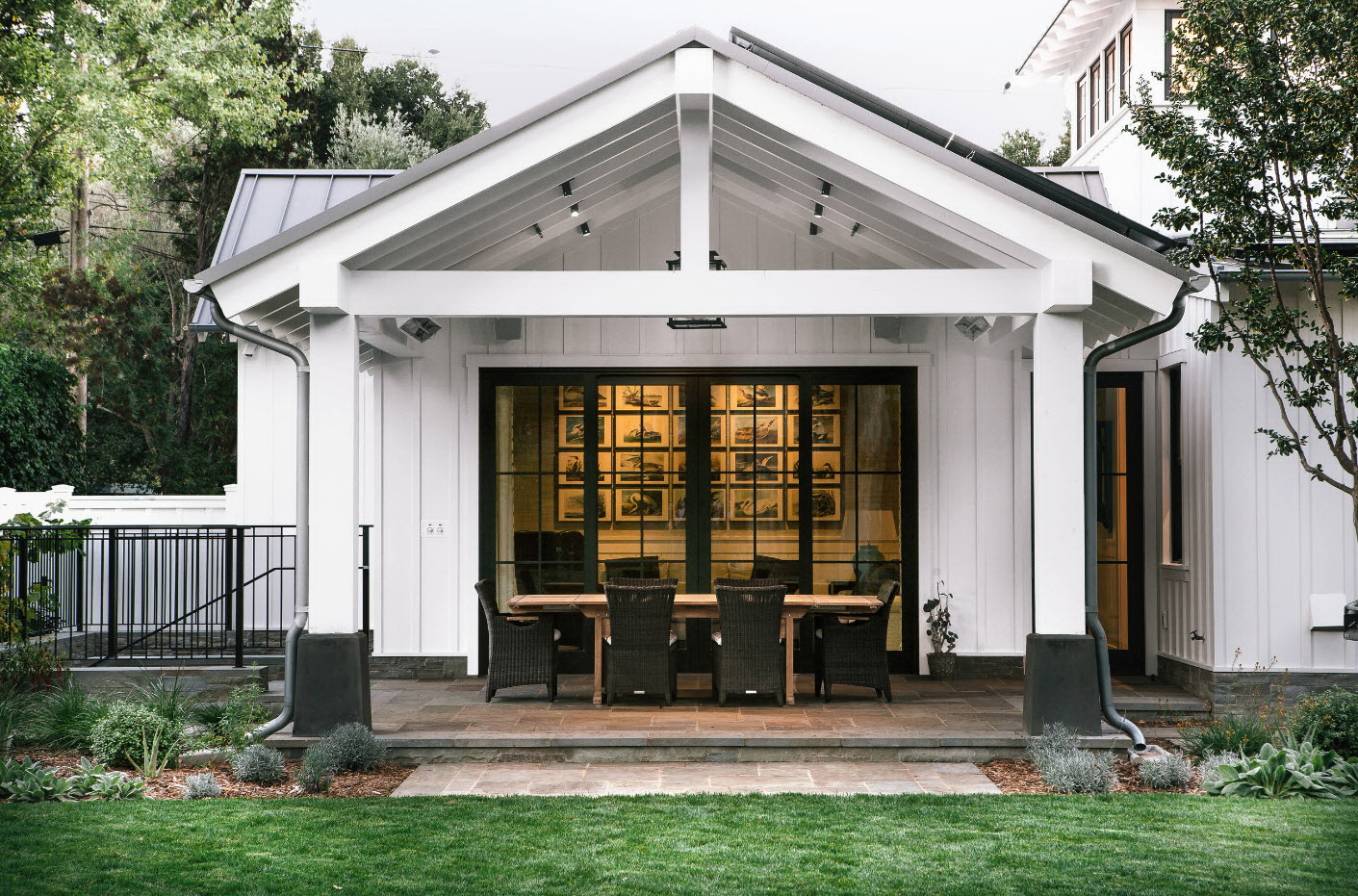 Daremos um exemplo: uma casa com um telhado de duas águas requer um alpendre de alpendre semelhante, mas se houver grades nas janelas, a grade deve ter um padrão forjado semelhante. Nenhuma exceção e o tipo de colunas, arcos, outras peças de decoração.