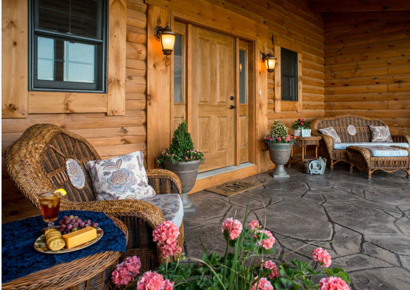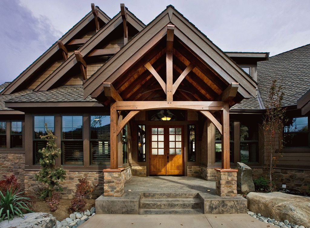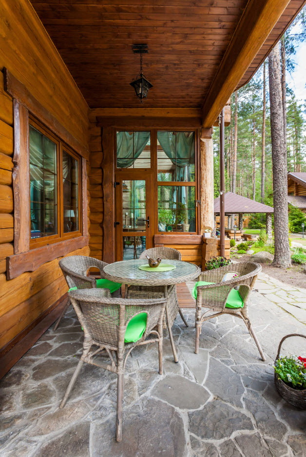 Suficiente estilo real. Esta varanda é semelhante às antigas fortalezas, que são decoradas com pedra natural. Você pode decorar a entrada principal com lâmpadas, tochas, barras de ferro forjado, troncos não cozidos.