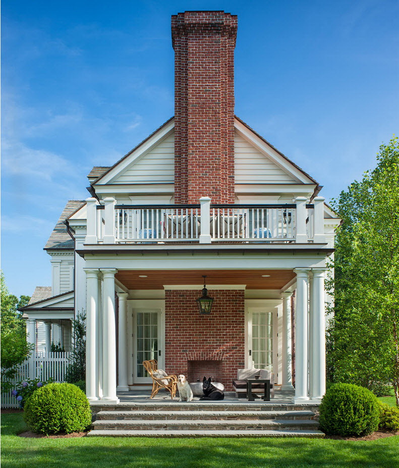 Características características - estilo restrito, restrito e moderado.. A extensão é equipada com um telhado de duas águas, pode ser complementada com belas colunas, corrimões, com balaústres arredondados. Materiais de revestimento classicismo adequado - pedras naturais, cerâmicas, madeira pintada.