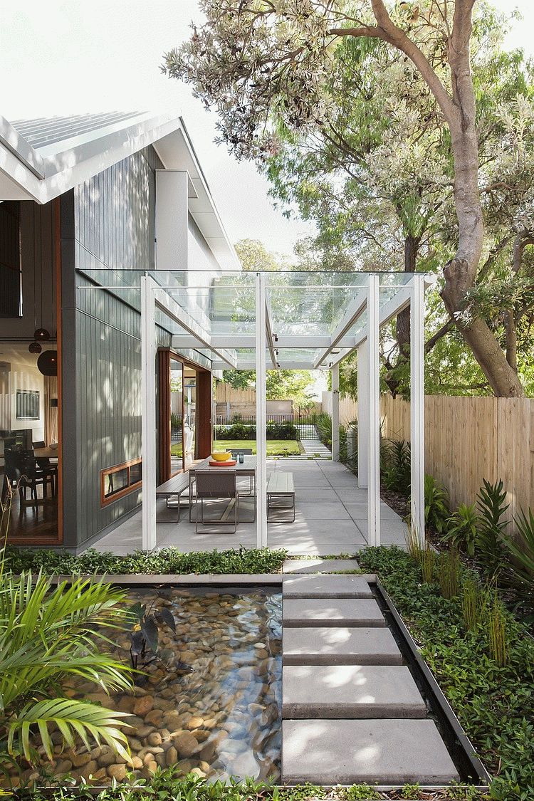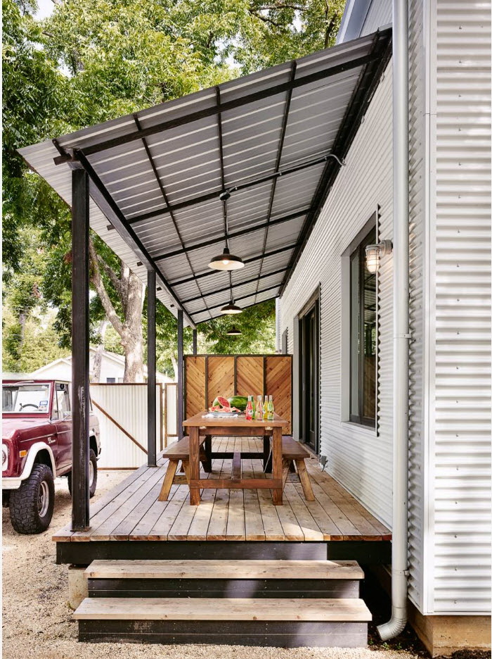 Uma pequena área suburbana, casas modestas parecem boas com uma viseira de policarbonato convencional. Refinamento irá adicionar madeira em combinação com policarbonato. Mansões enquadradas em aço - originais, sólidas. O estilo máximo vai dar tons escuros.