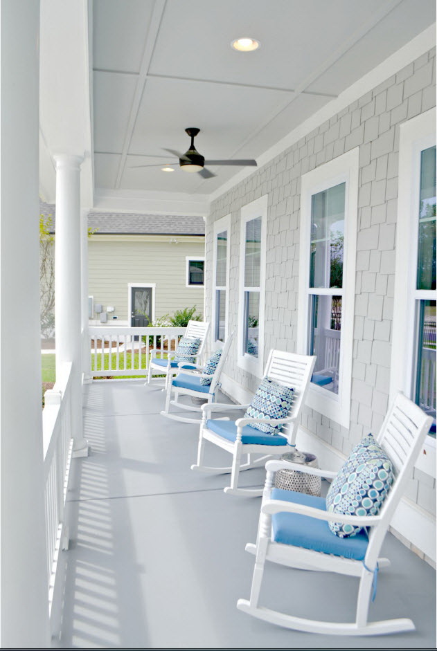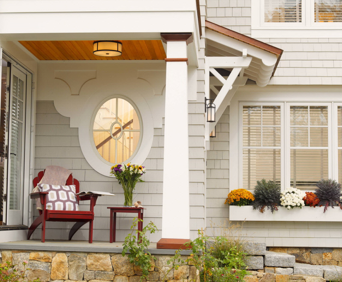 Para criar um projeto, você deve primeiro medir a área em frente à casa. Claro, na presença de um grande espaço, é melhor fazer a varandavaranda, que será um excelente protetor contra chuva, neve e também desempenhará o papel de uma área de recreação familiar. Se o lugar não é tanto como gostaríamos, uma ótima opção - uma varanda semicircular. Se você não sobrecarregar a decoração interior, a estrutura monocromática expandirá visualmente o espaço.