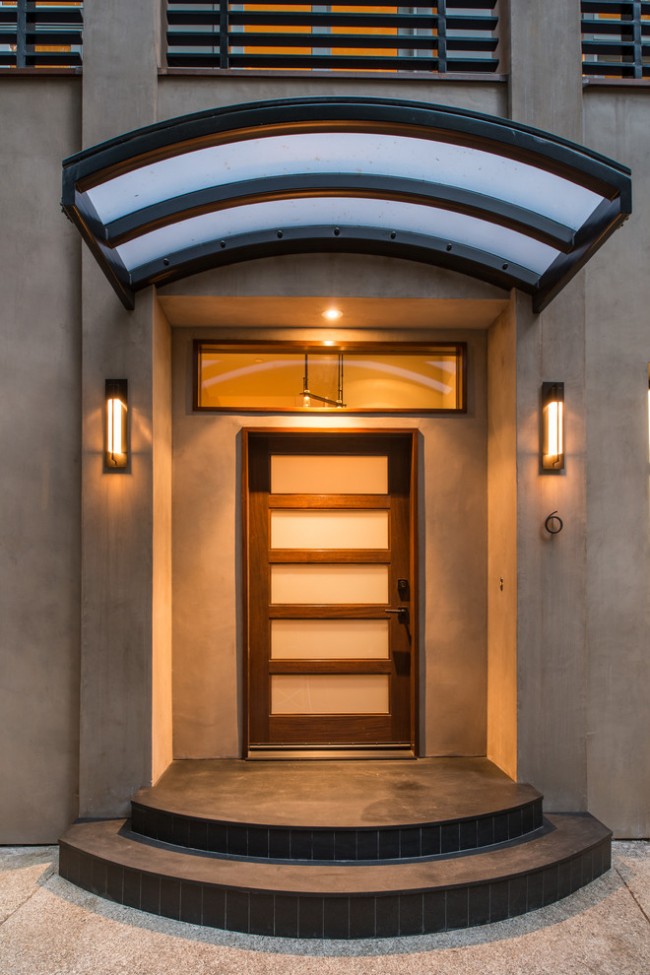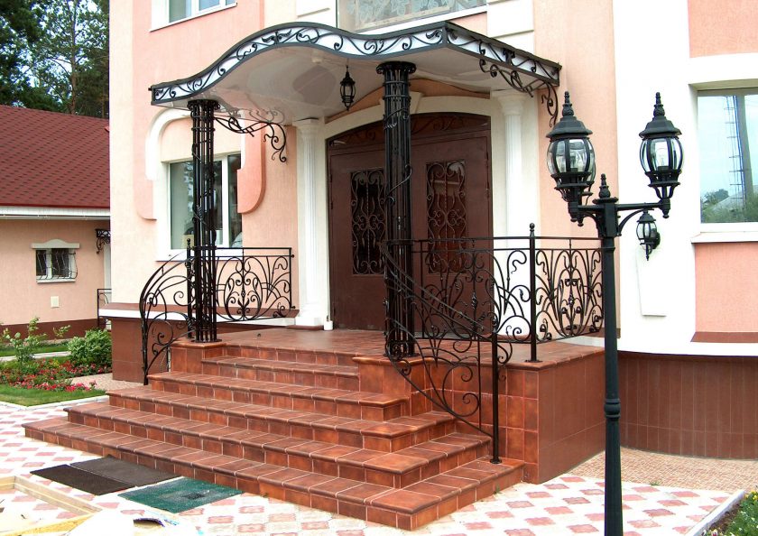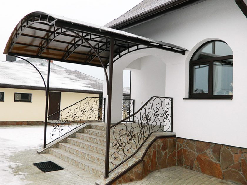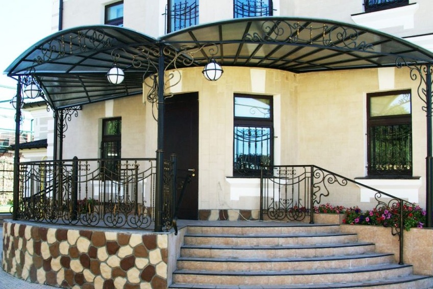 Parece ótimo tipo de dossel. Infelizmente, há pouca força aqui, você precisará encomendar o produto em oficinas especiais. Tal dossel não apenas desempenha a função de proteção, mas já é uma parte significativa do projeto. Acabamento corresponde a um único design do corrimão, plataforma, escadas. Refinamento pode ser adicionado à viseira com a ajuda de lanternas, pote montado.