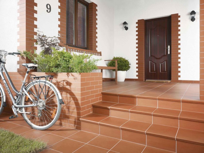 - Escadas de concreto devem ser revestidas com cerâmica, pedras naturais ou artificiais, a última opção vai economizar. Excelente opção para construções de concreto e tijolos. Recomenda-se terminar as telhas com um tipo áspero de telha (sem relevo, padrão).