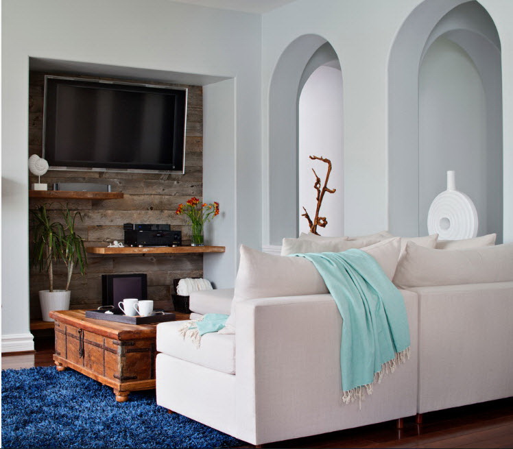 - Se a sua escolha é um conforto tradicional clássico e permanente, então a sua escolha é uma enorme prateleira de madeira de forma retangular, redonda ou quadrada. Ficará bem tanto na sua forma pura como com decorações, por exemplo, com fio.
