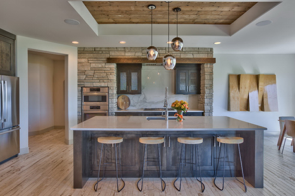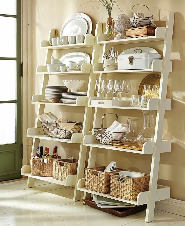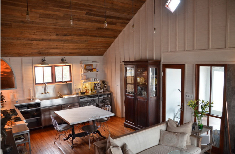 Portanto, as prateleiras estão presas à parede, geralmente com uma altura do chão até o teto, ou levemente mais baixas. Pode parecer um lado escadastal decisão de projeto permitirá diversificar o estilo da cozinha, afastar-se dos padrões e tradições. Sua única desvantagem é que as prateleiras ocupam espaço de cima para baixo, portanto, exigem espaço adicional. Mas vai ter equipamento de cozinha suficiente. No entanto, esta não é a opção mais popular.