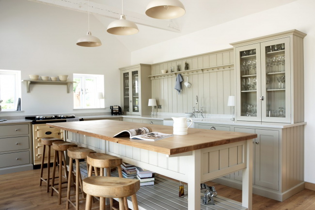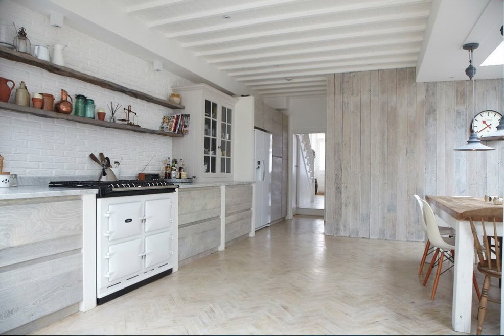 Recentemente, considera-se que tudo - este é o último século. Todo o espaço da cozinha é ocupado por armários e prateleiras convenientes. Na verdade, móveis de madeira estão de volta à moda. A uniformidade de armários idênticos torna a cozinha sem graça, monótona, e uma prateleira no canto da sala armazena utensílios de cozinha e parece boa.