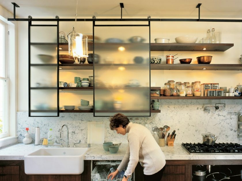 - Prateleiras com prateleiras de vidro ou fechadas - prateleiras fechadas são como armários, apenas muito menores. Se no espaço aberto pudermos guardar com segurança potes e outros utensílios, você pode colocar nas prateleiras com uma porta que eles estavam com medo ou úmidos. Lá você também pode colocar a louça festiva (se a porta é de vidro), decorar a cozinha.