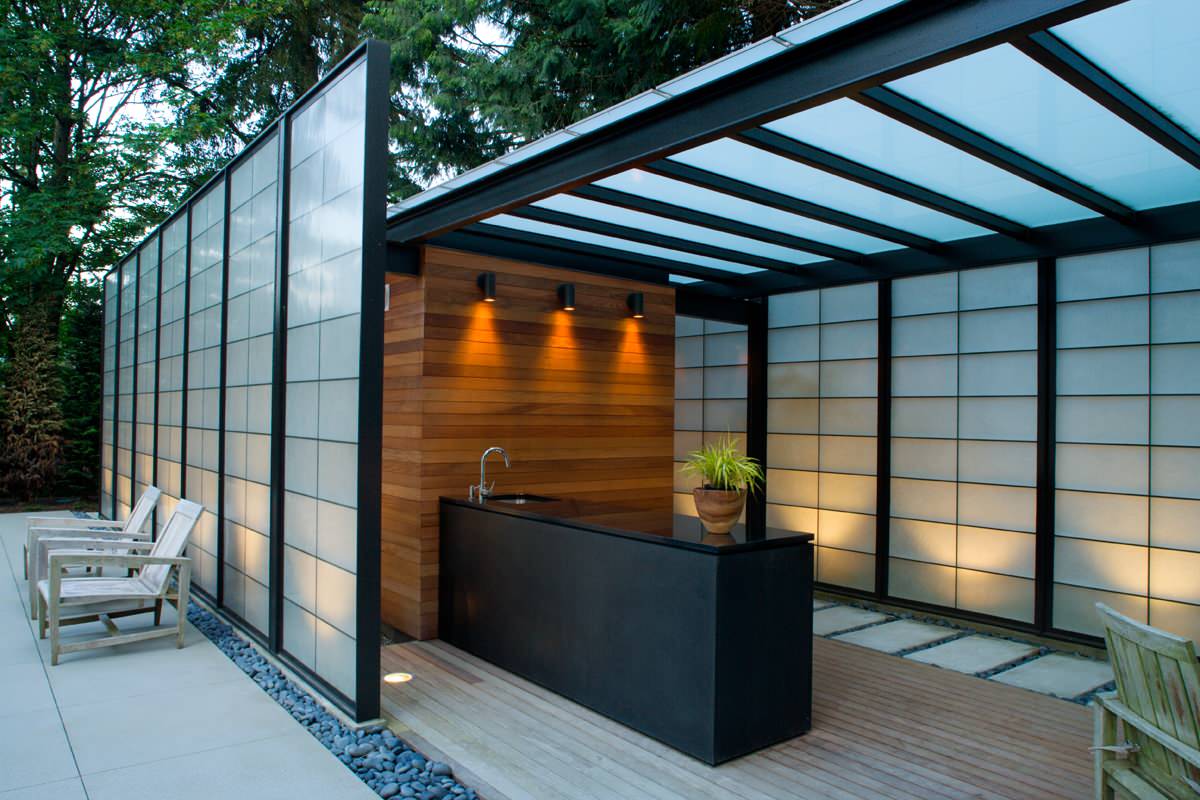 - Paredes na cozinha aberta. Na cozinha aberta, eles estão praticamente ausentes - há postos de sustentação ou uma grade, que desempenha principalmente uma função estética. Porque eles não precisam terminar. A única coisa que você precisa pensar - o que a cozinha vai fechar em caso de chuva? Você pode pendurar rolo à prova d 'água cortinas, coloque as paredes deslizantes.